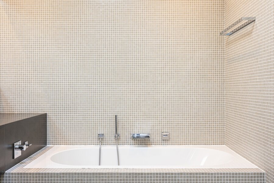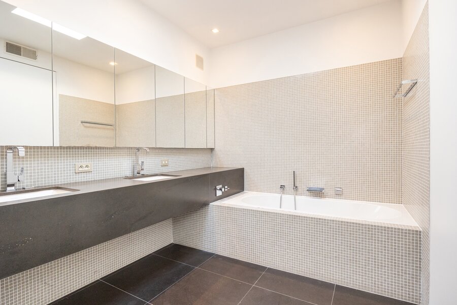 De badkamer kan langs 2 zijden betreden worden en beschikt over een bad, een dubbele lavabo, een toilet, een grote inloopdouche en een 3e aparte lavabo.