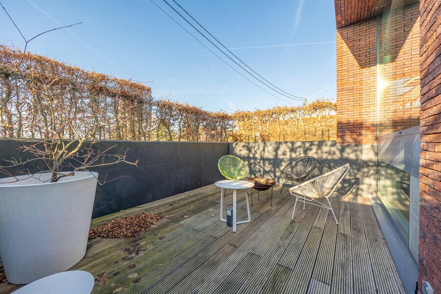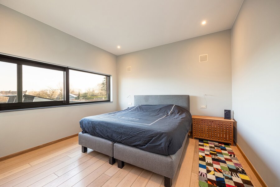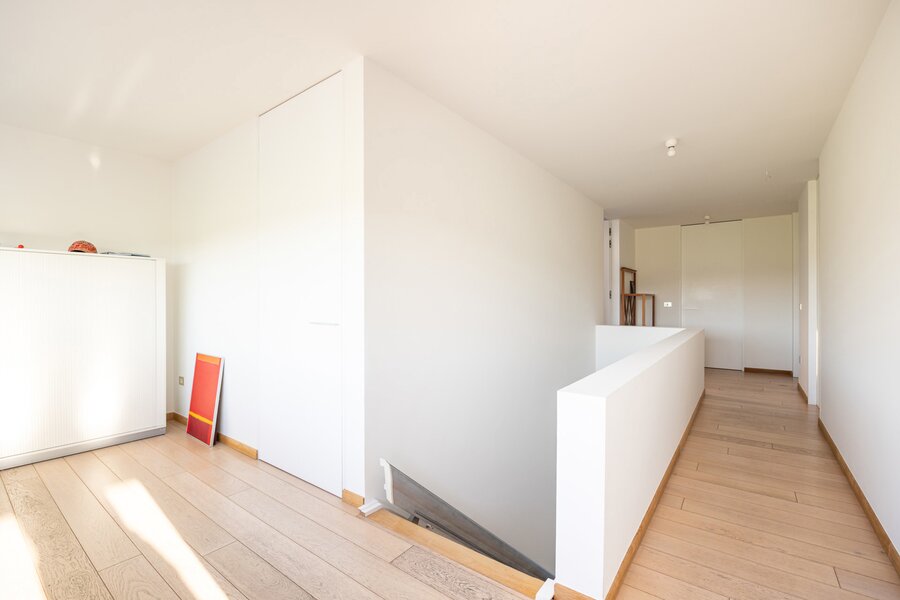 Vanuit de living brengt een strakke trap je naar de verdieping.