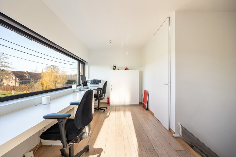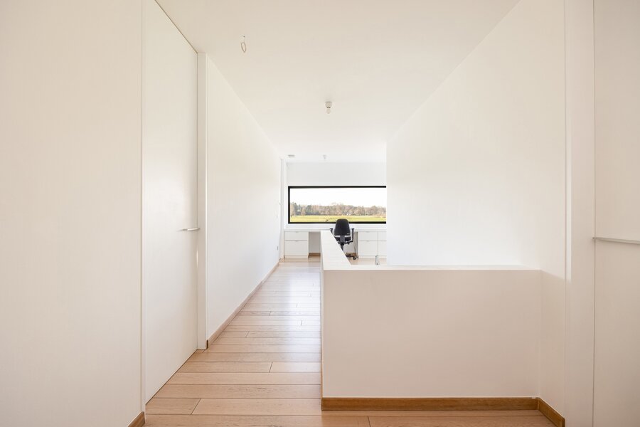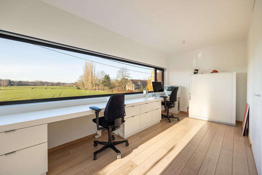 Op de overloop werd een thuiskantoor ingericht met parchtig zicht op de velden.