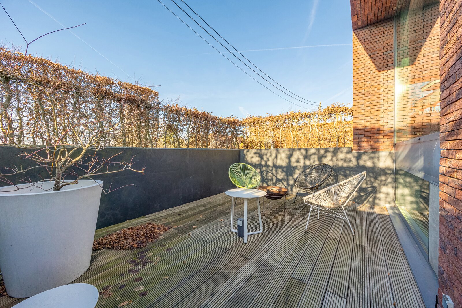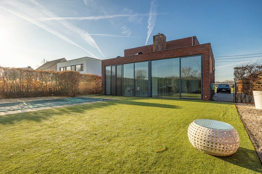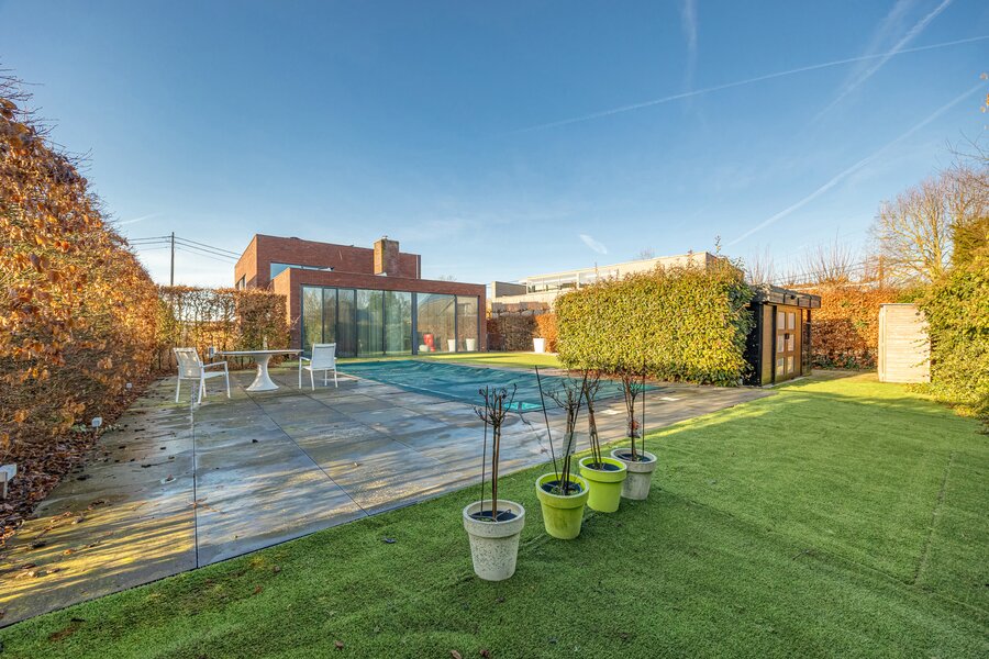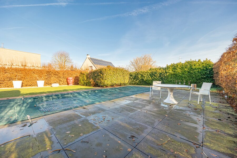De tuin tenslotte omgeeft de hele woning. Er zijn op 2 plaatsen terrassen voorzien en het zwembad zorgt voor zomers waterplezier.