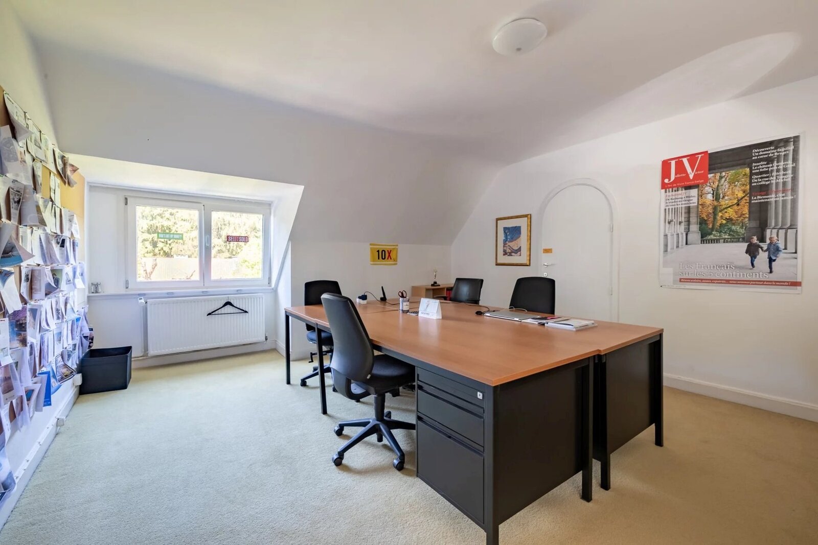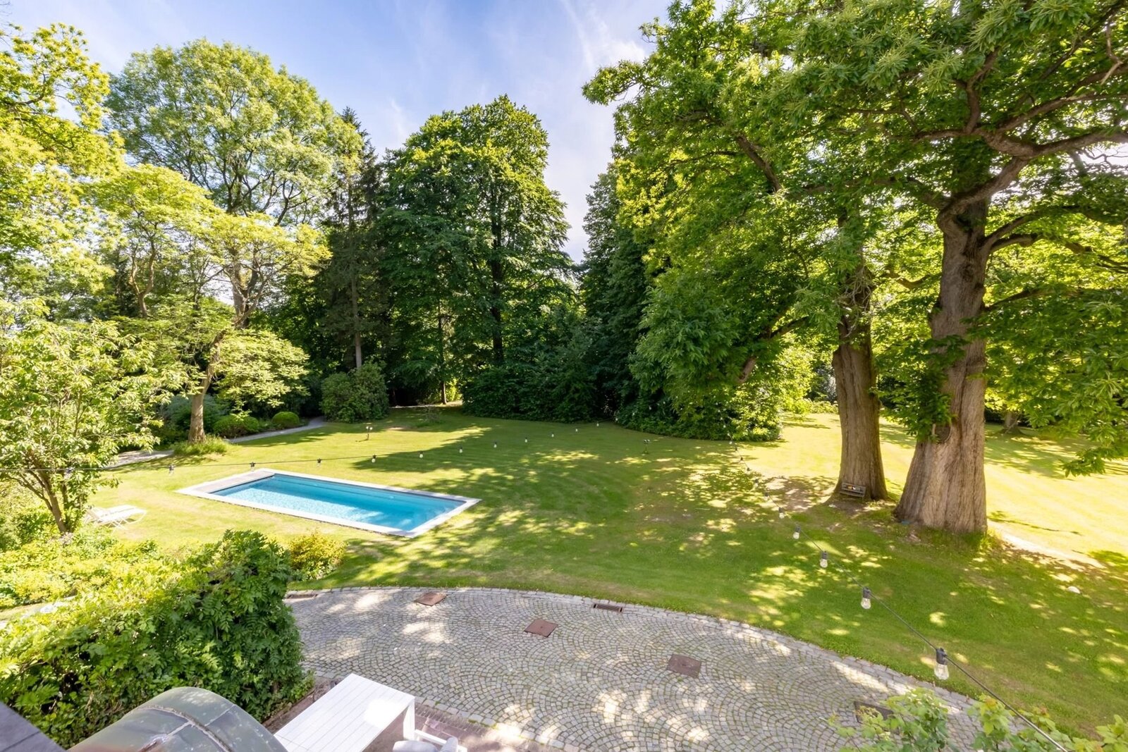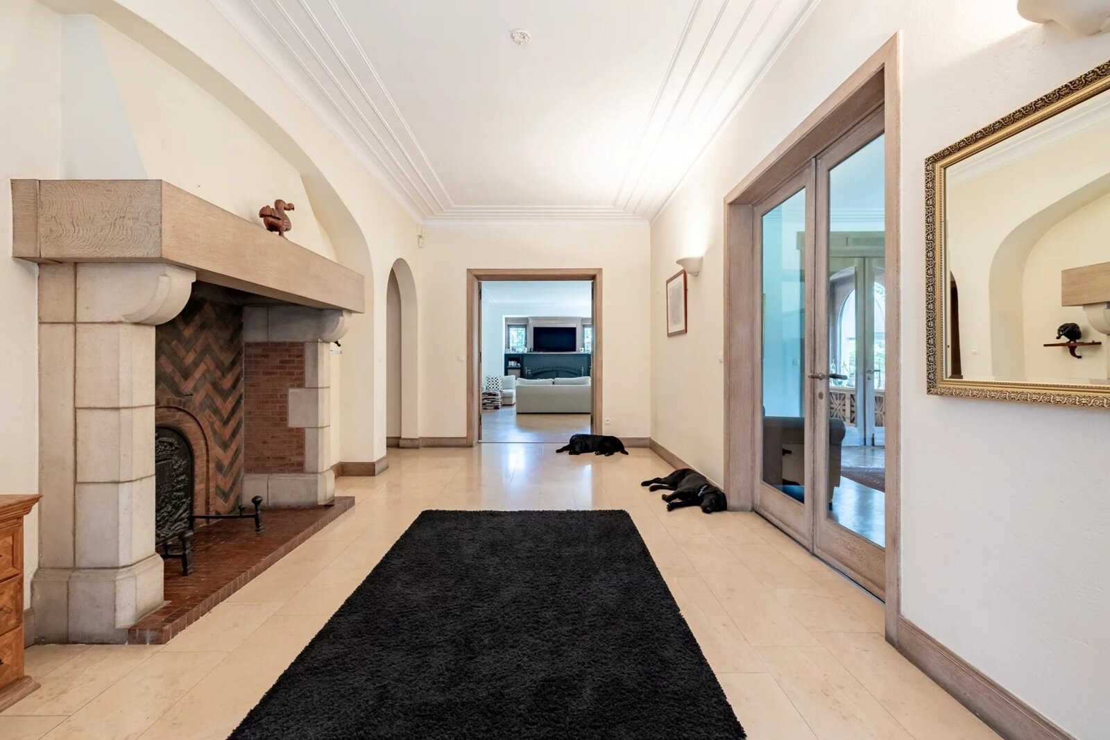 Op de begane grond is er een ruime inkomhal met open haard, vestiaire en gastentoilet, een bibliotheek, een salon met een tweede open haard, een volledig uitgeruste open keuken met ontbijthoek, een achterkeuken, een garage voor drie voertuigen, een dienstingang, drie kantoren, een dienstkeuken en extra sanitaire voorzieningen.
