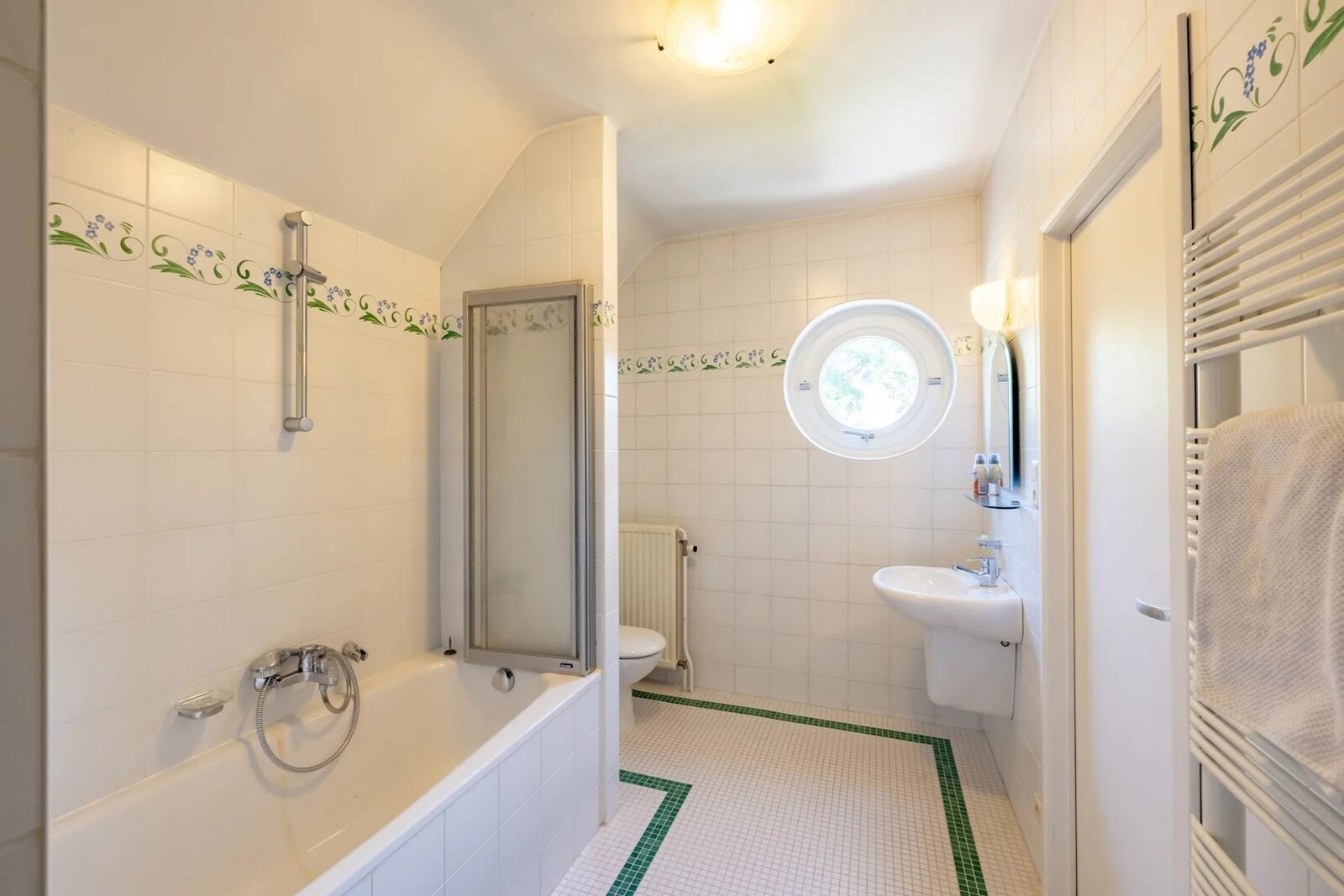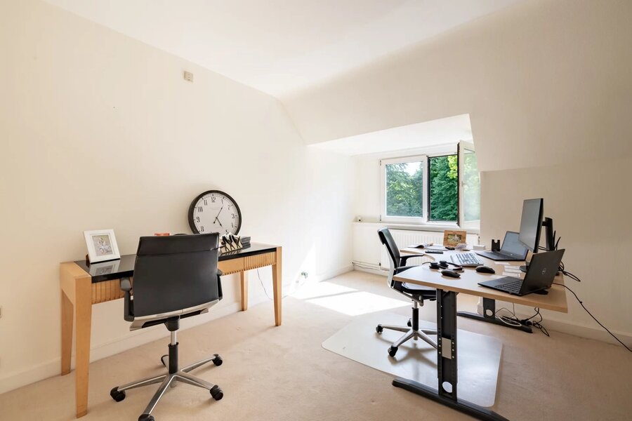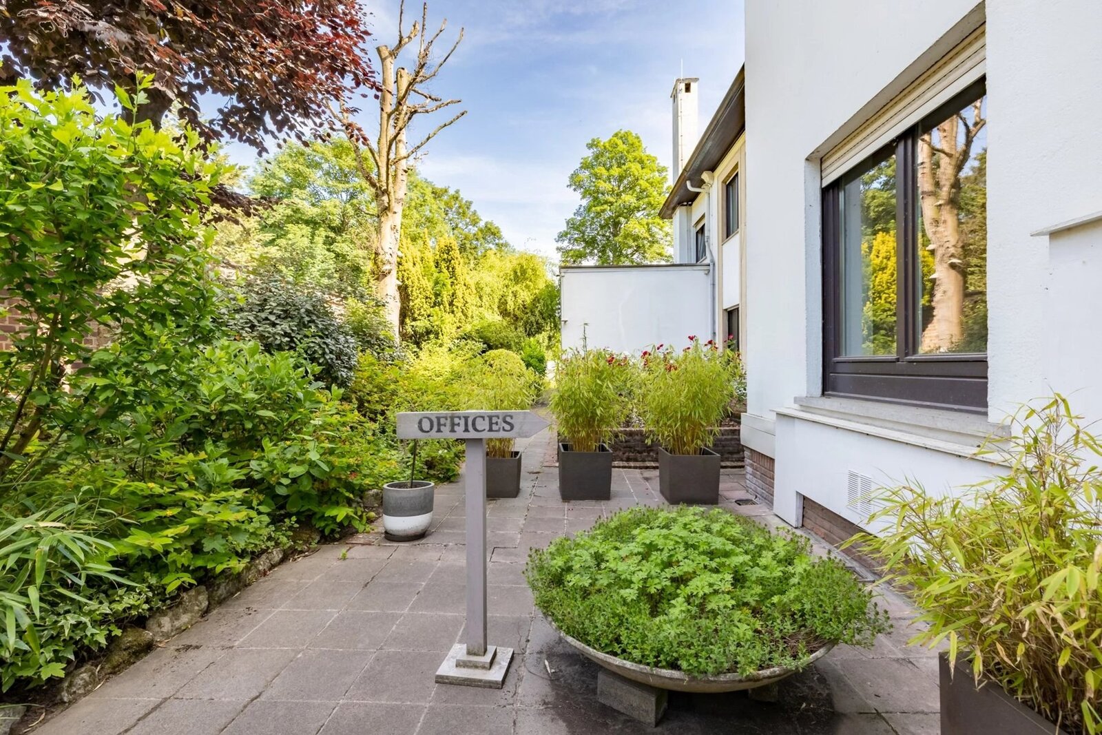 Op de begane grond is er een ruime inkomhal met open haard, vestiaire en gastentoilet, een bibliotheek, een salon met een tweede open haard, een volledig uitgeruste open keuken met ontbijthoek, een achterkeuken, een garage voor drie voertuigen, een dienstingang, drie kantoren, een dienstkeuken en extra sanitaire voorzieningen.