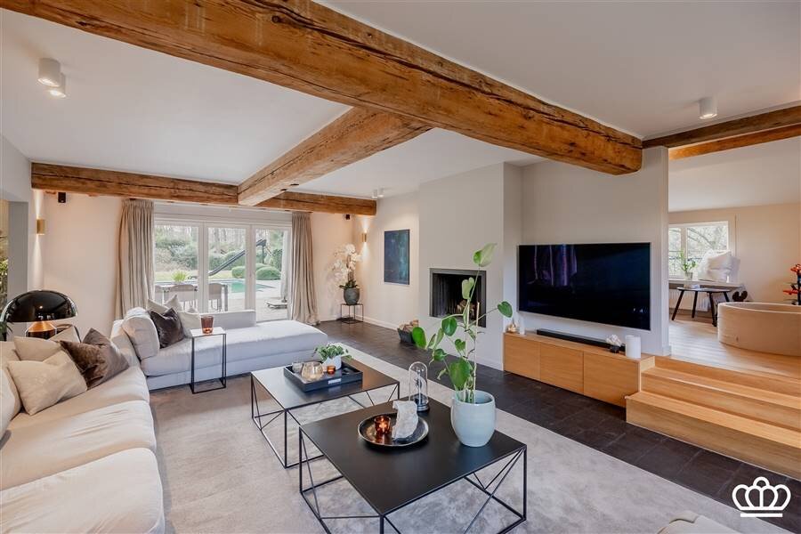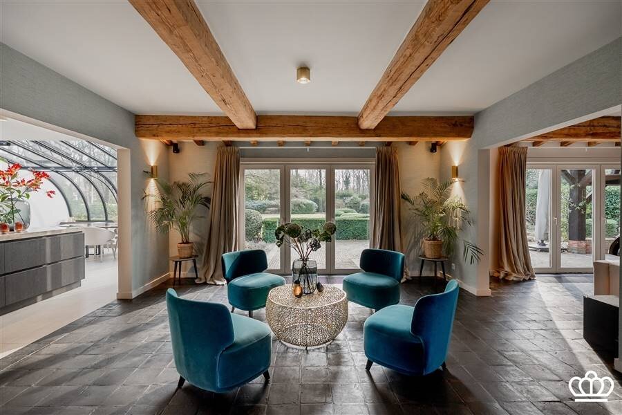 Bij het binnenkomen betreedt u de inkomhal op tegelvloer, voorzien van een vestiaire en een gastentoilet met handenwasser. Via dubbele glazen stalen deuren bereikt u de sfeervolle cocktail room met ingemaakte kasten. Vanuit hier heeft u toegang tot de leefruimte, eveneens op tegelvloer, met ruime zit- en tv-hoek en een open haard. Aansluitend bevindt zich een verhoogde bureauruimte op parket, momenteel ingericht als speelruimte. Verder is er een kwalitatief ingerichte leefkeuken met ruim kookeiland en een prachtige orangerie waarin de eethoek is ondergebracht. Vanuit alle ruimtes op het gelijkvloers geniet u van een aangenaam zicht op het groen en de fraai aangelegde tuin. De keuken is voorzien van een ontbijthoek en alle ingebouwde toestellen, waaronder een spoelbak, inductiekookplaat met down-draft dampkap, wijnkoelkast, koelkast, combi-oven, stoomoven en vaatwasser. Aansluitend is er een bijkeuken met ingemaakte kasten, combi-microgolfoven, oven, ingebouwde vriezer, wasbak en voorzieningen voor wasmachine en droogkast op hoogte. Hier bevindt zich tevens de technische installatie van het zwembad. Verder beschikt u over een dubbele inpandige garage.