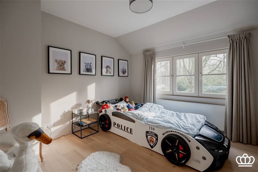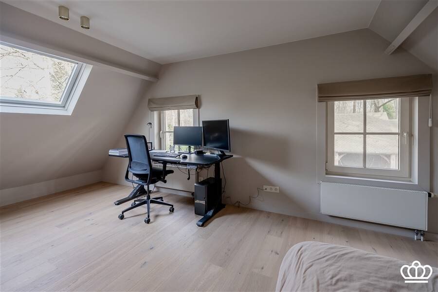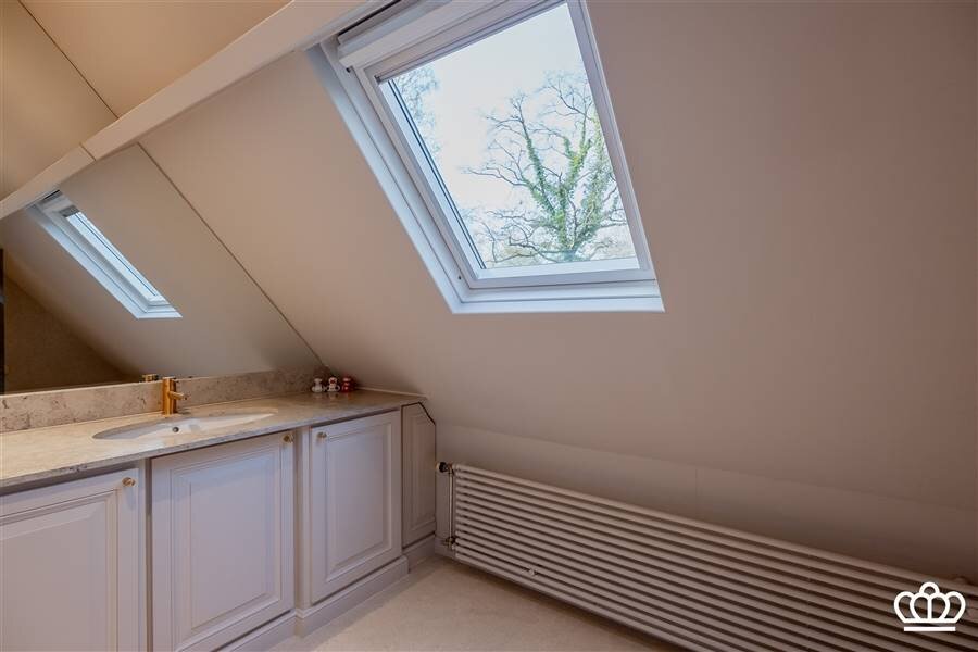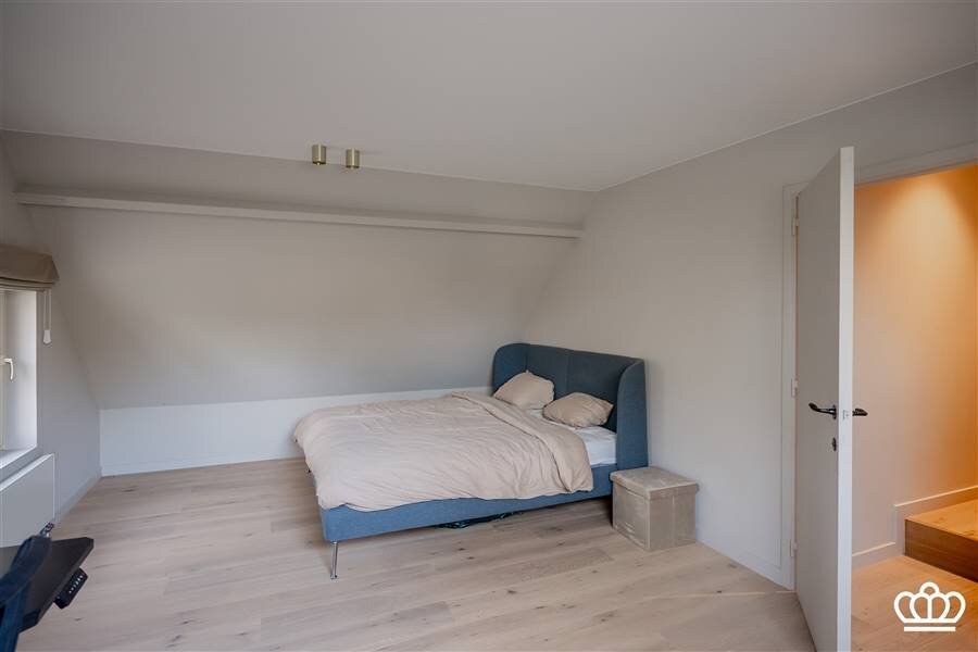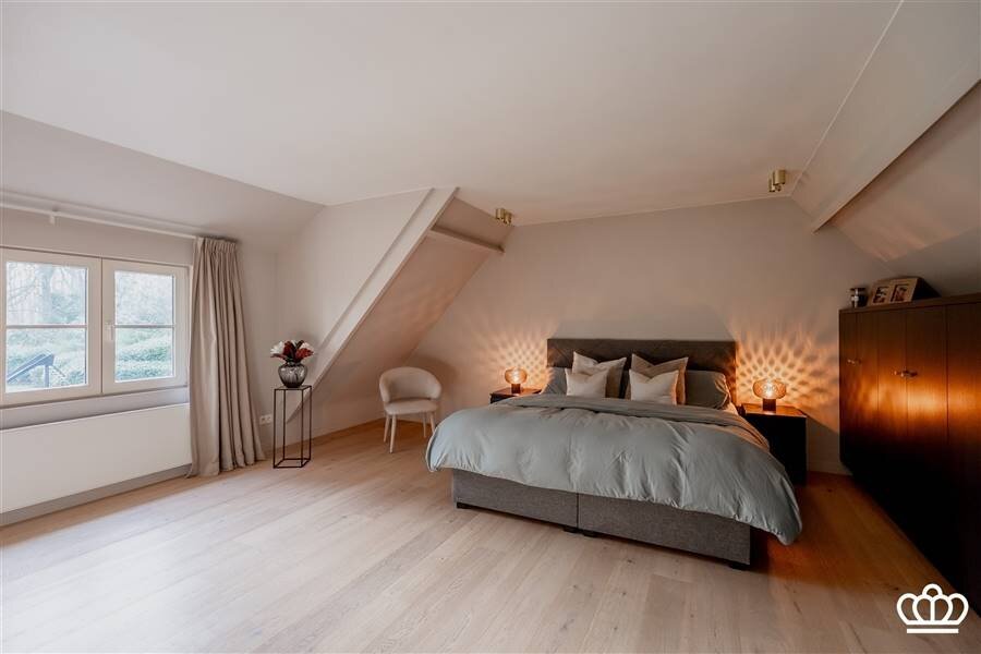 Via de houten trap bereikt u de nachthal. De master bedroom op parketvloer beschikt over ingemaakte kasten en een ensuite badkamer met dubbele regendouche en dubbele wastafel, aangevuld met een dressing. Daarnaast zijn er nog twee slaapkamers, eveneens op parketvloer, waarvan één met ingemaakte kasten. De tweede badkamer is voorzien van een ligbad. Op deze verdieping is er ook een apart toilet.