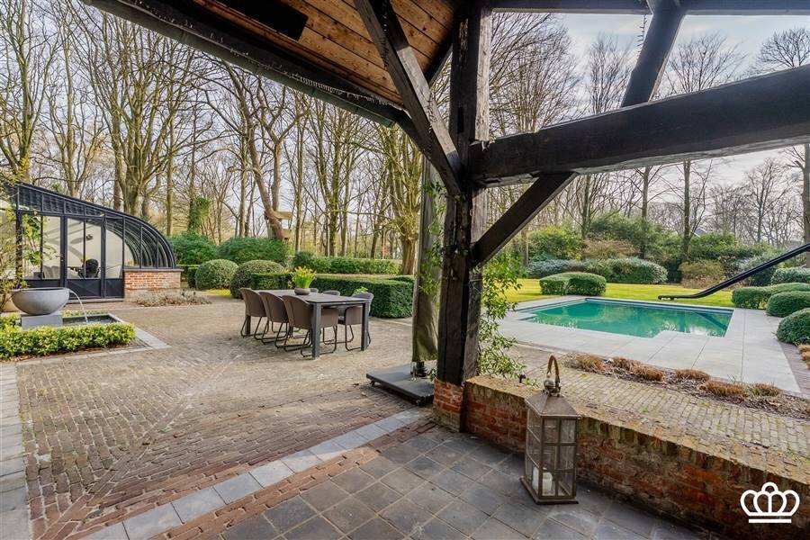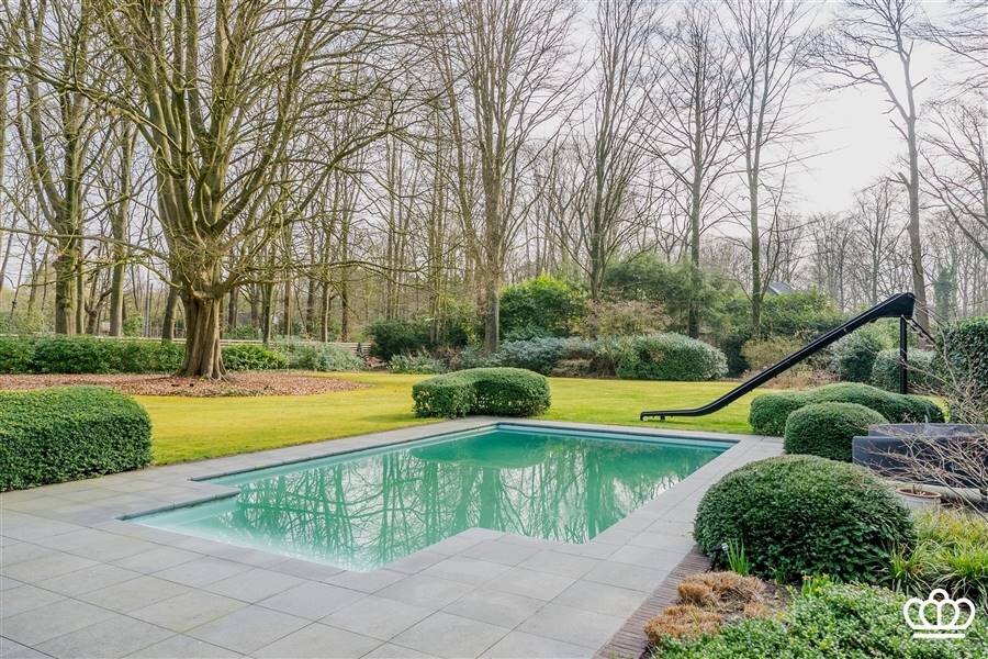 De villa is gelegen op een zuidwest geörienteerd perceel van ca. 4.577 m² met een unieke bomenstand en veel privacy. Via de ruime kasseioprijlaan bereikt u zowel het eikenhouten bijgebouw met carport voor drie wagens en tuinberging, als de dubbele inpandige garage. Achteraan geniet u van een ruim open terras, een overdekt houten terras en een fraai aangelegde tuin voorzien van een verwarmd zwembad met warmtepomp.