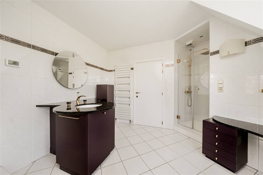 Deze woning onderscheidt zich door haar hoogwaardige afwerking: parketvloeren, verfijnde gouden kranen en spots, kwaliteitsvol sanitair van Villeroy & Boch en een sfeervolle gashaard.