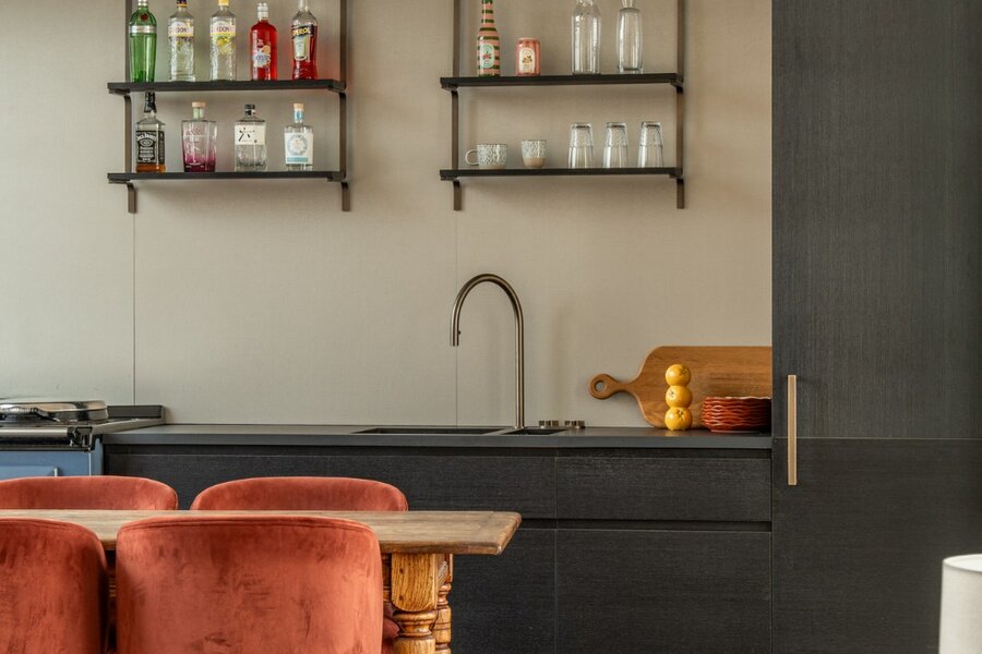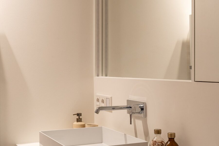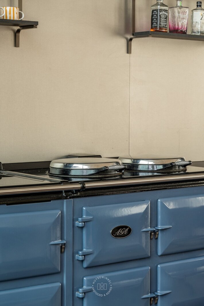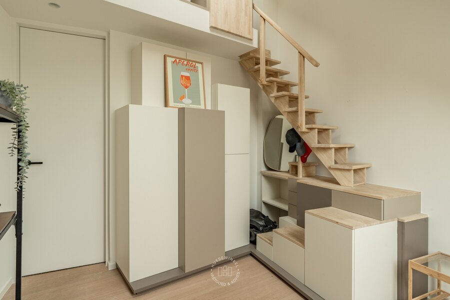 De hal van het appartement, voorzien van praktische berging en gastentoilet, geeft toegang tot de imposante leefruimte. Opmerkelijk is de unieke plafondhoogte in combinatie met diverse raampartijen en terrassen waardoor u naast een open zicht geniet van heel wat lichtinval. De open keuken van Obumex is elegant ingewerkt in de imposante leefruimte. Deze maatwerk keuken is geëquipeerd met kwalitatieve toestellen waaronder een AGA vuur. Hier is eveneens plaats voor een omvangrijke tafel waardoor u comfortabel kan dineren en entertainen. Palende aan de keuken is er het dakterras van ca 14 m² met uitzicht richting het historisch centrum. De royale leefruimte heeft eveneens een balkonterras waar u in alle rust kan genieten van het zicht op de jachthaven, Lindelei.