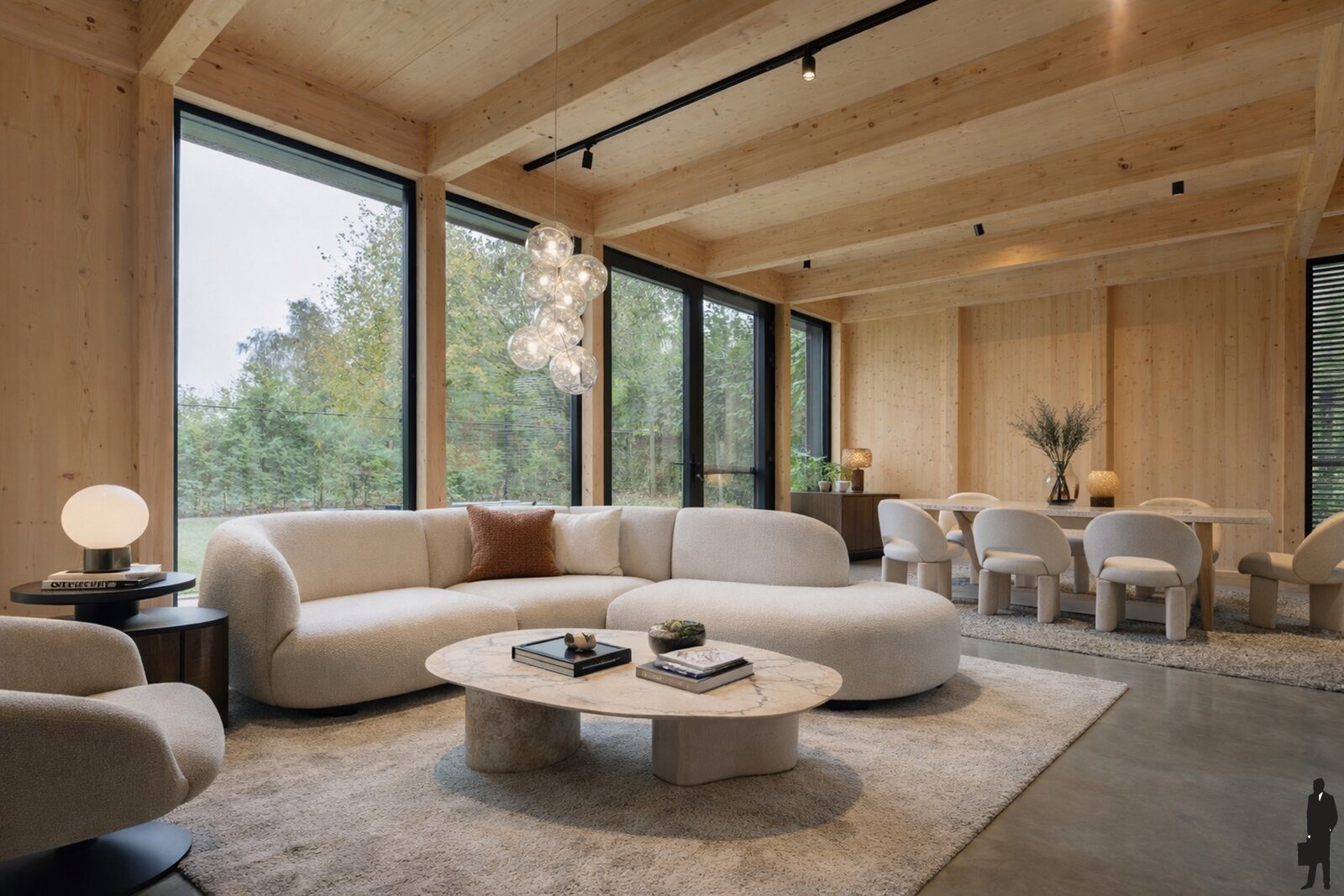 U betreedt de woning via de inkomhal met vestiaire en gastentoilet. Vervolgens stapt u binnen in de lichte en open leefruimte, waar moderne architectuur en natuurlijke (houten) elementen samenkomen. De grote ramen zorgen voor een overvloed aan natuurlijk licht en creëren - in combinatie met de houten structuren - tegelijk een warme, uitnodigende sfeer. Het hart van de woning is de woonkamer die naadloos overgaat in de moderne leefkeuken met aanpalende koele berging. Deze keuken is volledig uitgerust met hoogwaardige inbouwapparatuur en een handig en ruim kookeiland. De lichte leefruimte geeft bovendien toegang tot het zuidoost georiënteerde terras. Dit is de ideale plek om vrienden en familie te ontvangen en te genieten van gezellige avonden.
