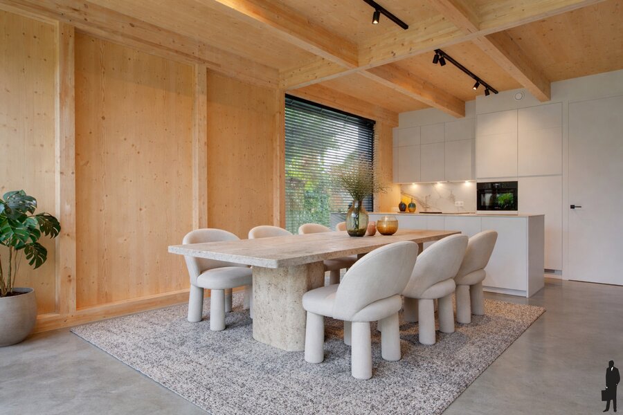 Dit unieke, ecologische project werd gebouwd naar een ontwerp van het vermaarde architectenbureau AIM (Architects In Motion) en bestaat in totaal uit 5 circulaire nieuwbouwwoningen. De basis is houtbouw, gecombineerd met een afwerking met CircuWallPanels en Equitone gevelpanelen. Voor de gevels, daken en vloeren zijn uitsluitend ecologische materialen gebruikt, en het hout springt zowel binnen als buiten in het oog, met als resultaat een warm en eigentijds ontwerp. Deze woningen zijn klaar voor de toekomst en uiterst elegant en stijlvolt afgewerkt. Geavanceerde technieken bij de isolatie, warmtepompen, zonnepanelen, etc. zorgen voor een maximum E-peil van 30.