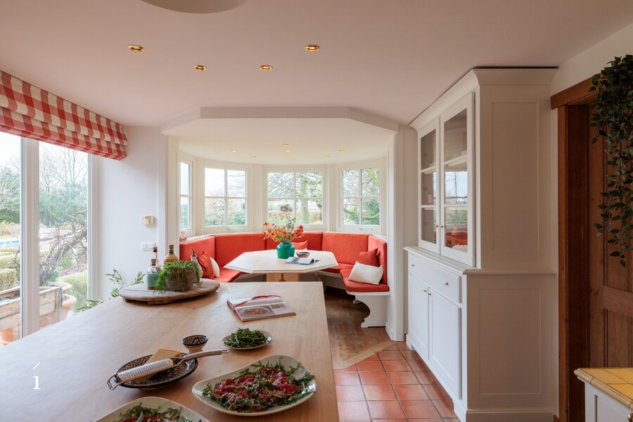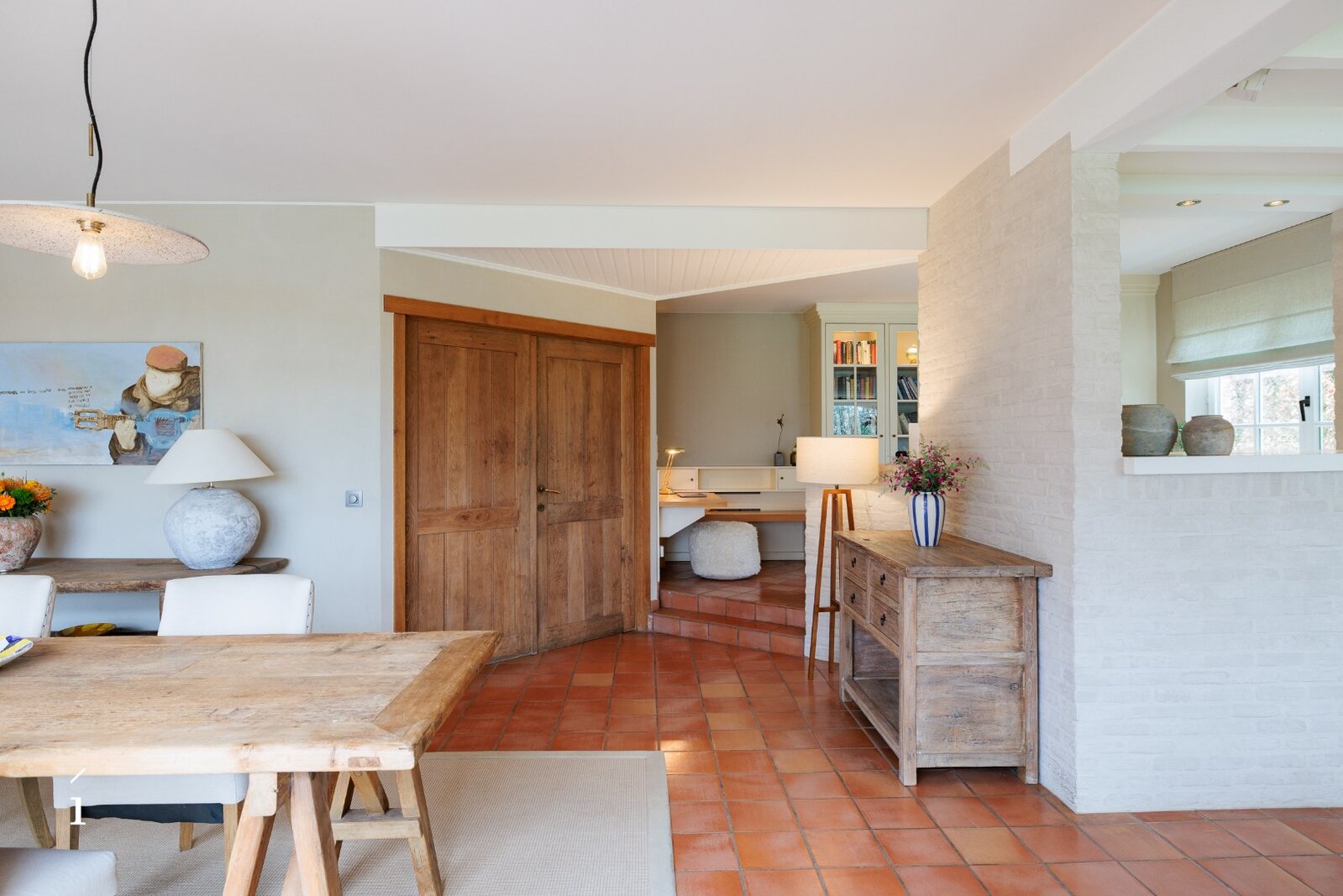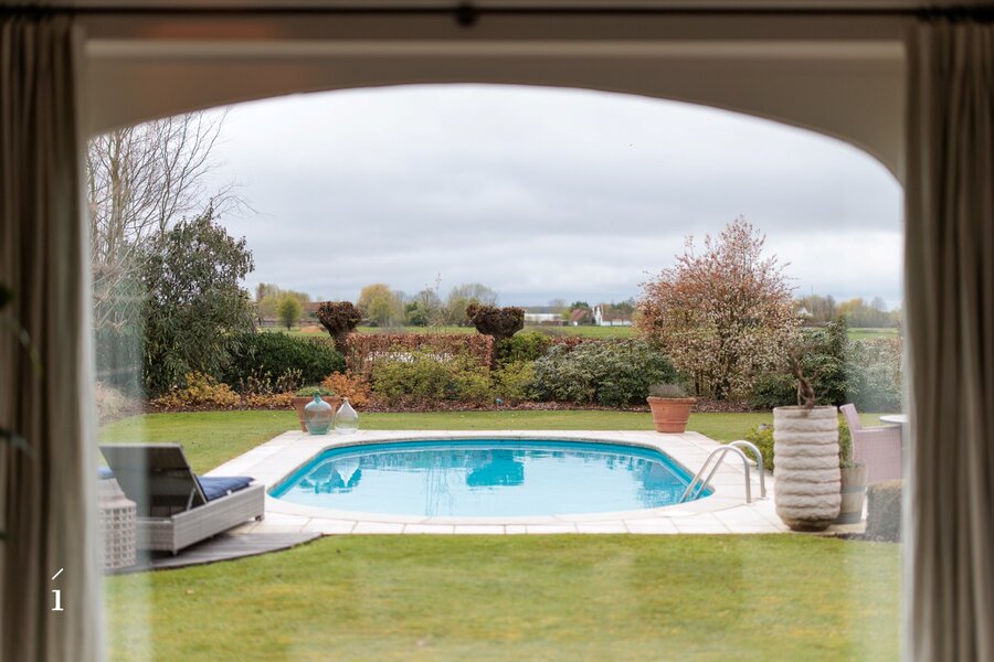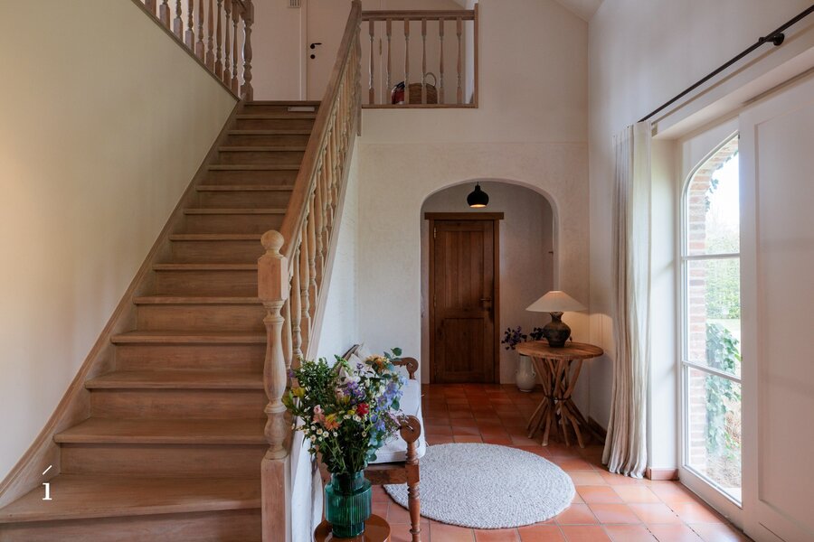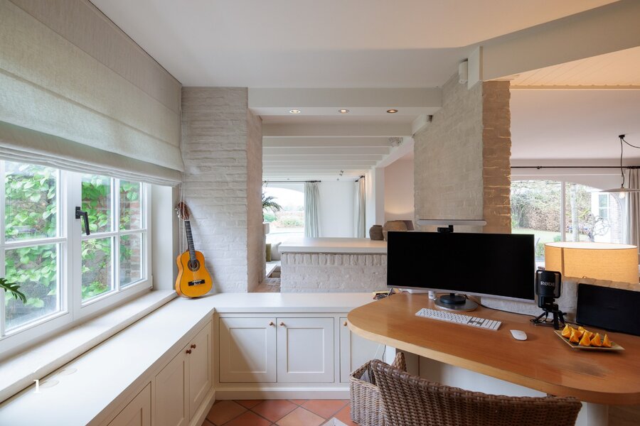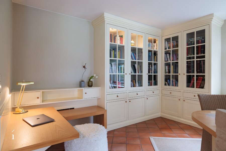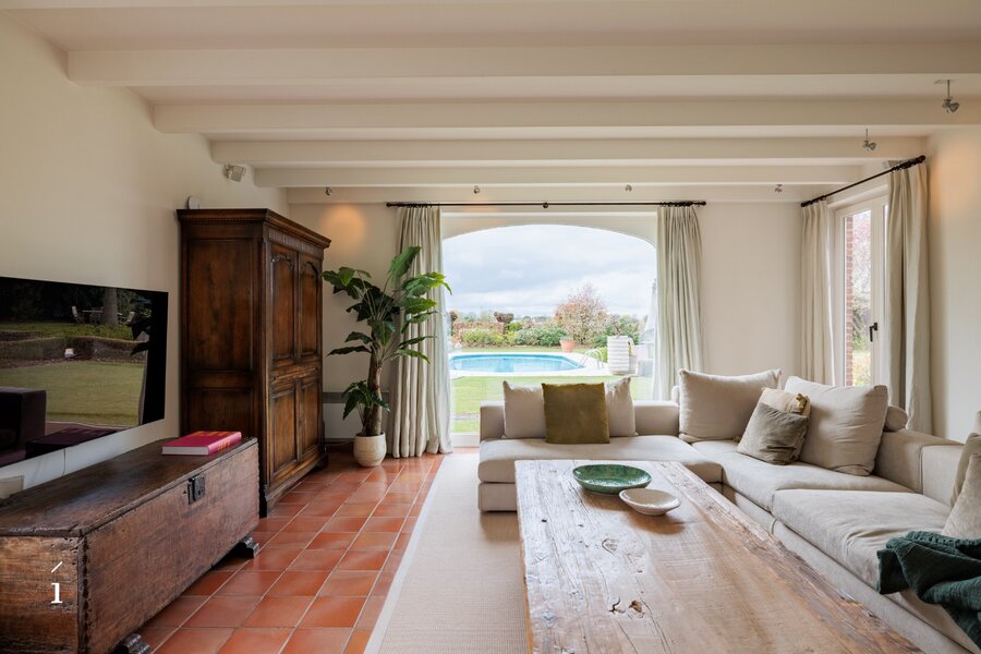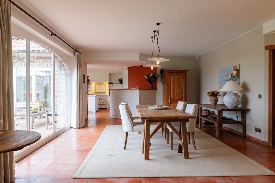 Bij het binnenkomen wordt u verwelkomd in de inkomhal met vestiaire en gastentoilet. Van daaruit komt u in de centrale eetruimte, die geniet van een prachtig zicht op de tuin en het zwembad. Links bevindt zich de sfeervolle leefruimte met salon, waar een cassette zorgt voor extra warmte en gezelligheid, aangevuld met een op maat gemaakte bureauruimte op het tussenverdiep, ideaal voor wie wonen en werken wil combineren. Rechts leidt de woning naar de leefkeuken, volledig op maat ingericht en uitgerust met een Lacanche kookvuur, en aansluitend een charmante erker die dienst doet als tweede eetruimte met zicht op het groen. Verder is er op dit niveau een wasplaats/berging voorzien.