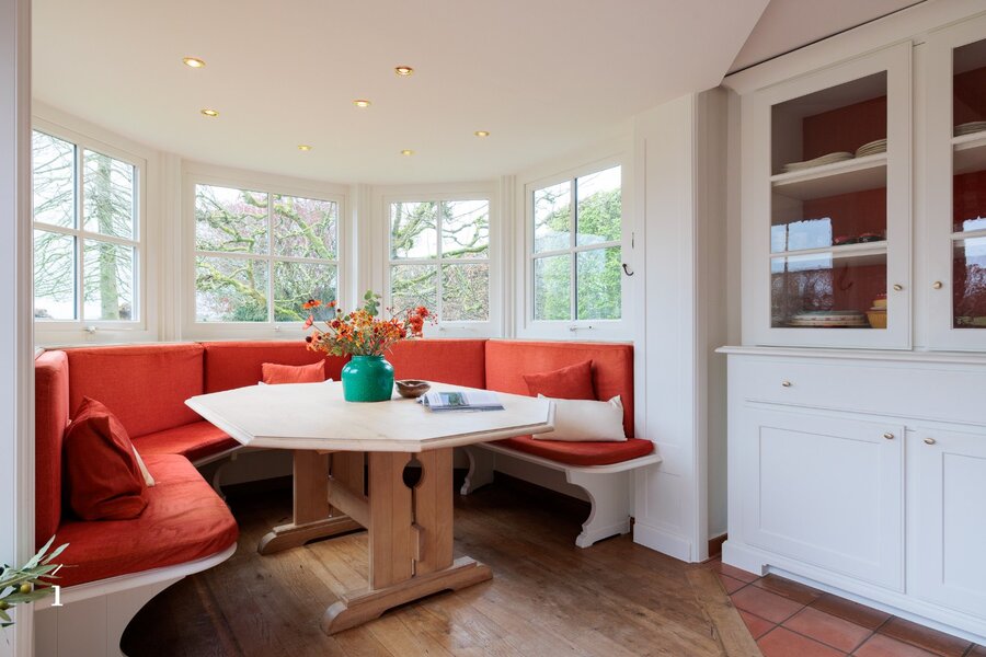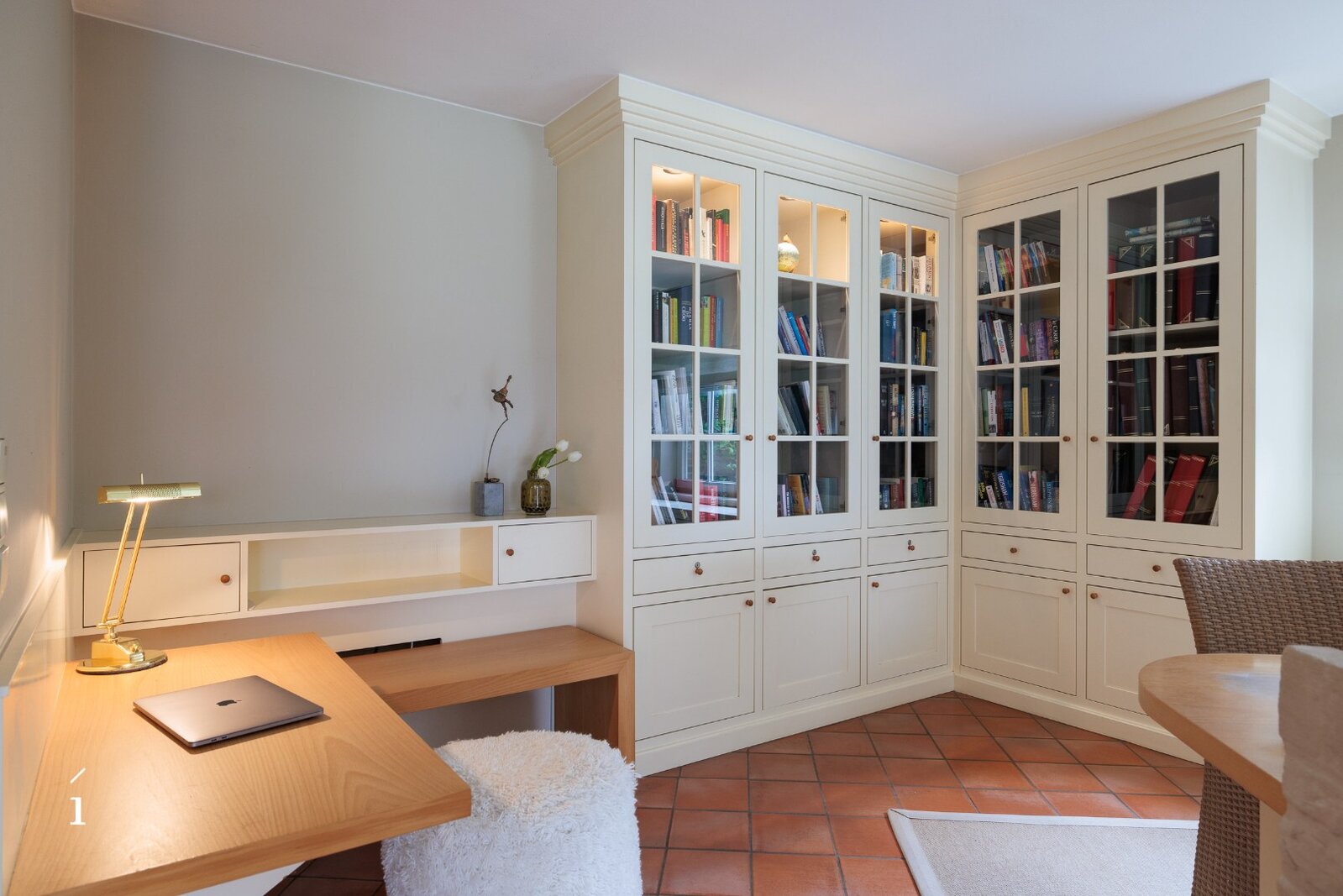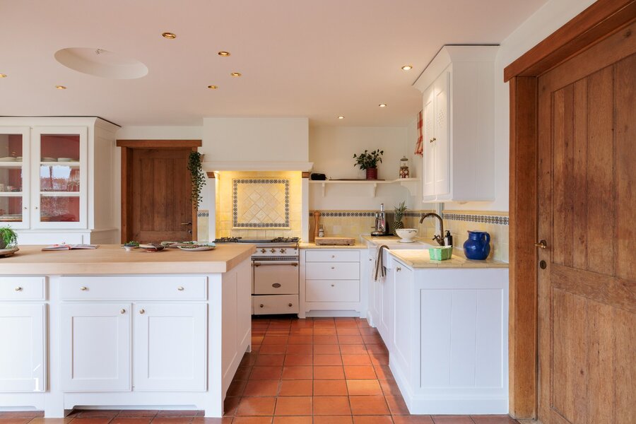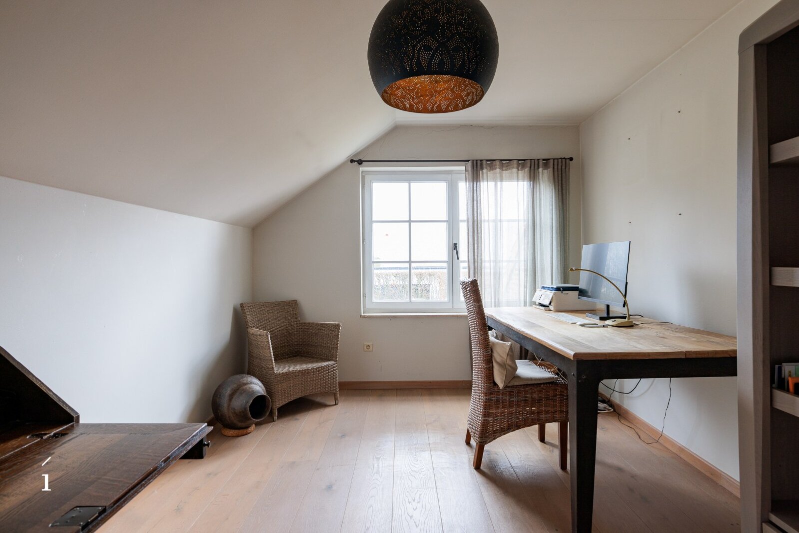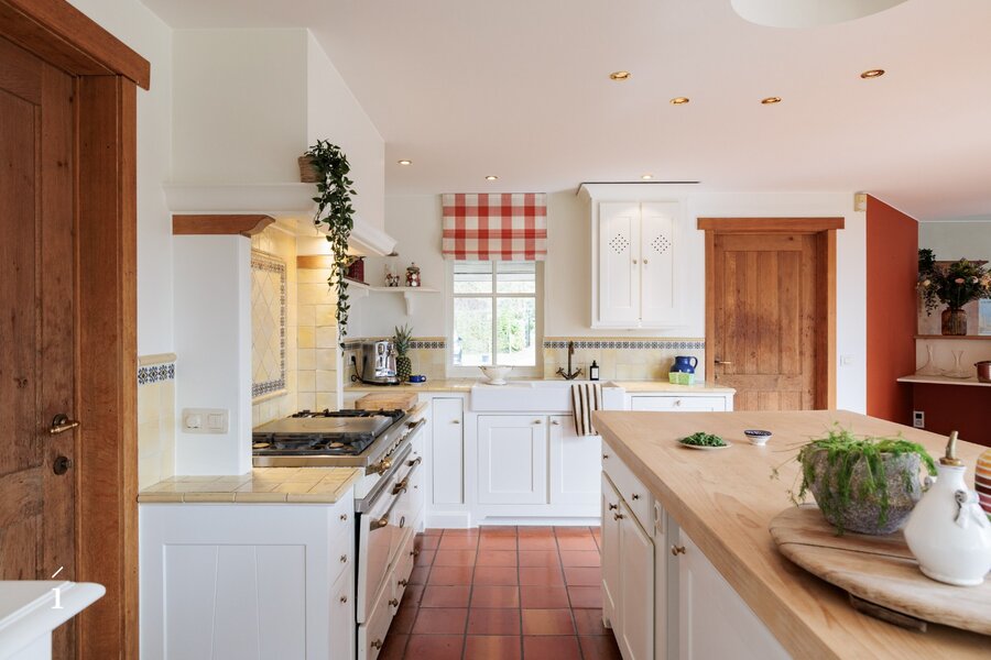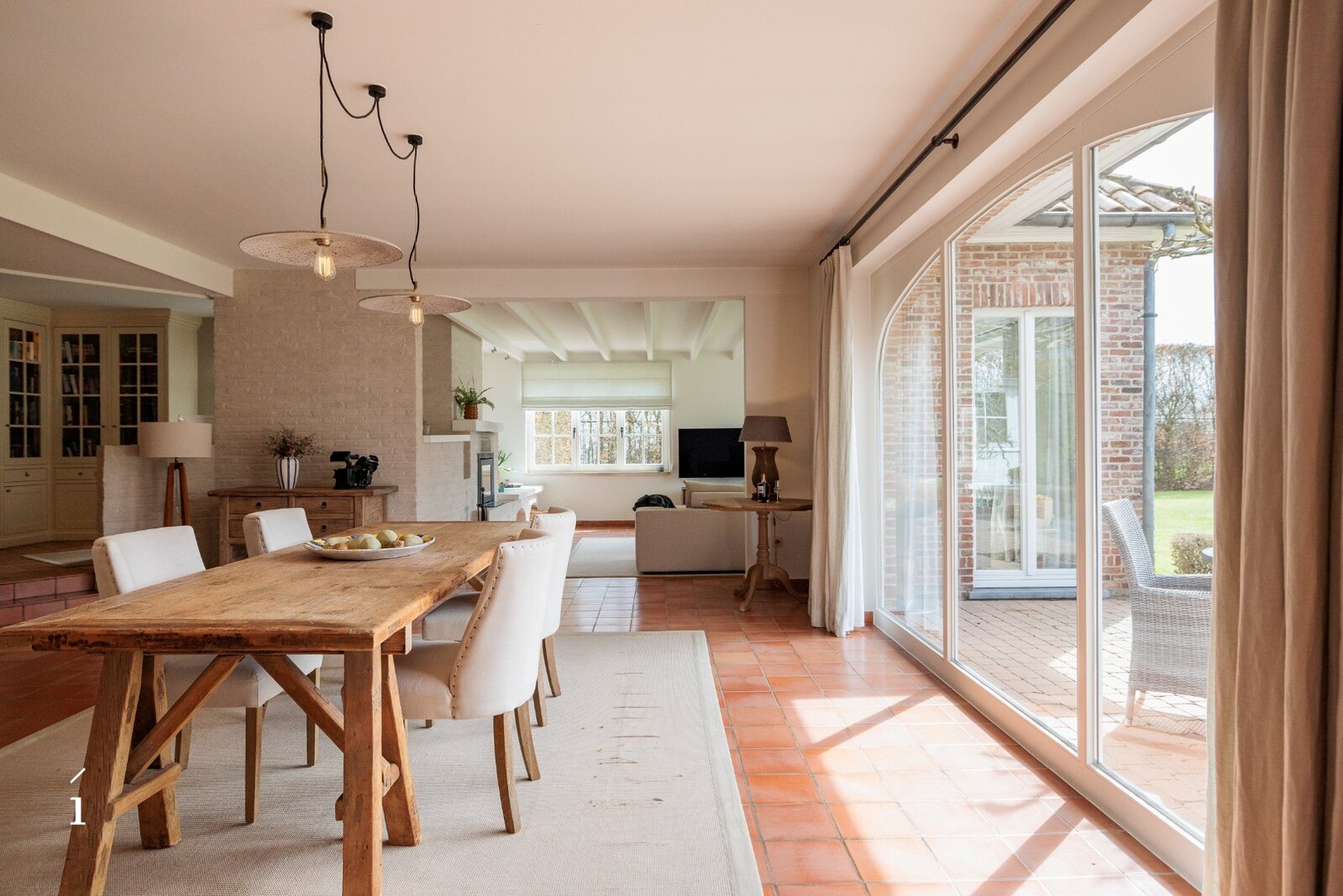 Bij het binnenkomen wordt u verwelkomd in de inkomhal met vestiaire en gastentoilet. Van daaruit komt u in de centrale eetruimte, die geniet van een prachtig zicht op de tuin en het zwembad. Links bevindt zich de sfeervolle leefruimte met salon, waar een cassette zorgt voor extra warmte en gezelligheid, aangevuld met een op maat gemaakte bureauruimte op het tussenverdiep, ideaal voor wie wonen en werken wil combineren. Rechts leidt de woning naar de leefkeuken, volledig op maat ingericht en uitgerust met een Lacanche kookvuur, en aansluitend een charmante erker die dienst doet als tweede eetruimte met zicht op het groen. Verder is er op dit niveau een wasplaats/berging voorzien.