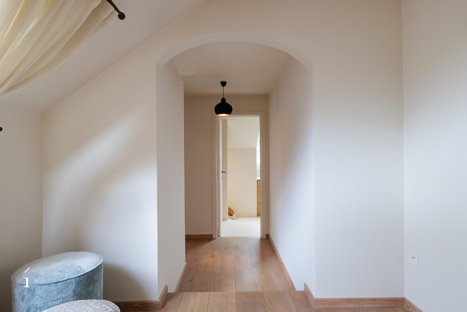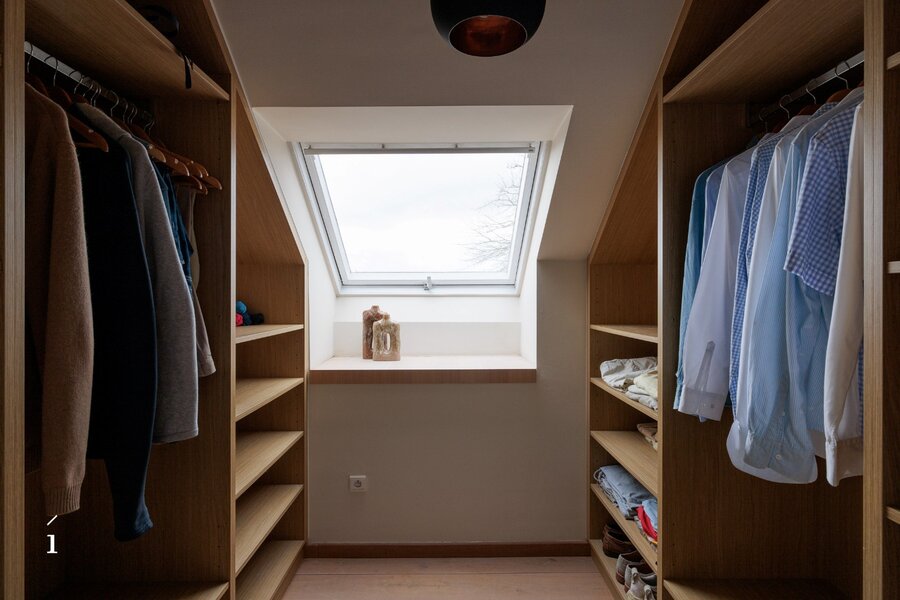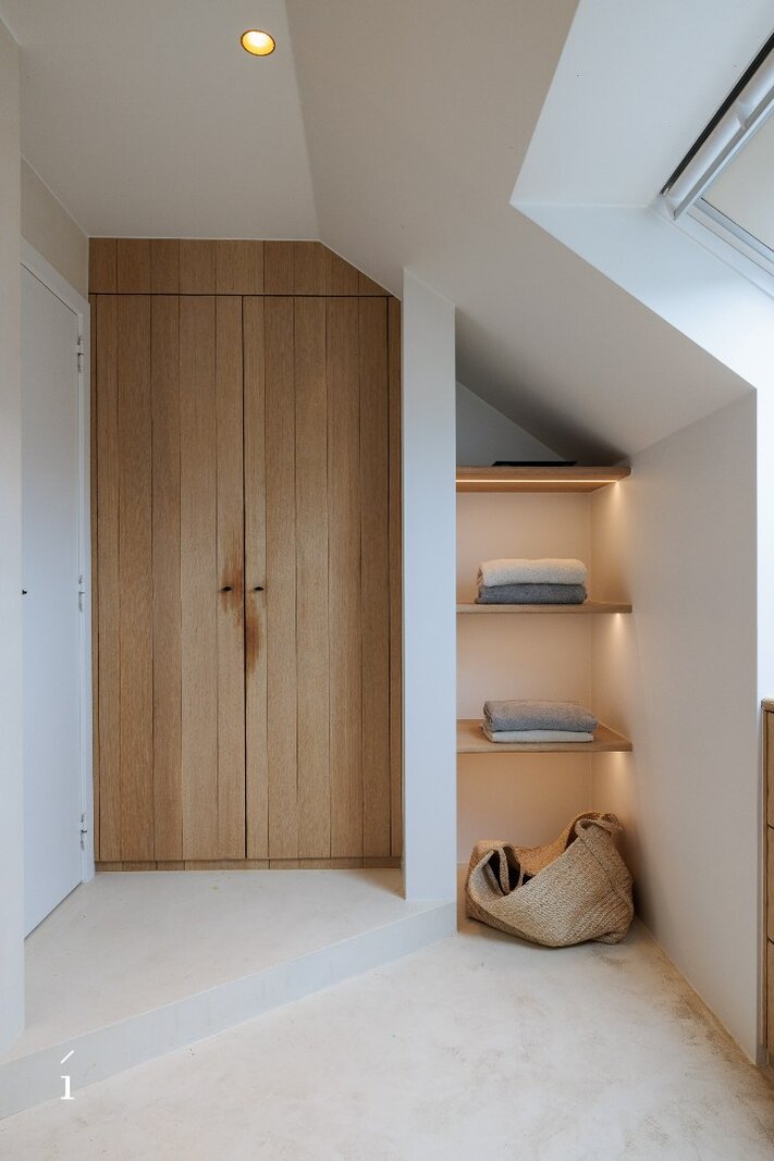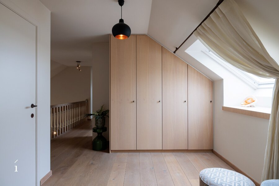 Op de eerste verdieping bevinden zich twee ruime kinderslaapkamers, een aparte dressing en een centrale badkamer, stijlvol afgewerkt in Mortex.