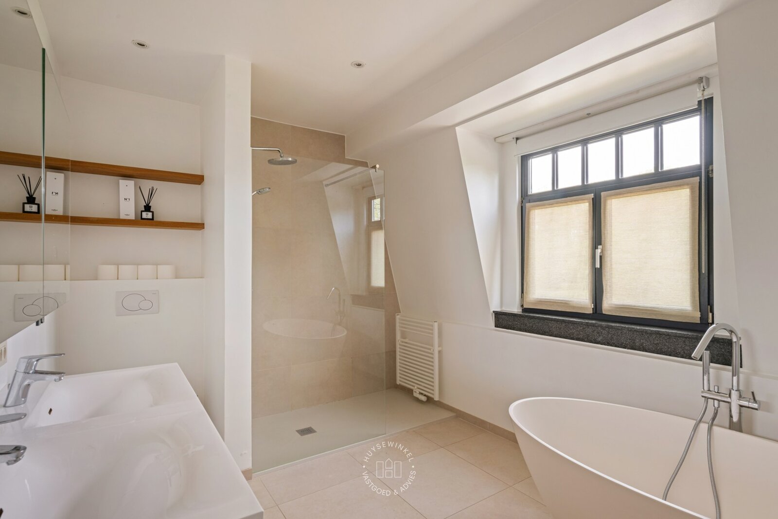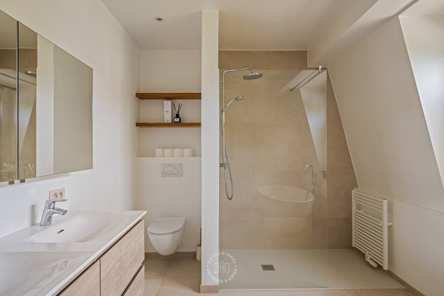 Op de eerste verdieping bevinden zich drie volwaardige en comfortabele slaapkamers. De master bedroom beschikt over een ensuite dressing en badkamer, wat zorgt voor extra luxe en privacy. Daarnaast is er op deze verdieping nog een tweede badkamer aanwezig, uitgerust met een douche. Verder beschikt de woning over een praktische zolderkamer en meerdere bergingen, waardoor er aan opbergruimte geen gebrek is.