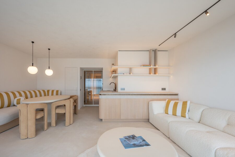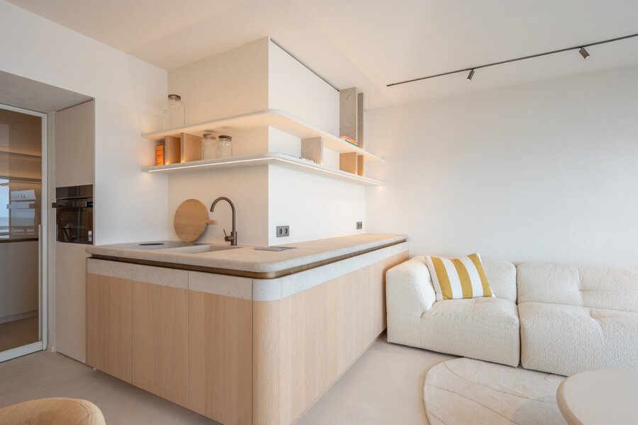 Dit appartement omvat inkom met apart toilet, en vestiairekast. Brede woonkamer ingericht met zitbank dat geniet van een zeer spectaculair zeezicht, dat uitgeeft op terras. Open keuken met alle comfort.