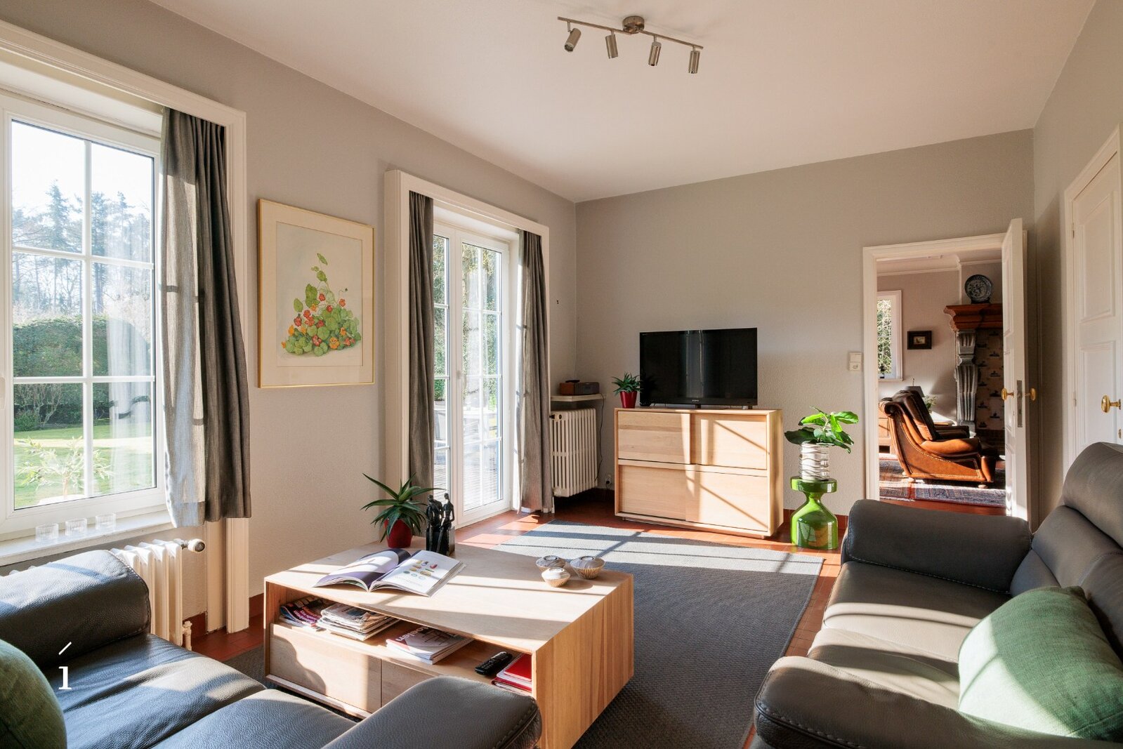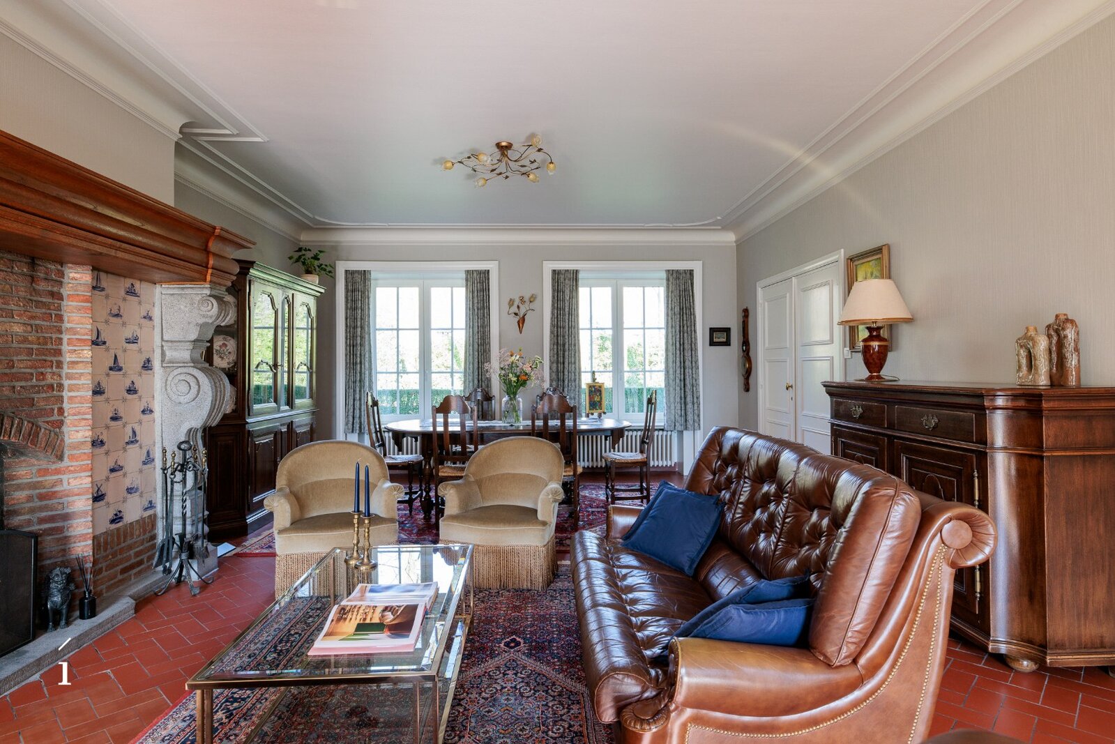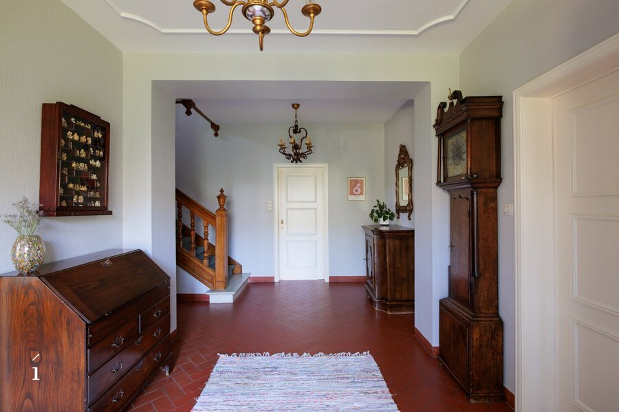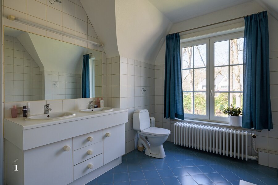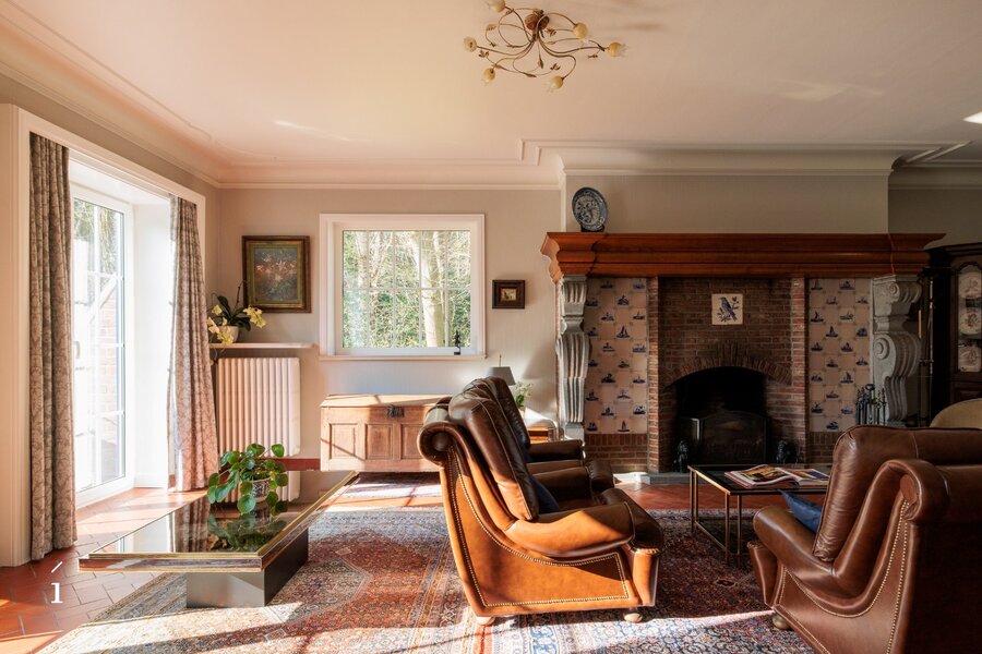 U betreedt de villa via de inkomhal, met aansluitend een thuiskantoor. De leefruimte vormt het hart van de woning en wordt gekenmerkt door een warme, uitnodigende sfeer, versterkt door de open haard en zorgvuldig bewaarde authentieke elementen. Aansluitend bevinden zich de eetplaats en de keuken, beide met een open zicht op de tuin; samen vormen deze een ruimtelijk geheel. De grote blokramen zorgen voor een overvloed aan natuurlijk licht en creëren een mooie wisselwerking tussen binnen en buiten.