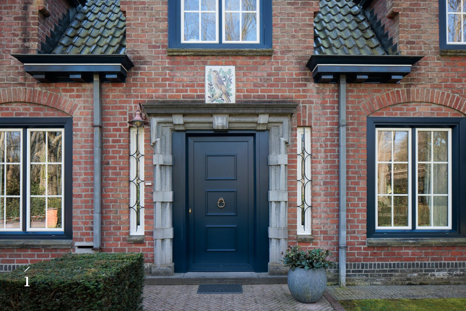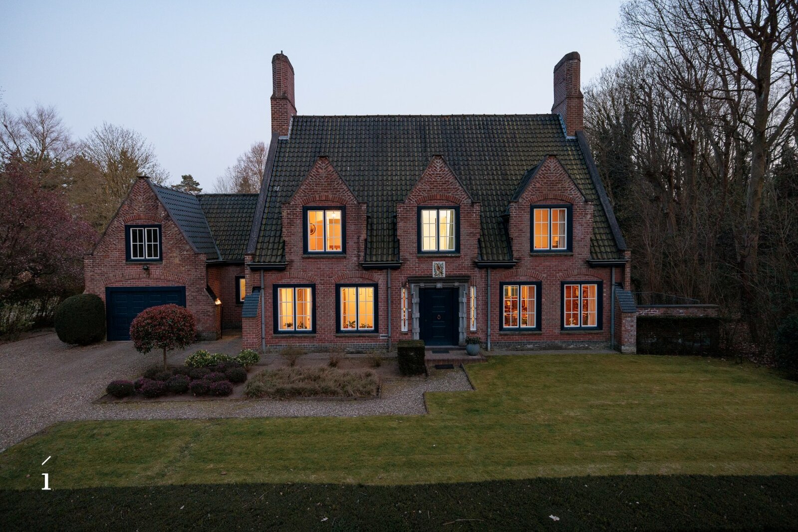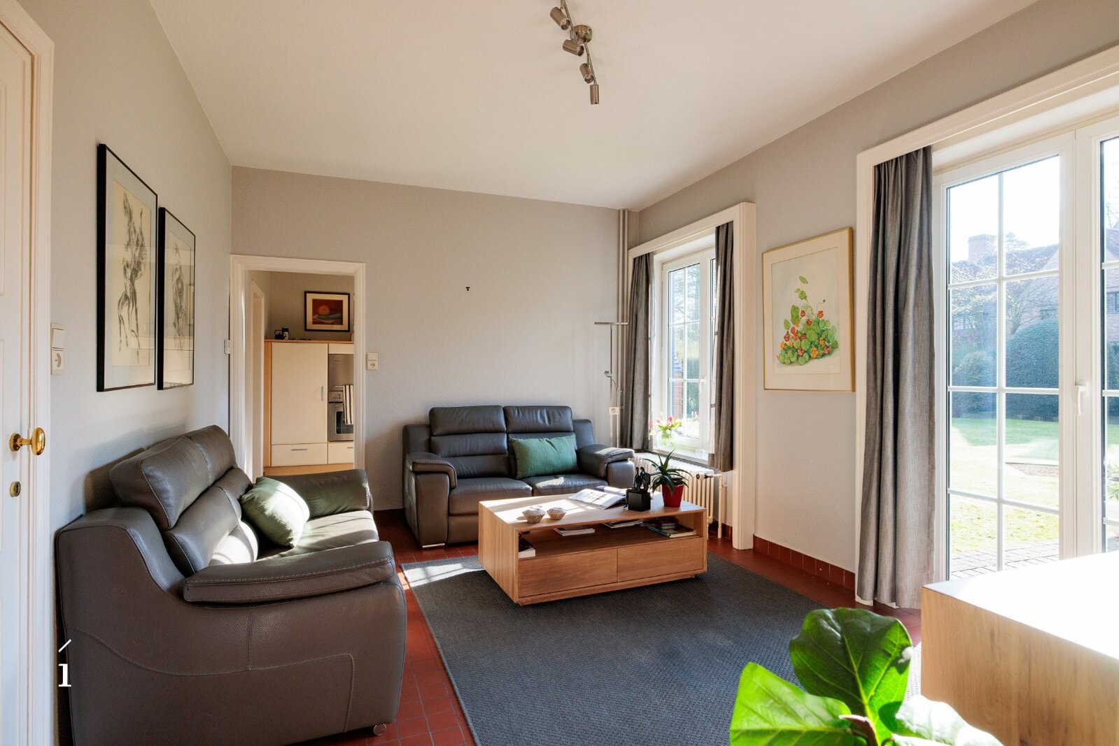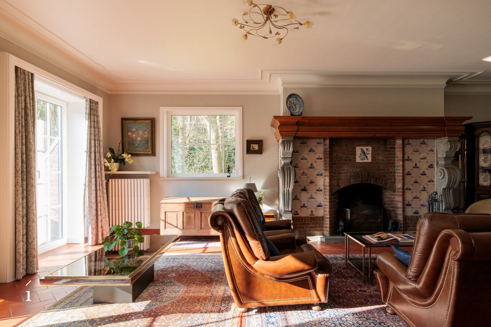U betreedt de villa via de inkomhal, met aansluitend een thuiskantoor. De leefruimte vormt het hart van de woning en wordt gekenmerkt door een warme, uitnodigende sfeer, versterkt door de open haard en zorgvuldig bewaarde authentieke elementen. Aansluitend bevinden zich de eetplaats en de keuken, beide met een open zicht op de tuin; samen vormen deze een ruimtelijk geheel. De grote blokramen zorgen voor een overvloed aan natuurlijk licht en creëren een mooie wisselwerking tussen binnen en buiten.