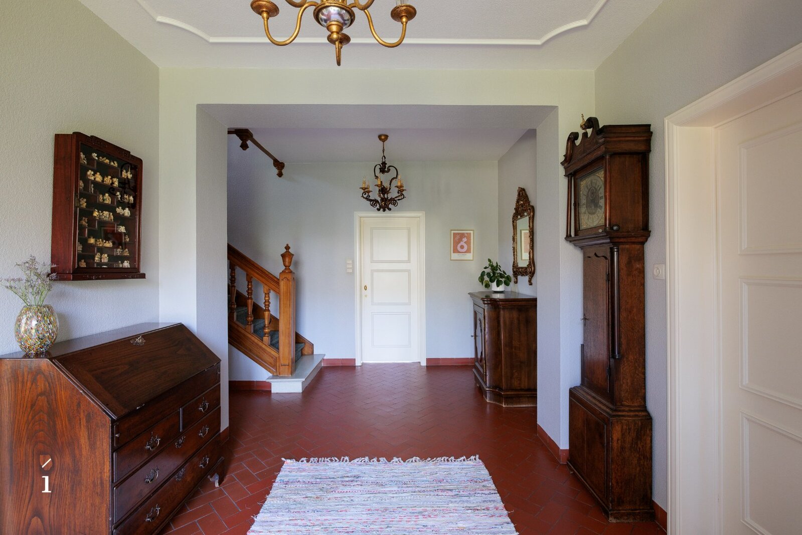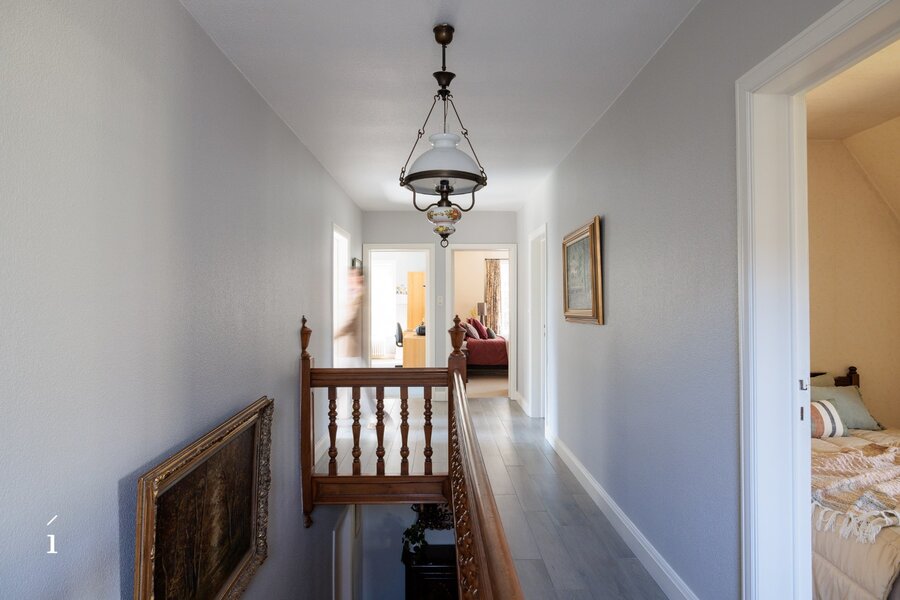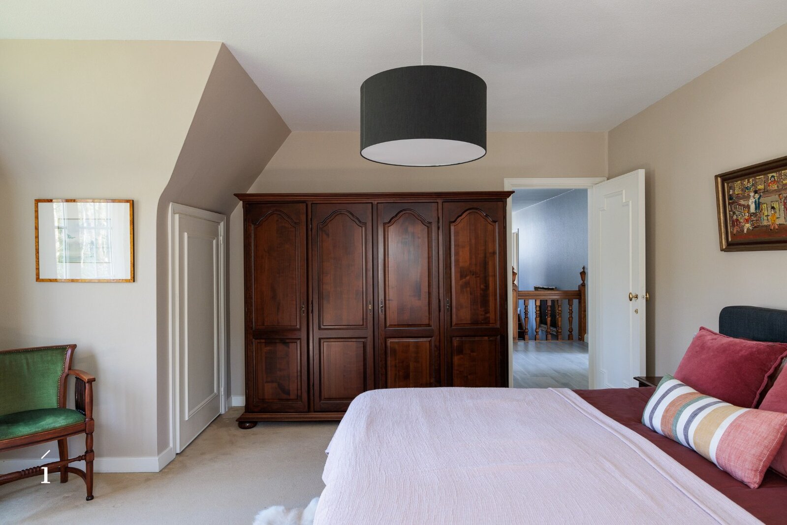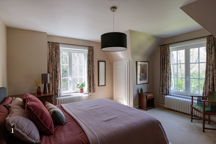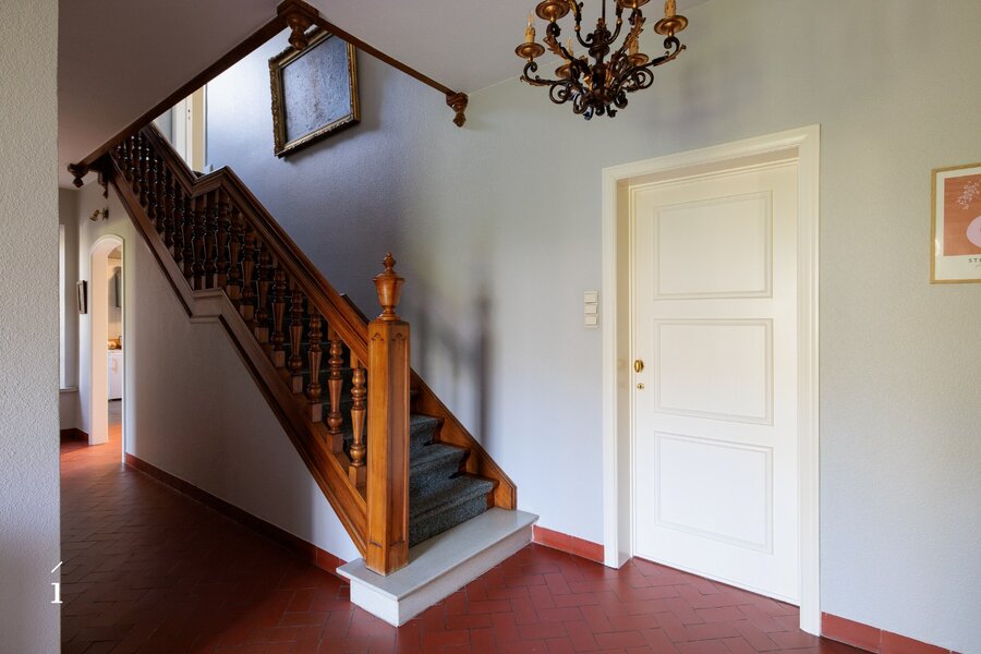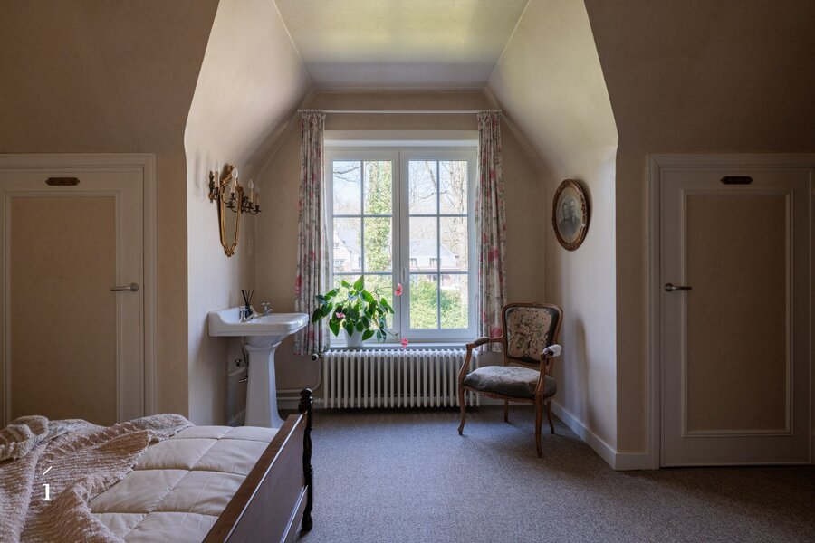 Op de eerste verdieping bevinden zich vijf volwaardige slaapkamers en een badkamer. Boven de garage is er bovendien een extra kamer (voormalige meidenkamer) met aanpalende zolderruimte. Deze bieden interessante mogelijkheden om te herinrichten tot een bijkomende slaapkamer met badkamer of een polyvalente invulling.