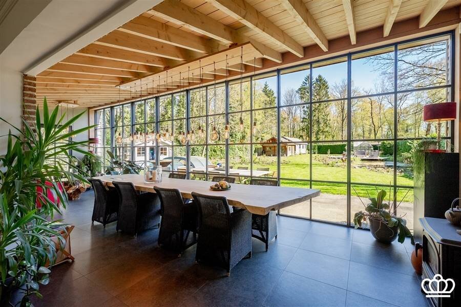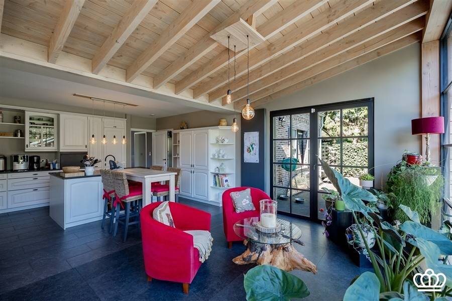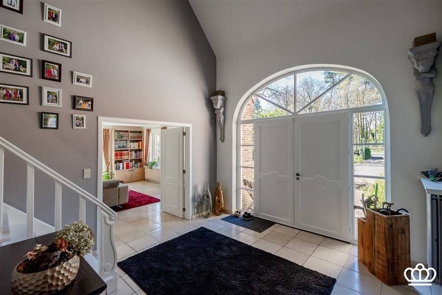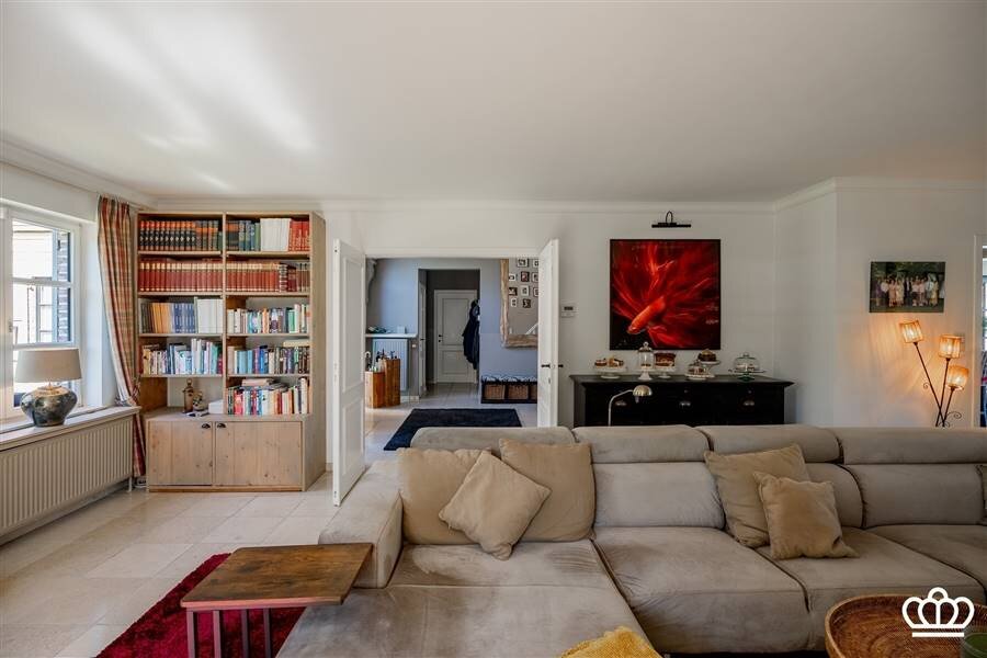 Ruime inkomhal op natuursteen met gastentoilet en handenwasser. Aparte dressingkast. Via een dubbele deur komt u in de lichtrijke leefruimte, eveneens op natuursteen, ingedeeld in zithoek, eetruimte en keuken. Dankzij de nieuwe uitbouw geniet deze ruimte van uitzonderlijk veel licht en is er directe toegang tot de tuin.