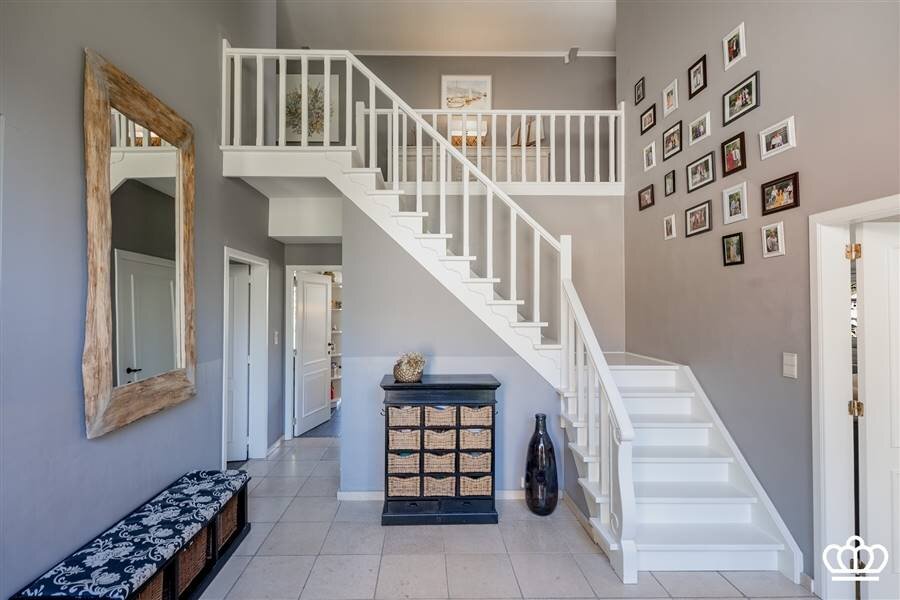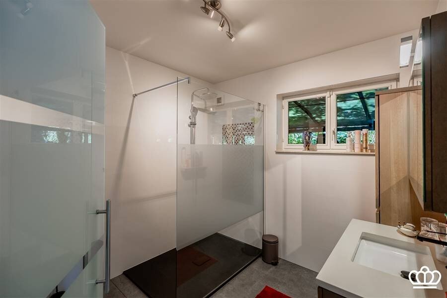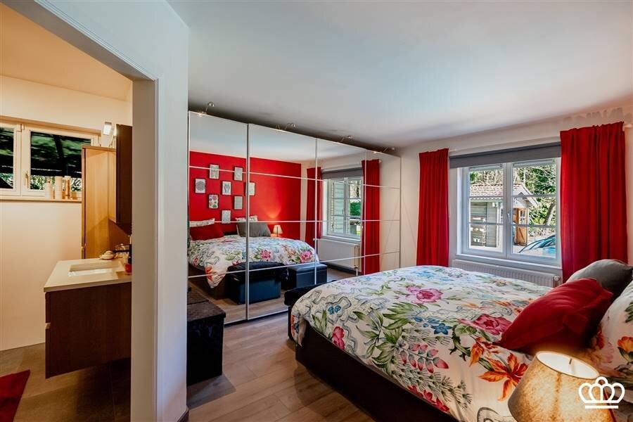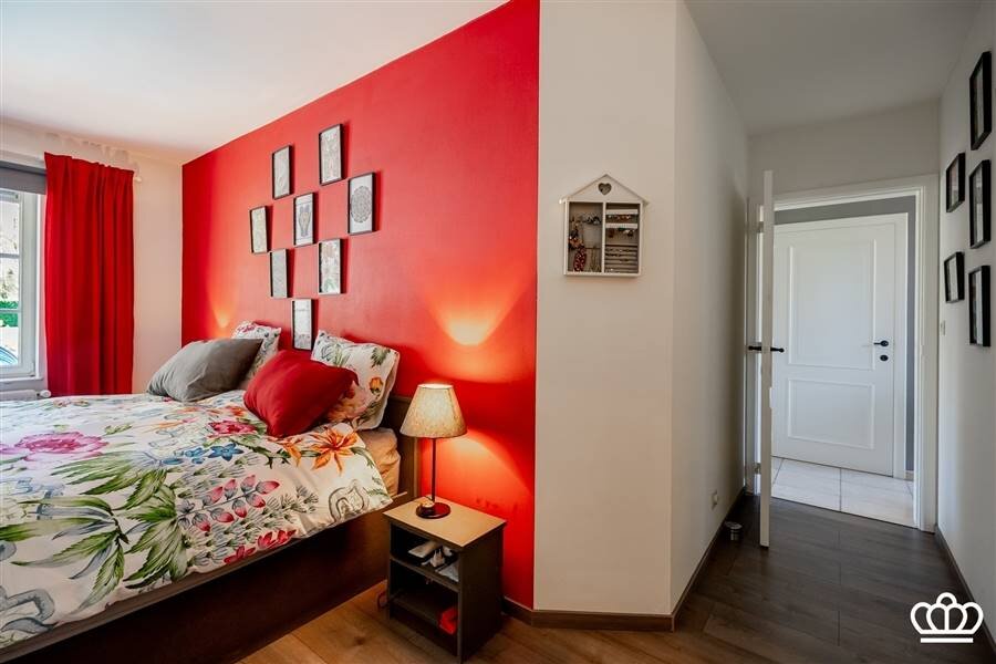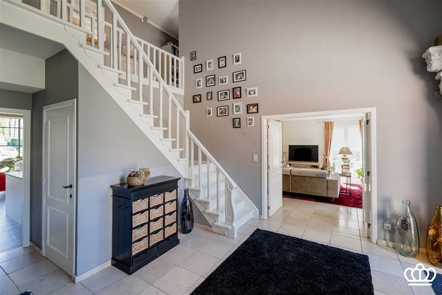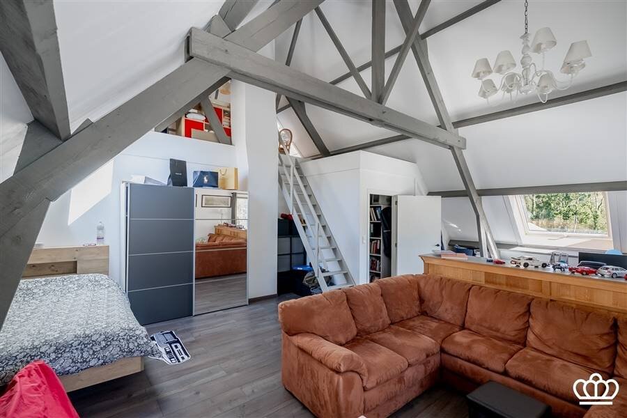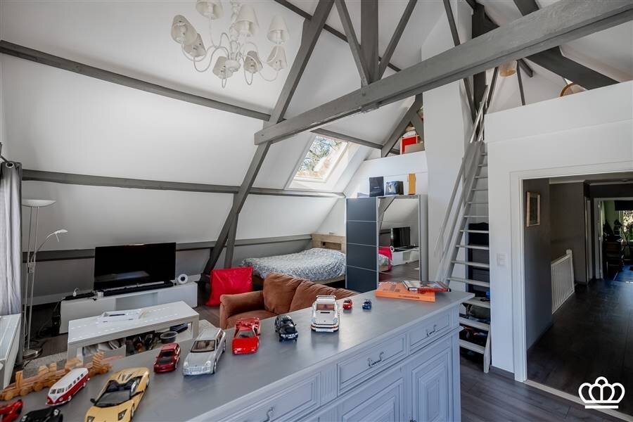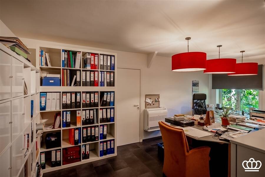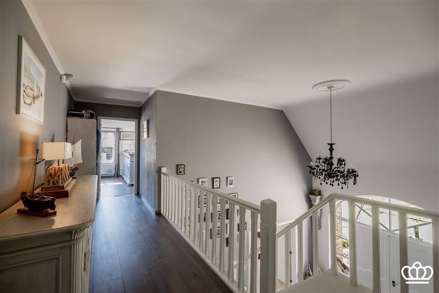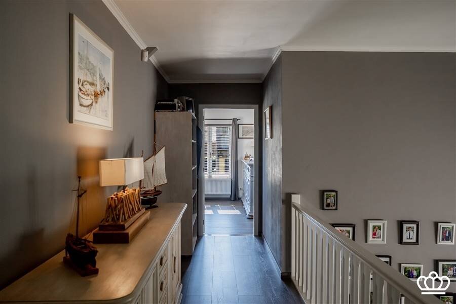 Via de riante inkomhal bereikt u de eerste verdieping. Hier bevindt zich een tweede ruime slaapkamer, momenteel ingericht als bureau, met vlotte toegang tot de bergruimte boven de garage.