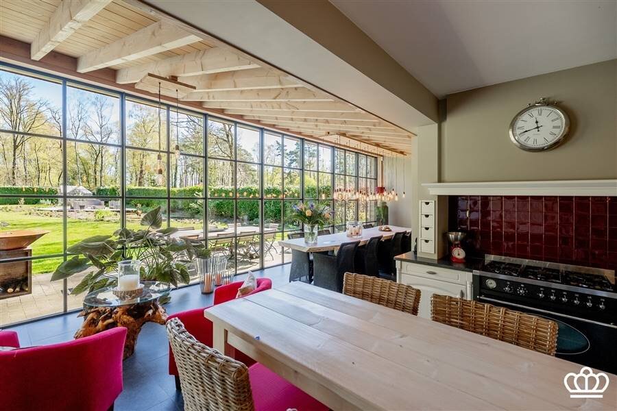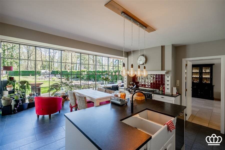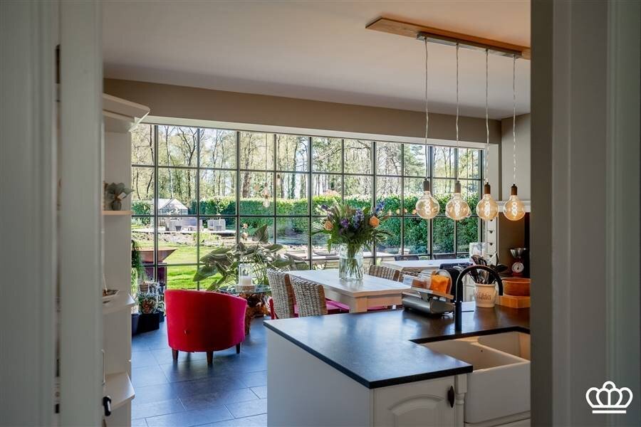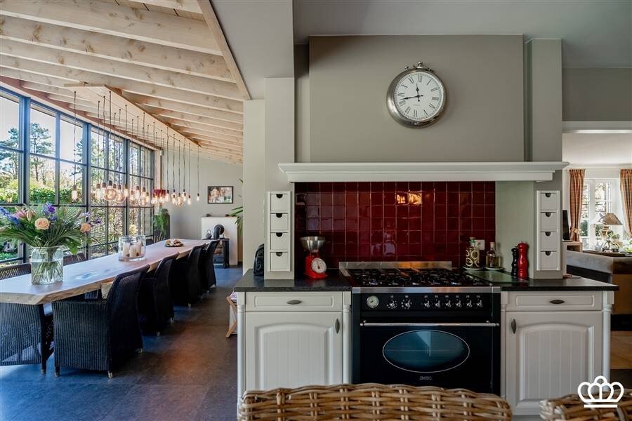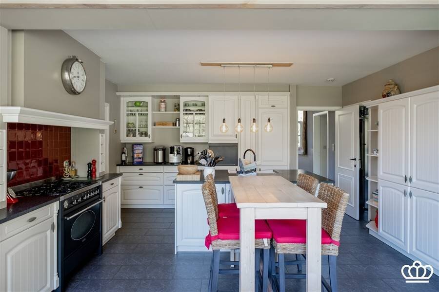 De ingerichte keuken beschikt over een keukeneiland en is voorzien van oven, combi-oven, vaatwasser en dampkap. Aansluitend vindt u de bijkeuken met aansluitingen voor wasmachine en droogkast, vanwaar u ook toegang heeft tot de tuin.