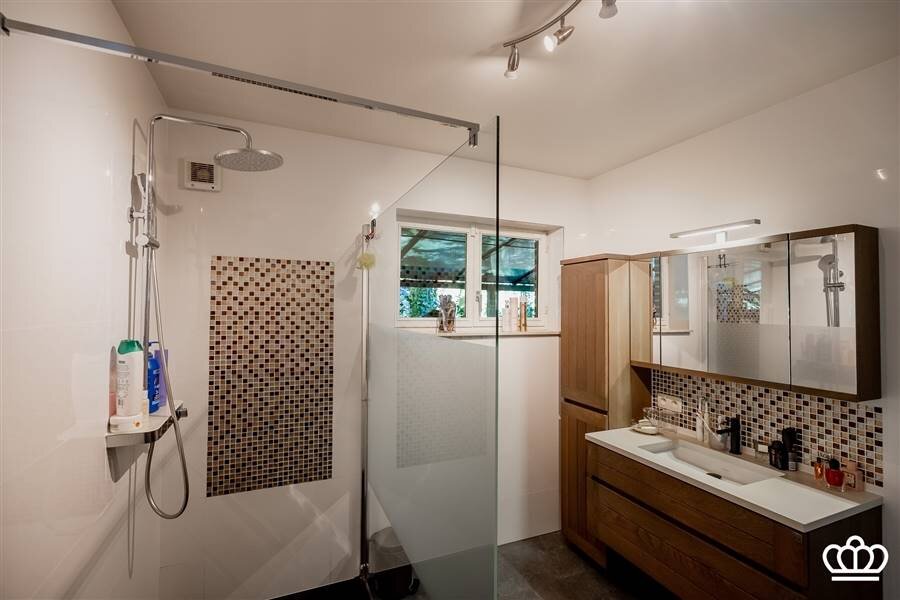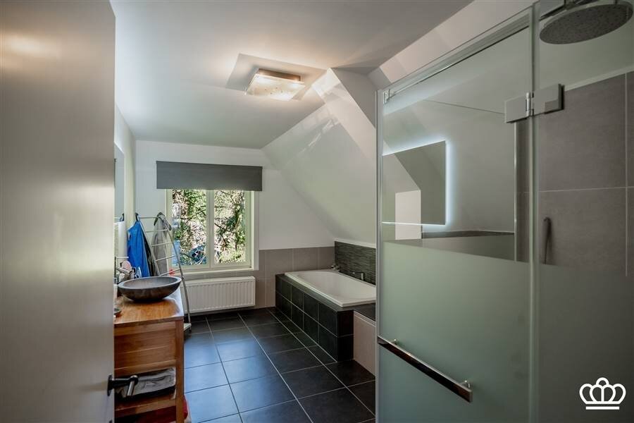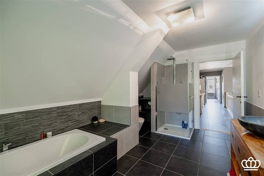 De tweede badkamer is ingericht met douche, ligbad, lavabo en toilet.