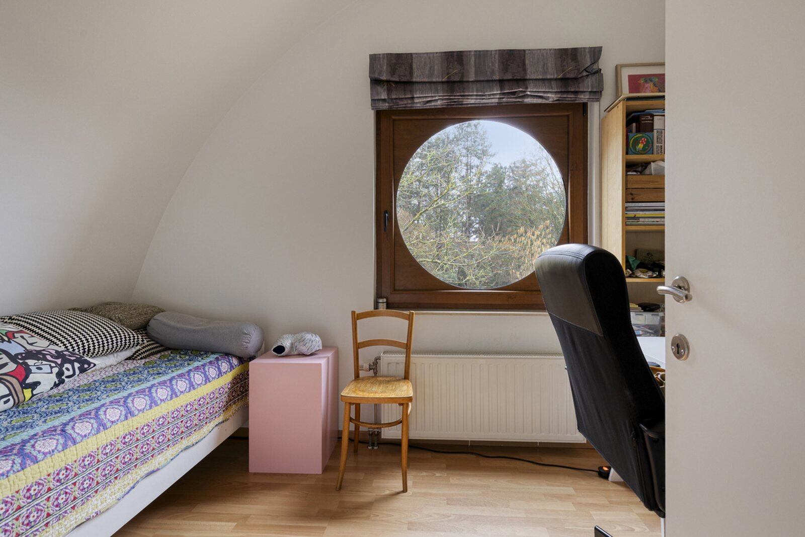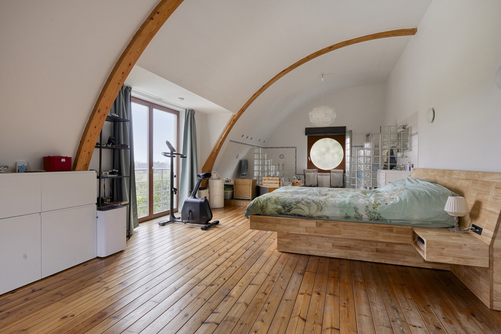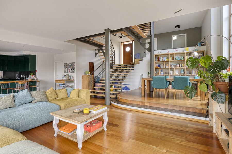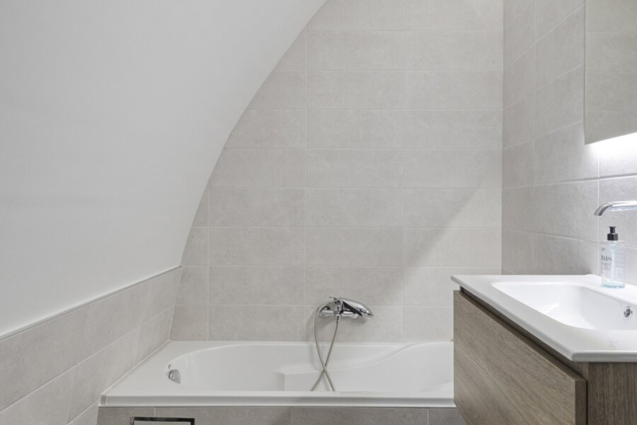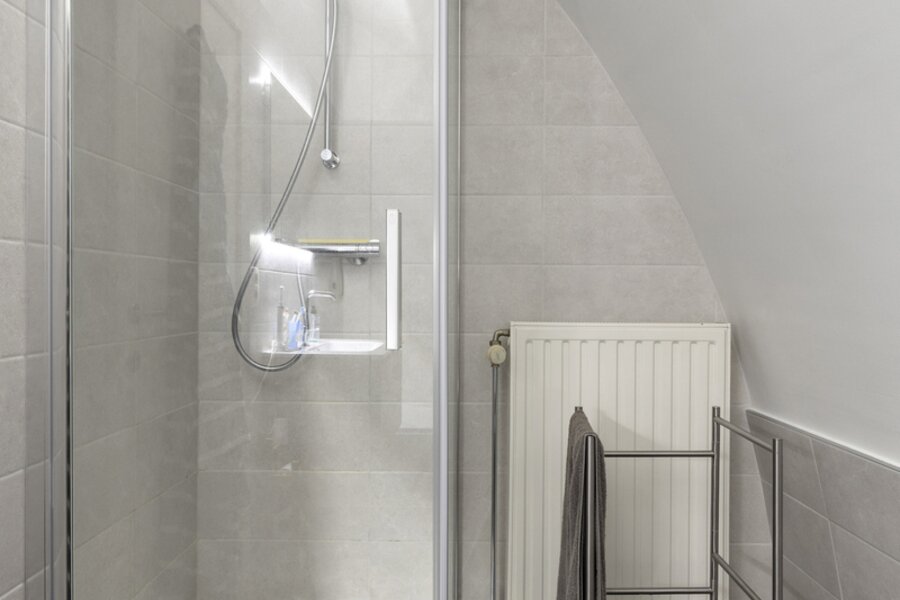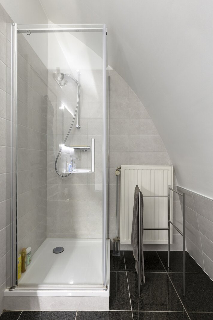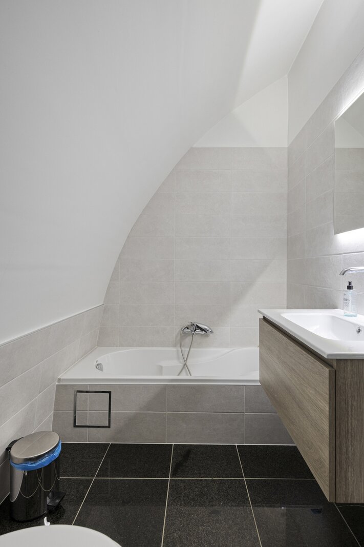 2de halve verdieping: 2 slaapkamers (±8m² en ±28m²) - badkamer (bad, douche, lavabo, toilet).