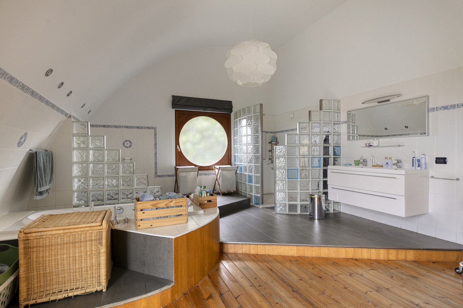 1ste halve verdieping: masterbedroom (±36m²) met open badkamer (bad, douche, dubbele lavabo, toilet) (±16m²).