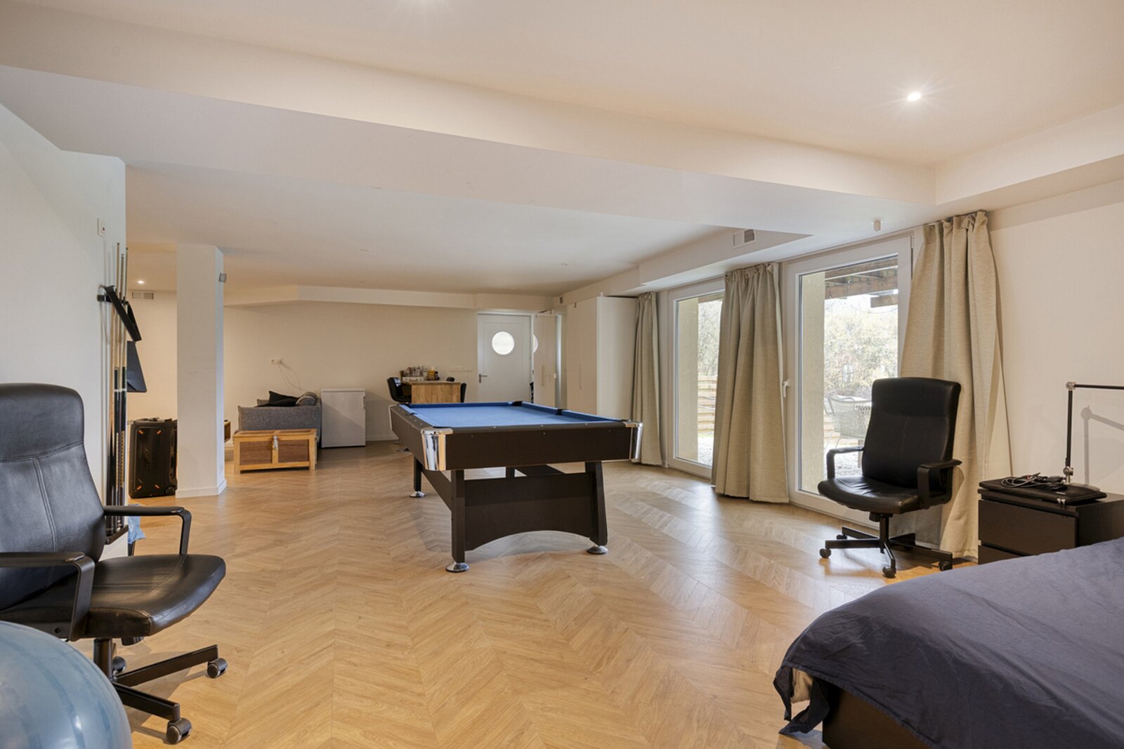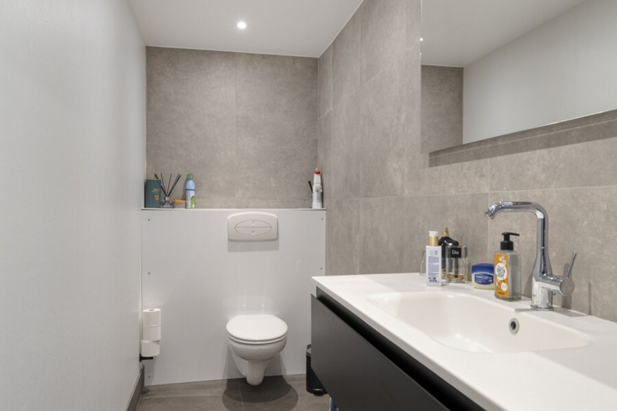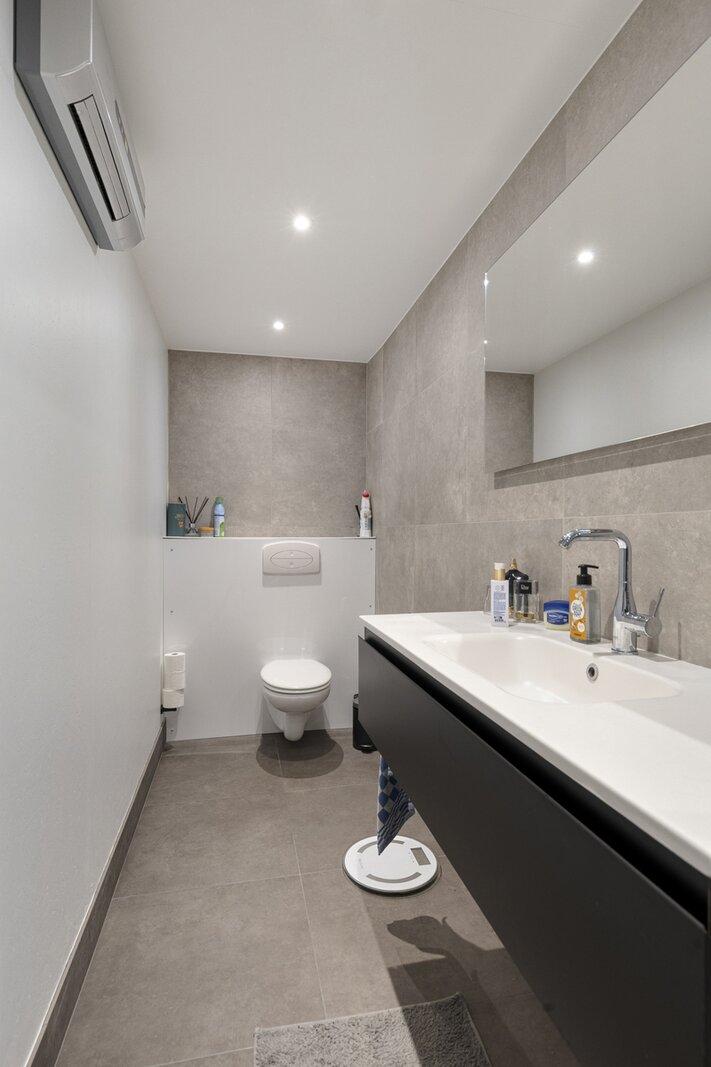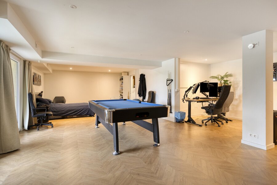 Tuinniveau: polyvalente ruimte (±62m²) - douchekamer (douche, lavabo, toilet).