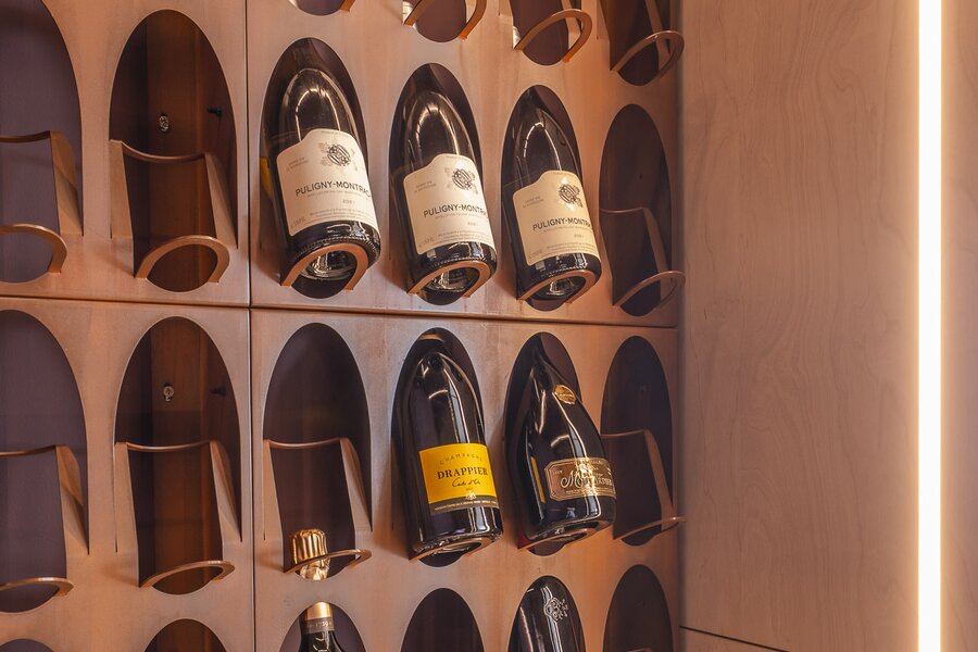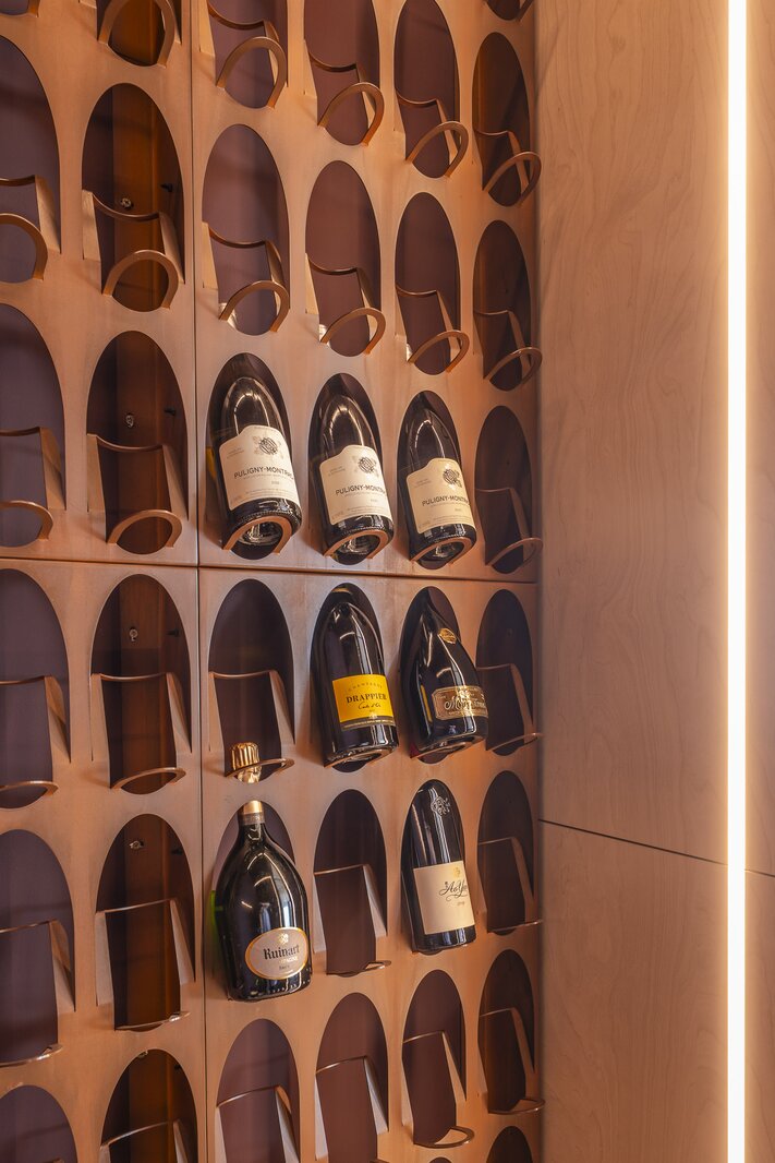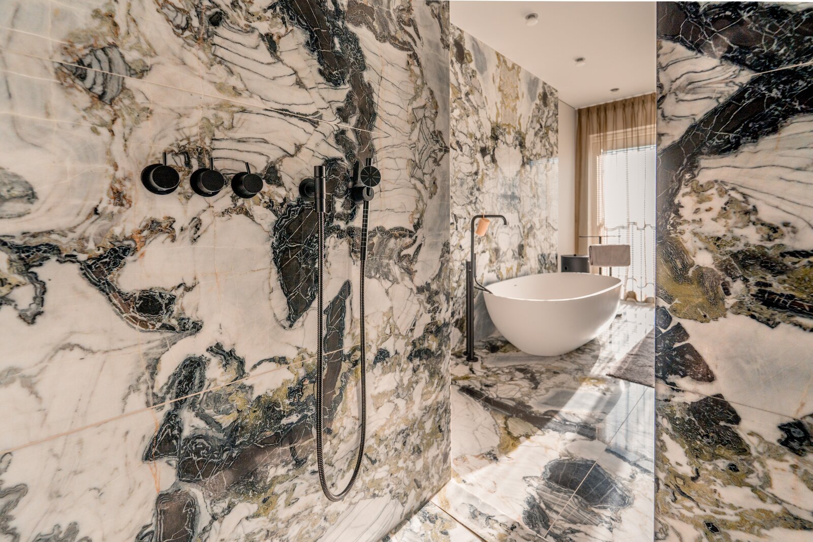 Massief marmer, zorgvuldig geselecteerd op tekening en schakering, vormt de basis. Naadloze integraties, royale volumes en perfect uitgebalanceerde verhoudingen creëren een ruimte die tegelijk krachtig en sereen aanvoelt.