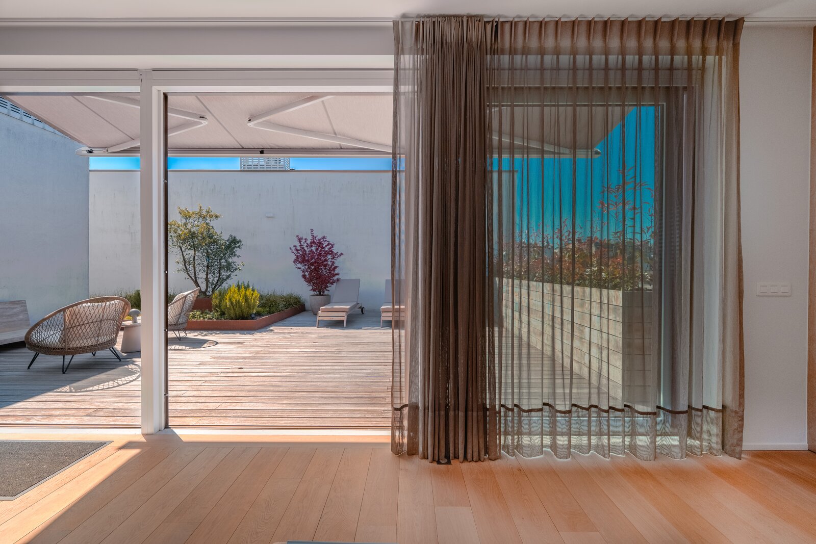 De architectuur omarmt de buitenruimte en creëert een subtiele luwte waarin privacy vanzelfsprekend wordt.