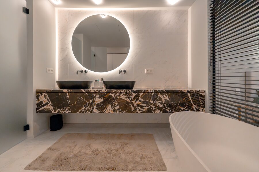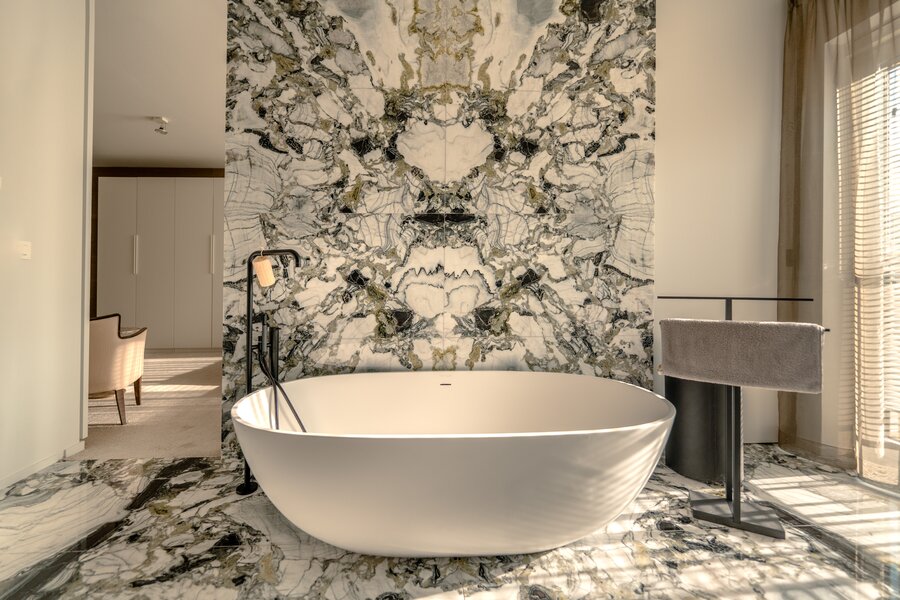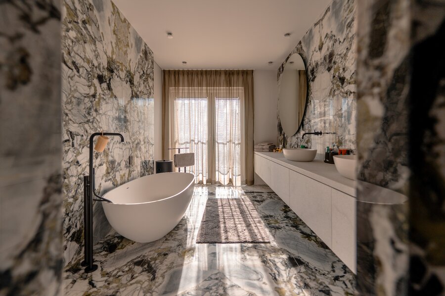Vrijstaande baden, inloopdouches en dubbele wastafels passen naadloos binnen een groter geheel.