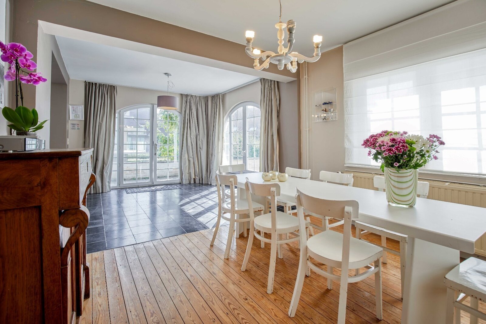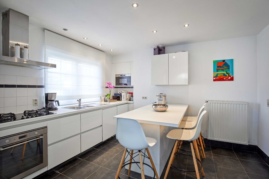 De lichtrijke leefruimte straalt warmte en gezelligheid uit en sluit naadloos aan op de charmante eetplaats en de volledig ingerichte keuken met aparte eethoek – perfect voor wie houdt van koken en samenzijn.