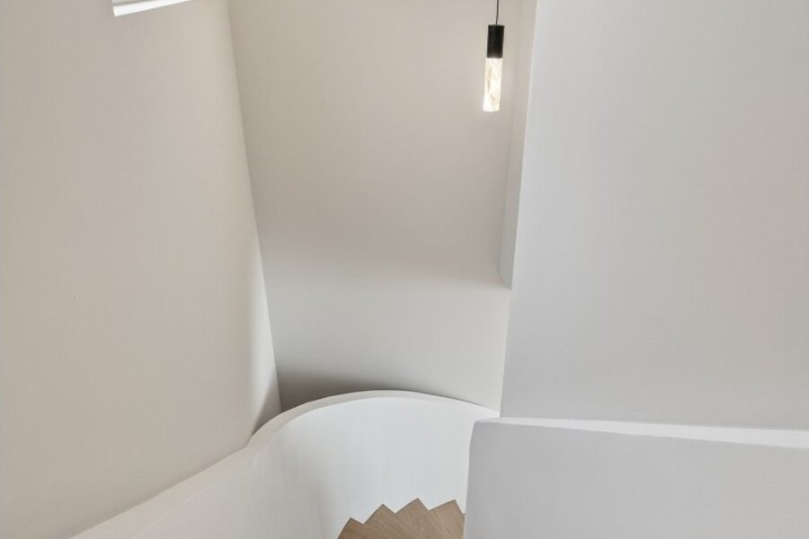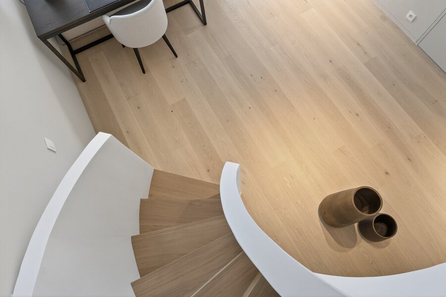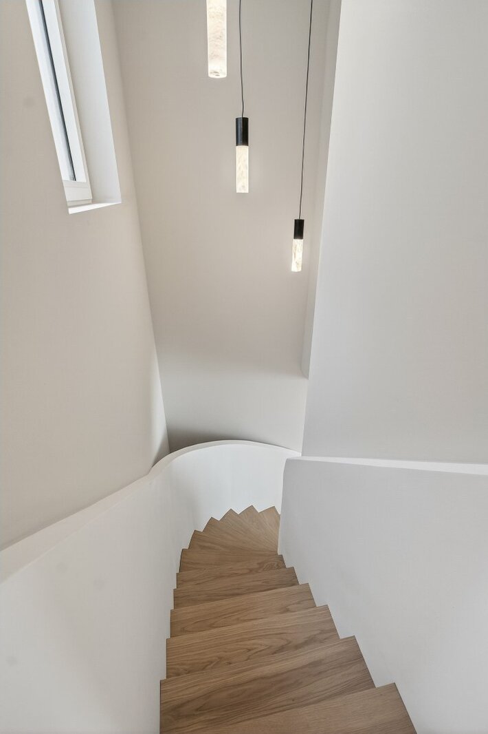 De 8e verdieping herbergt een open leefruimte, een designkeuken met Miele toestellen, een berging, een apart toilet en twee terrassen: één met frontaal zeezicht, de andere met zicht op de villa’s van Het Zoute. De spiraalvormige trap, een sculpturaal element in de ruimte, leidt naar de 9e verdieping met drie slaapkamers.