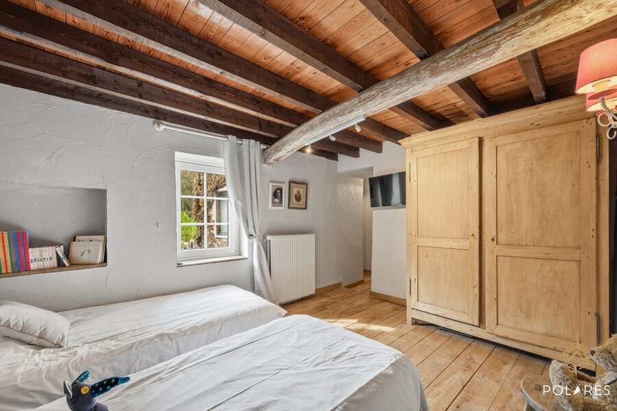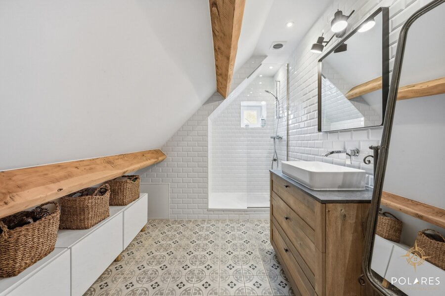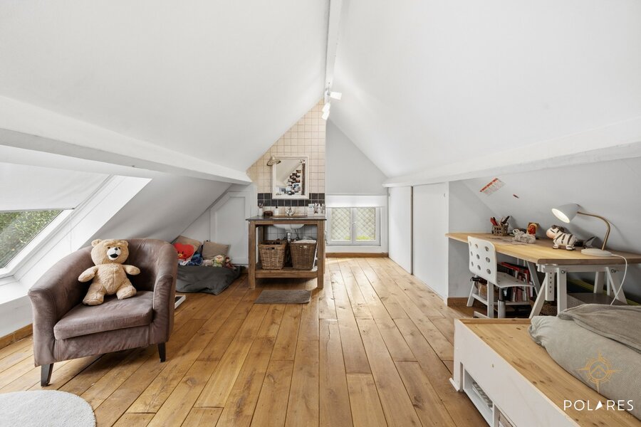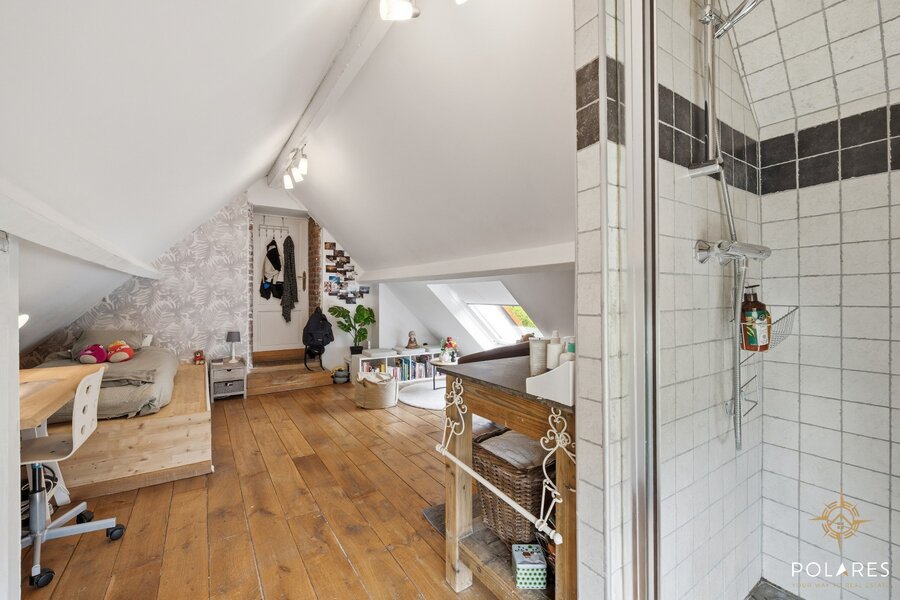 De verdieping biedt een riante nachthal (momenteel ingericht als zithoek), een luxueuze master bedroom met een prachtige ensuite badkamer, en aan de andere zijde nog een extra slaapkamer met douche.