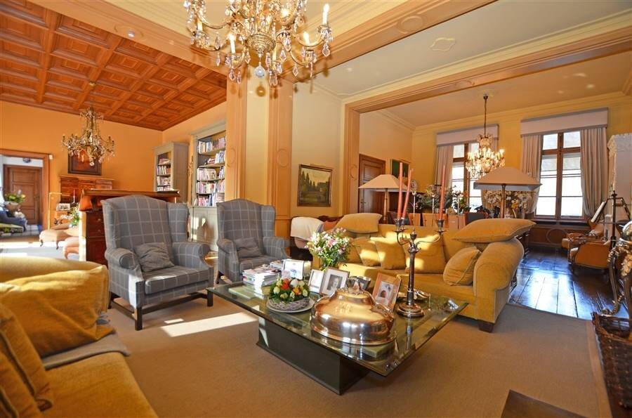 Extra’s: lift (van kelderverdieping tot 1e verdieping), kasseien oprit, kapel, videofoon, automatische toegangspoort, alarm, parket, natuursteen, oud Duitse en Zweedse kachel ovens, airco in living en masterbedroom, inbouwkasten, inbouwmuziekinstallatie, sierradiatoren, volautomatisch zwembad verwarmd via warmtepomp, …