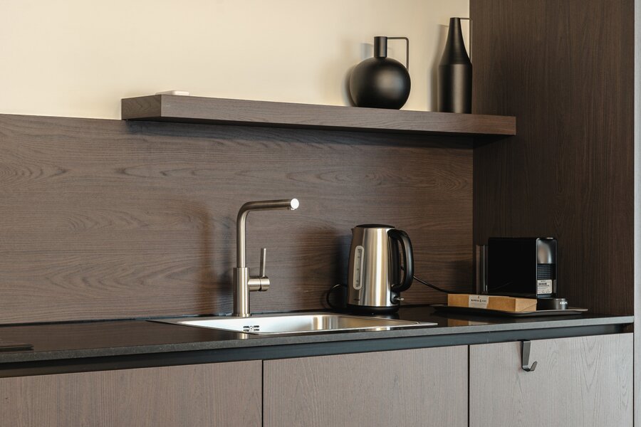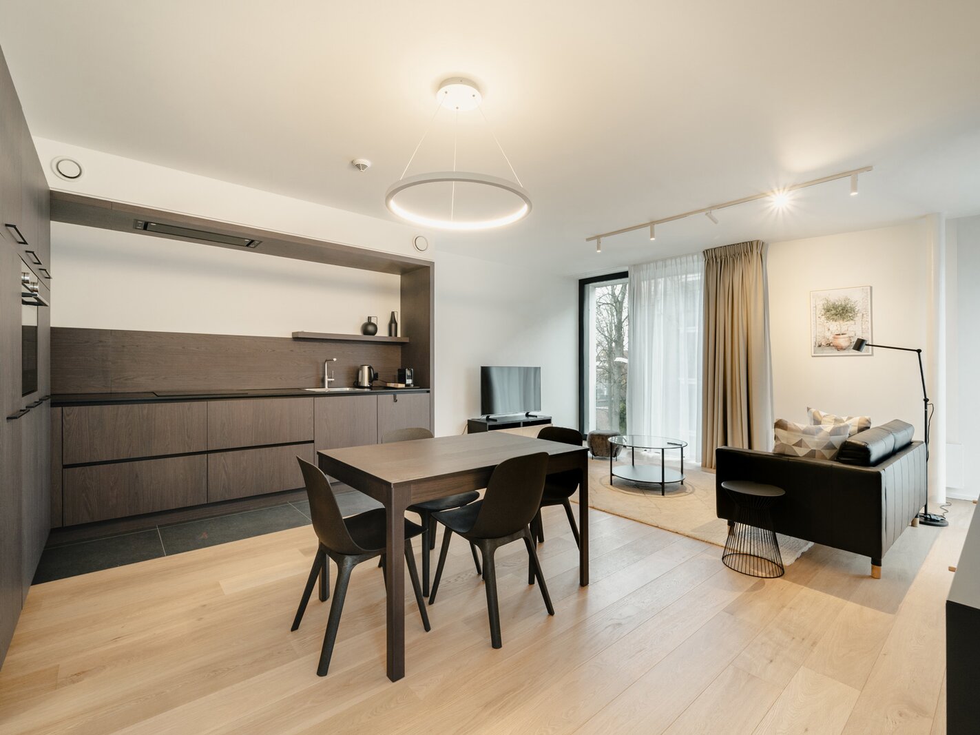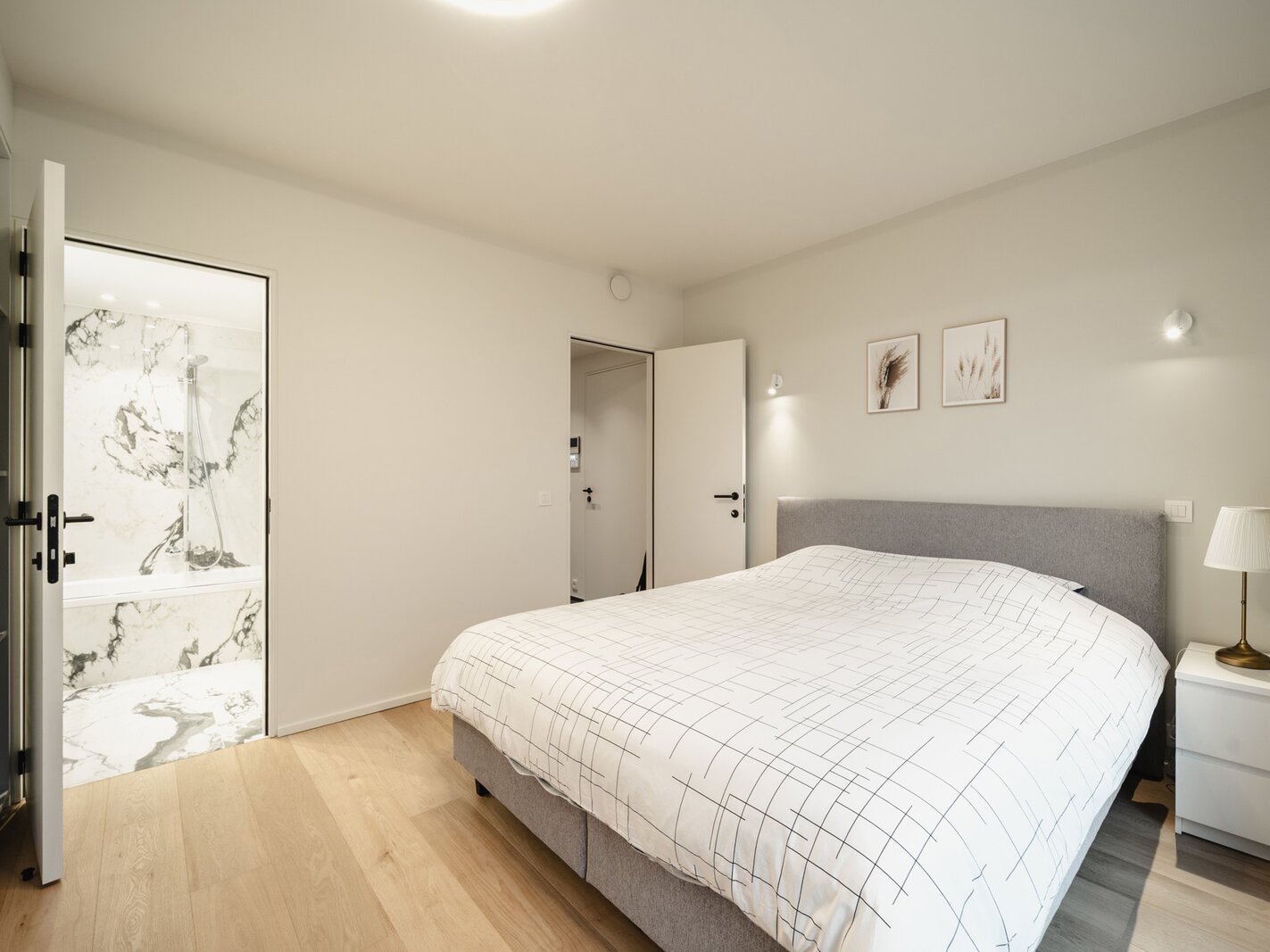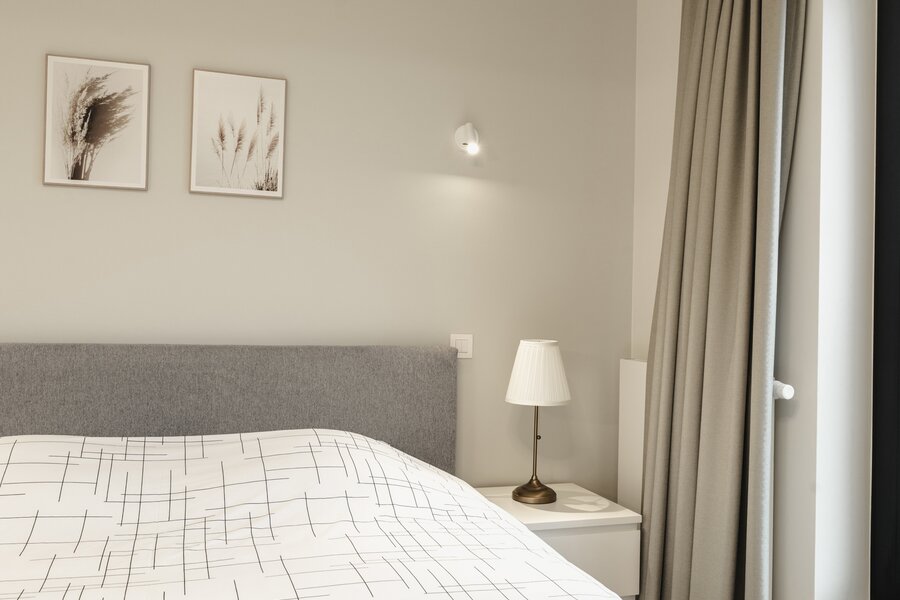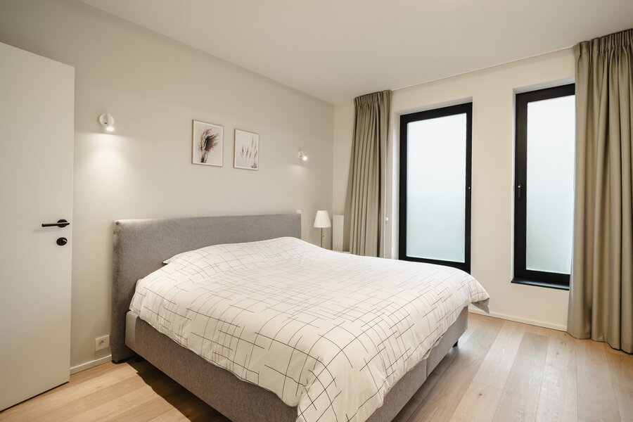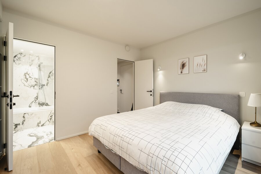 Het appartement op de tweede verdieping bestaat uit een hal met garderobe en toilet, een volledig open leefruimte met een volledig uitgeruste keuken, een eethoek en een woonkamer. De slaapkamer, met uitzicht op de tuin, beschikt over een kleedkamer en een eigen badkamer.