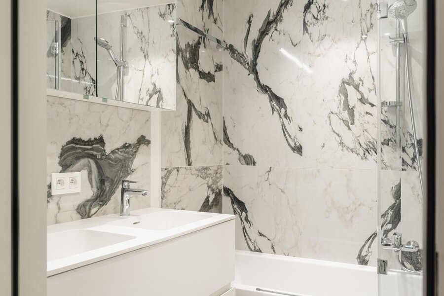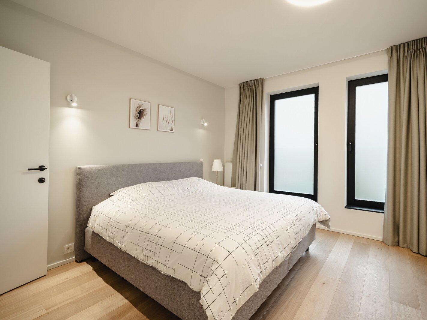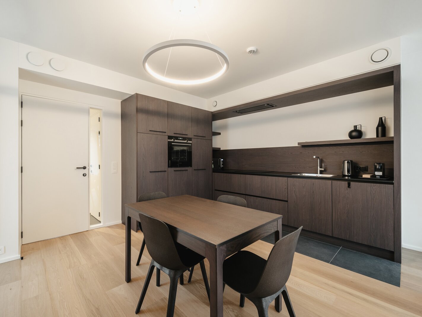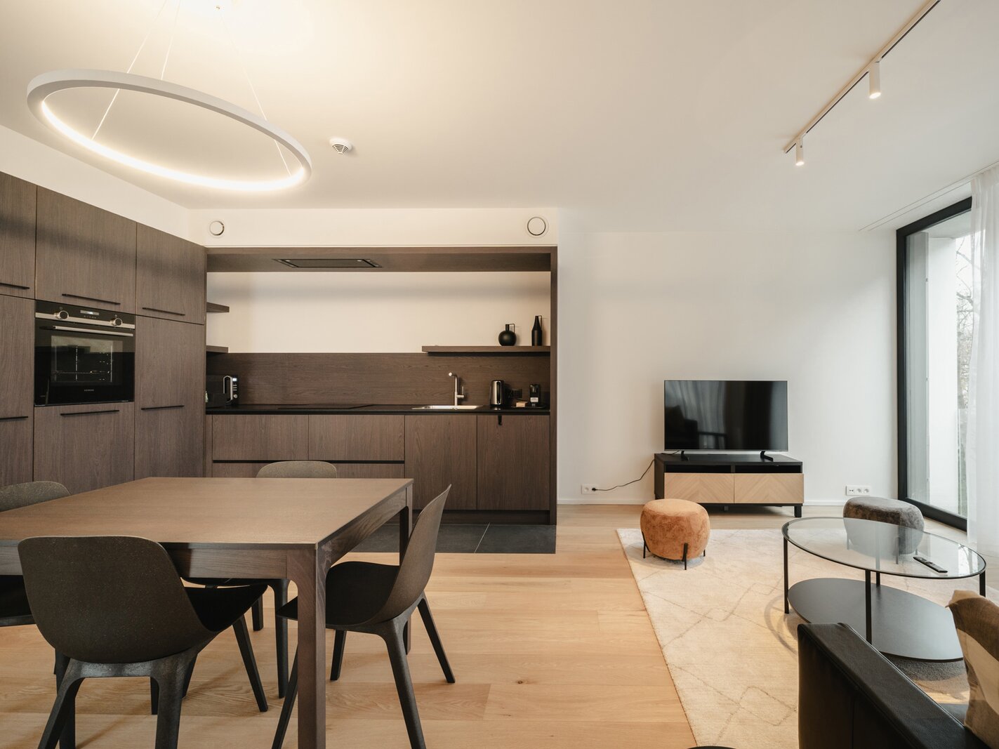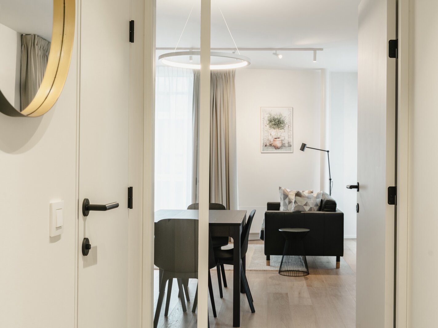 Het appartement op de tweede verdieping bestaat uit een hal met garderobe en toilet, een volledig open leefruimte met een volledig uitgeruste keuken, een eethoek en een woonkamer. De slaapkamer, met uitzicht op de tuin, beschikt over een kleedkamer en een eigen badkamer.