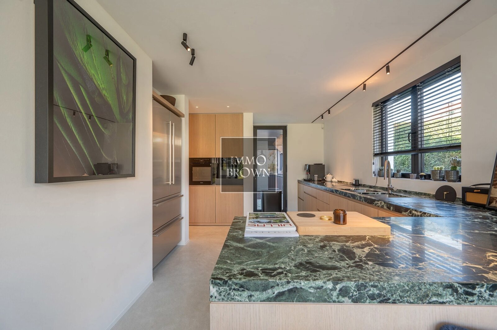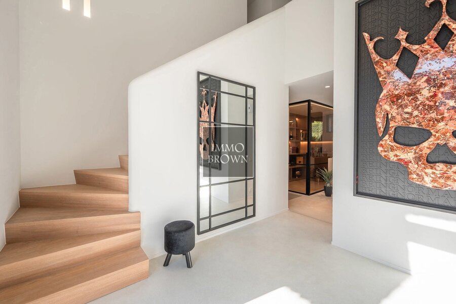 De royale, lichtrijke inkomhal verwelkomt u met een stijlvolle vestiaire, een maatwerk opbergkast, een gastentoilet en een verfijnde wijnbar. Vanuit deze centrale hal heeft u directe toegang tot de woonkamer, de praktische bijkeuken/wasplaats en de inpandige garage.