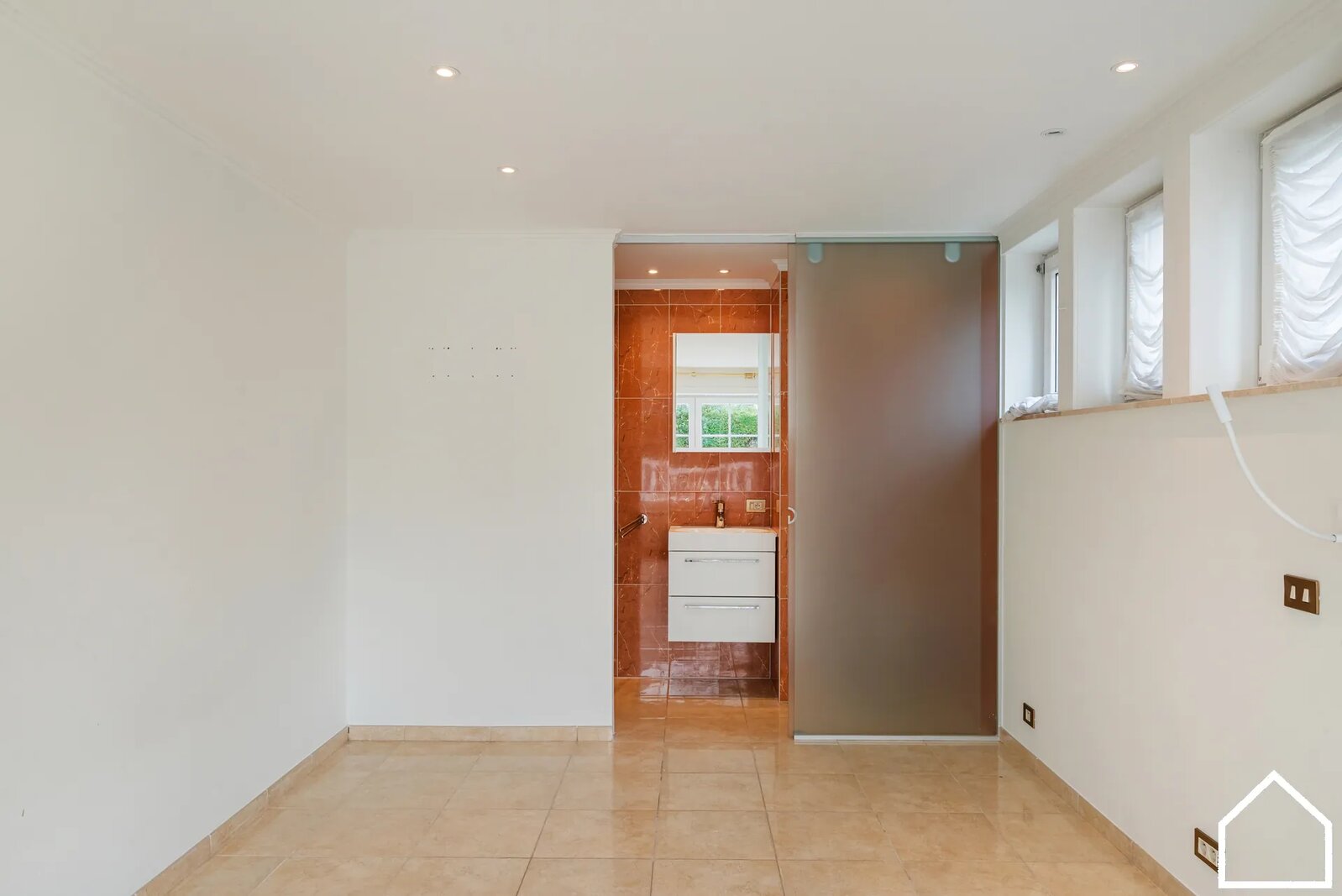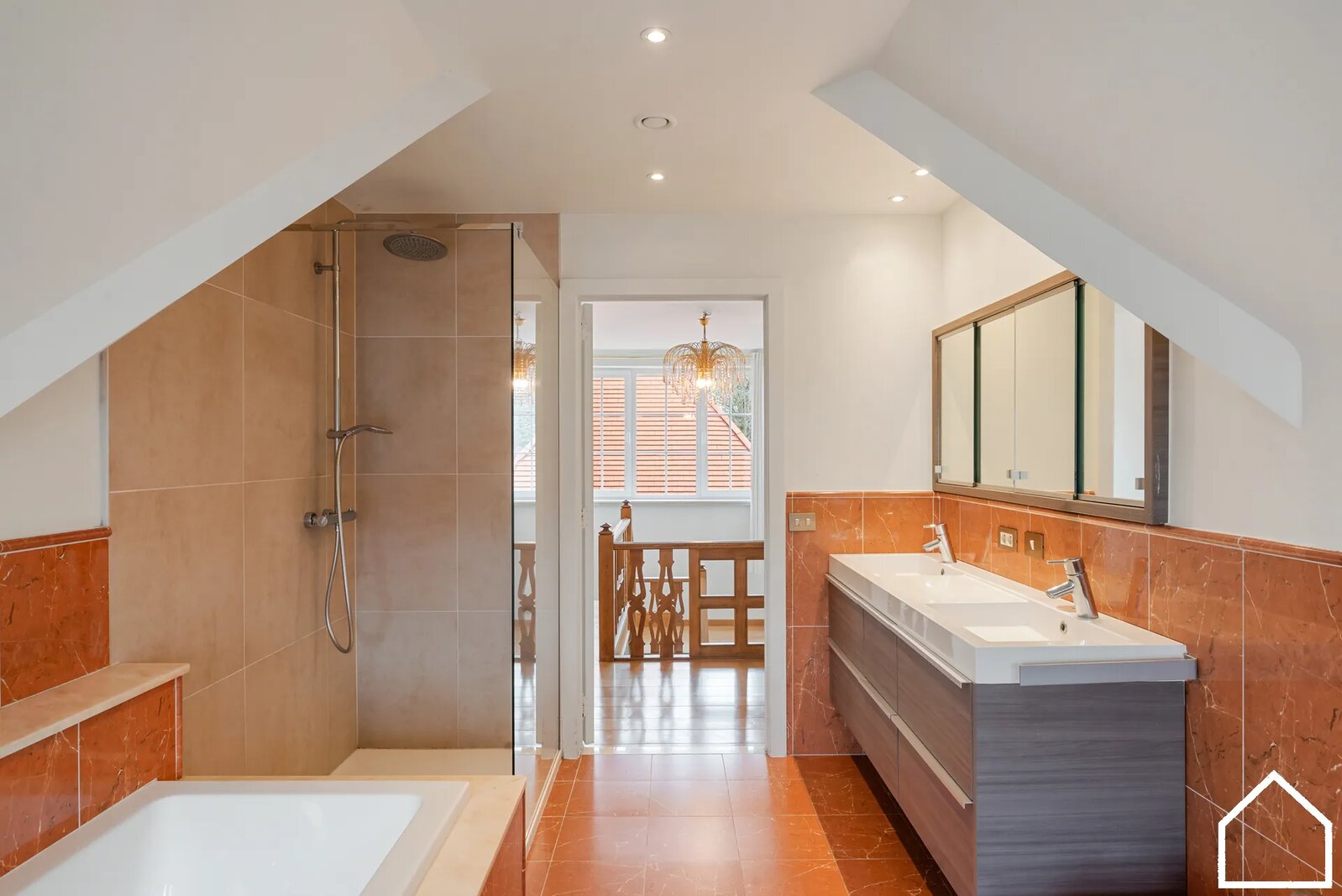 Daarnaast vindt u op het gelijkvloers een slaapkamer (11,85 m²) en een tweede ruime slaapkamer (18,65 m²) met aansluitende badkamer voorzien van douche en lavabomeubel.
