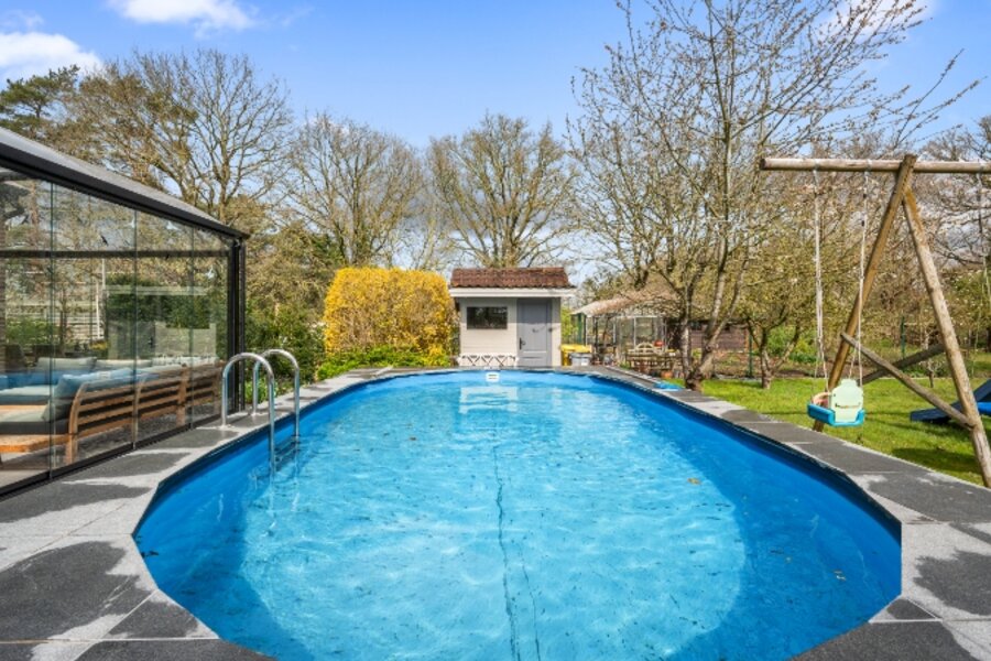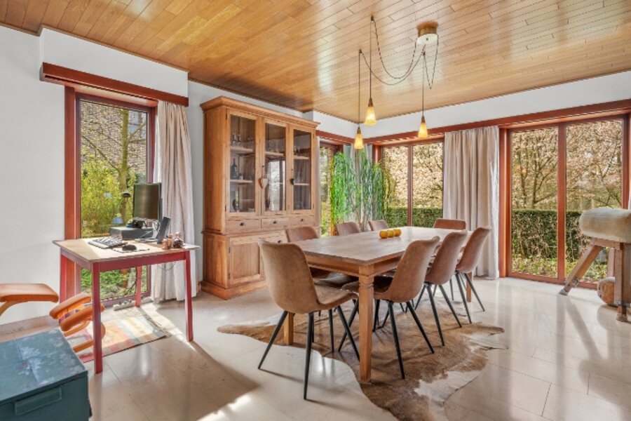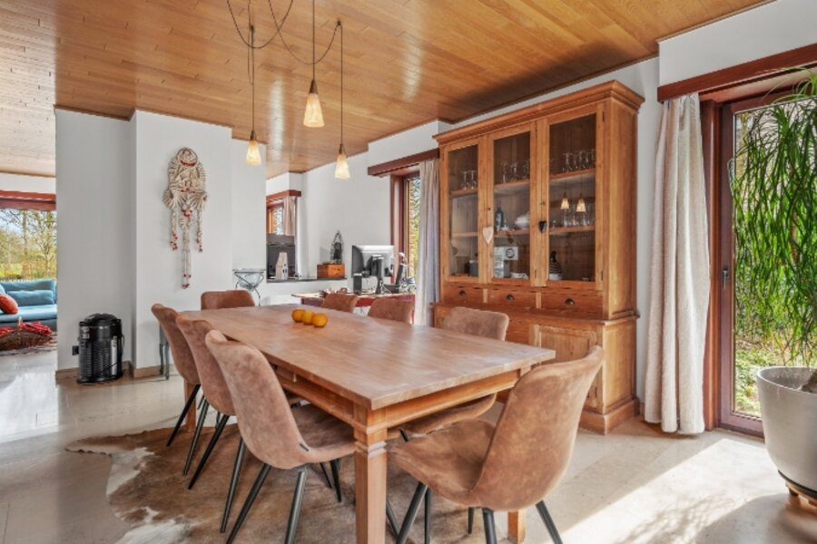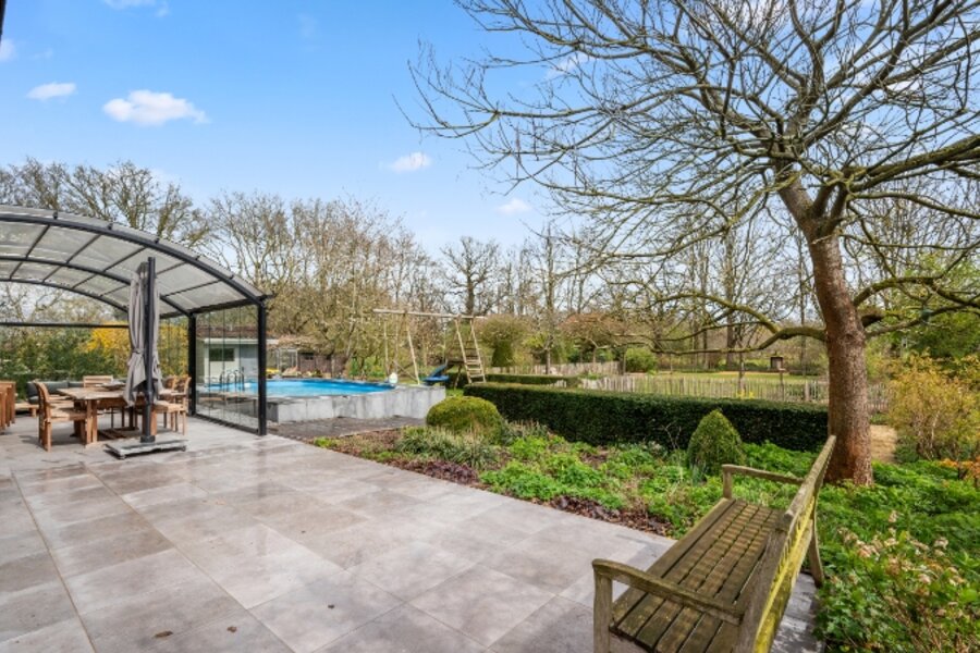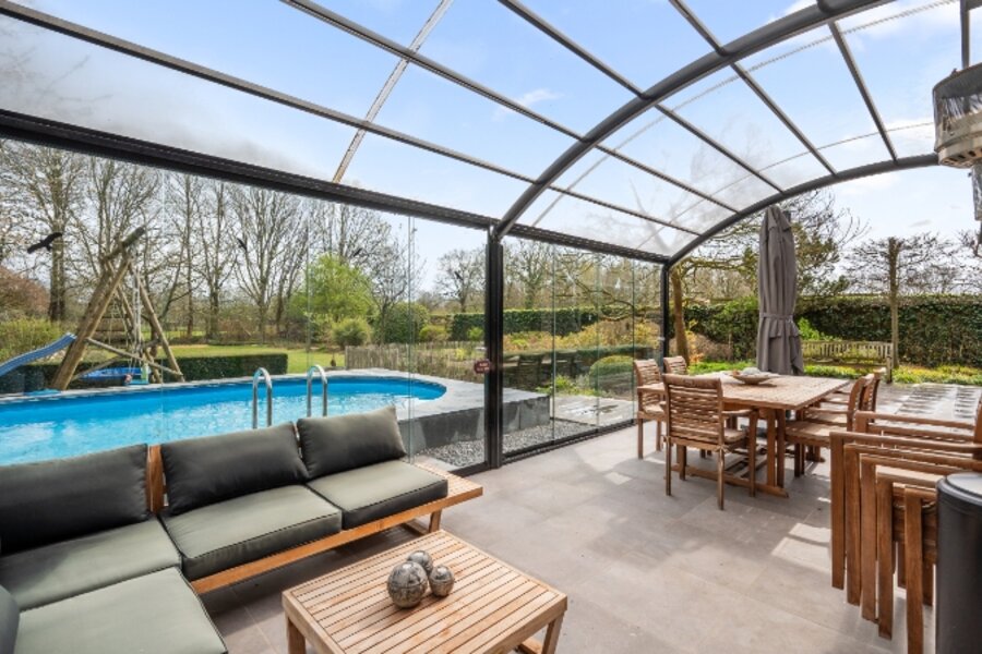 Aanpalend aan de woning is er een ruime terras dat deels overkapt is en met glazen schuifwanden en uitgeeft op het verwarmd openluchtzwembad.