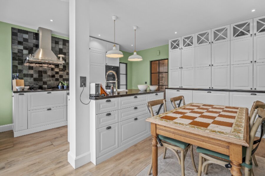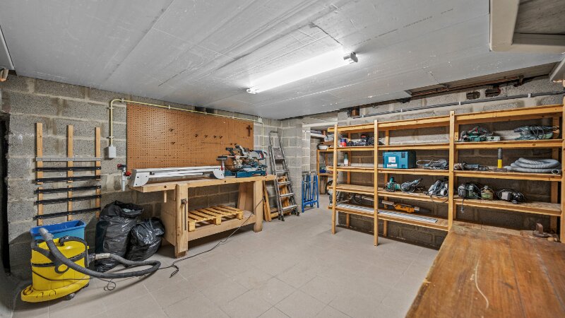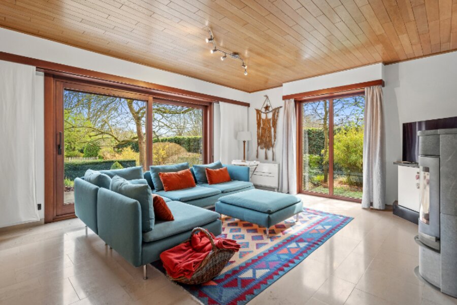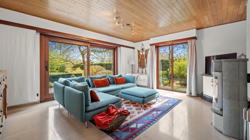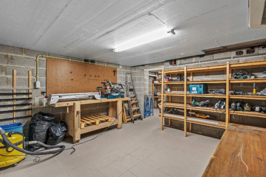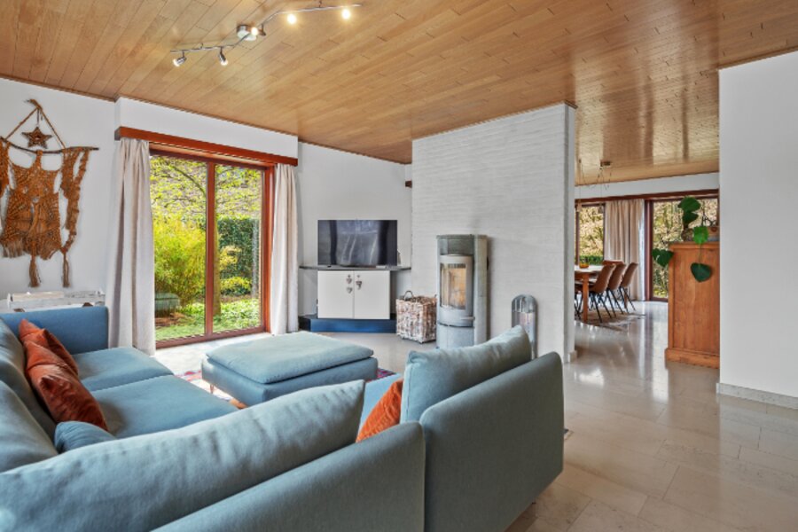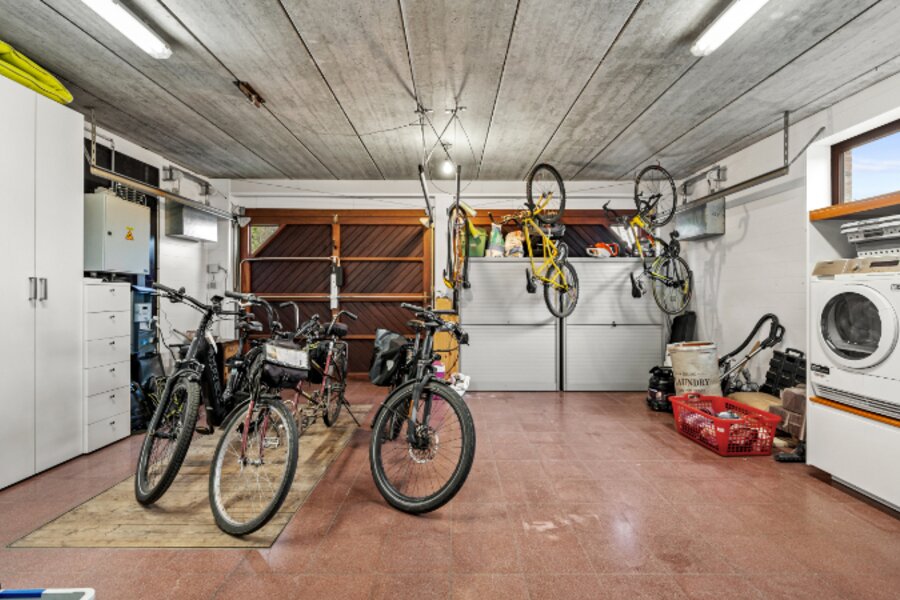 Verder omvat de villa op het gelijkvloers: inkomhal, wc, living van 51m² met speksteenkachel, volledig nieuwe (2021) ingerichte keuken (22m²) met eethoek, dubbele garage, slaapkamer (13m²) en douchekamer (nieuw van 2022 met inloopdouche en dubbele lavabo).