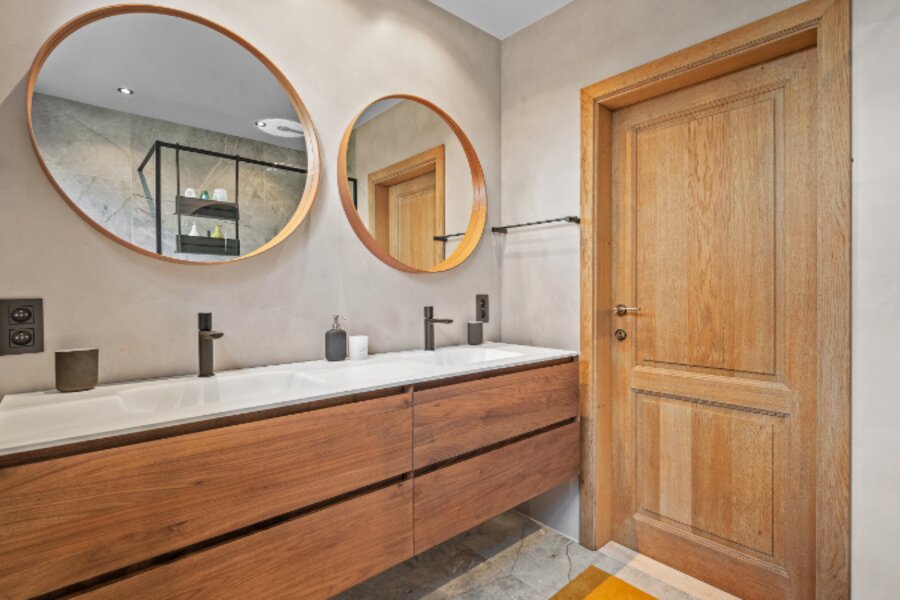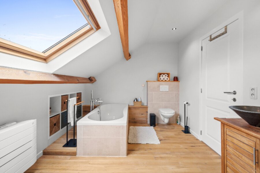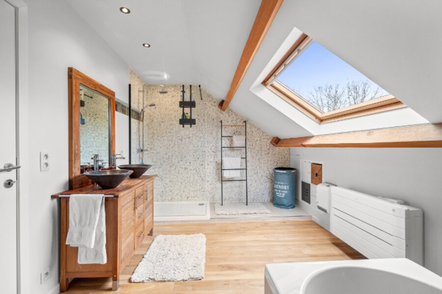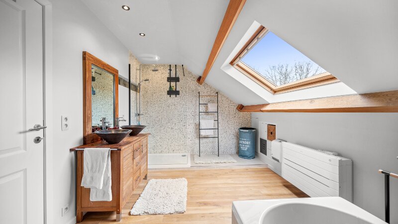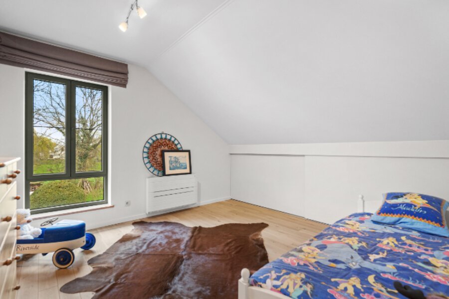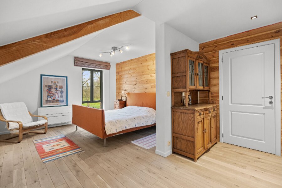 Op de verdieping: 3 ruime slaapkamers (37m² met infrarood saunacabine, 23m² met ingemaakte kasten en 14m²), nachthal met bureelhoek en badkamer met ligbad, wc, inloopdouche en dubbele lavabo (2018).