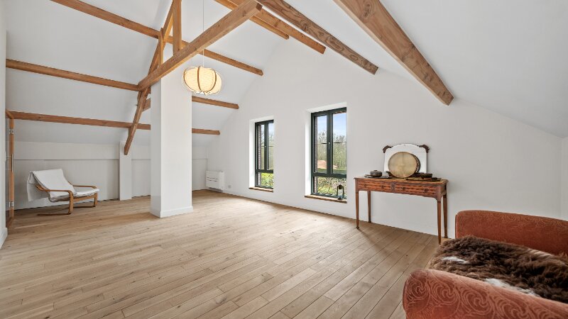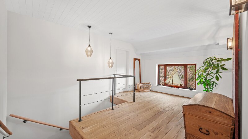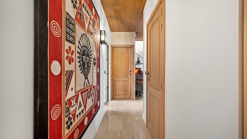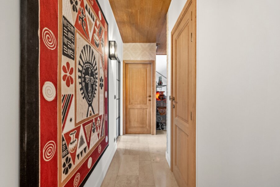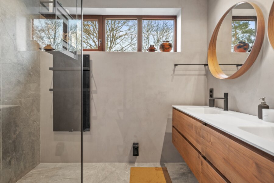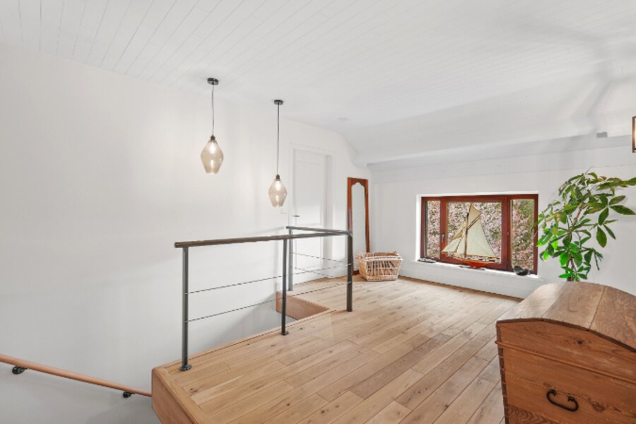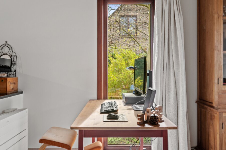 Op de verdieping: 3 ruime slaapkamers (37m² met infrarood saunacabine, 23m² met ingemaakte kasten en 14m²), nachthal met bureelhoek en badkamer met ligbad, wc, inloopdouche en dubbele lavabo (2018).