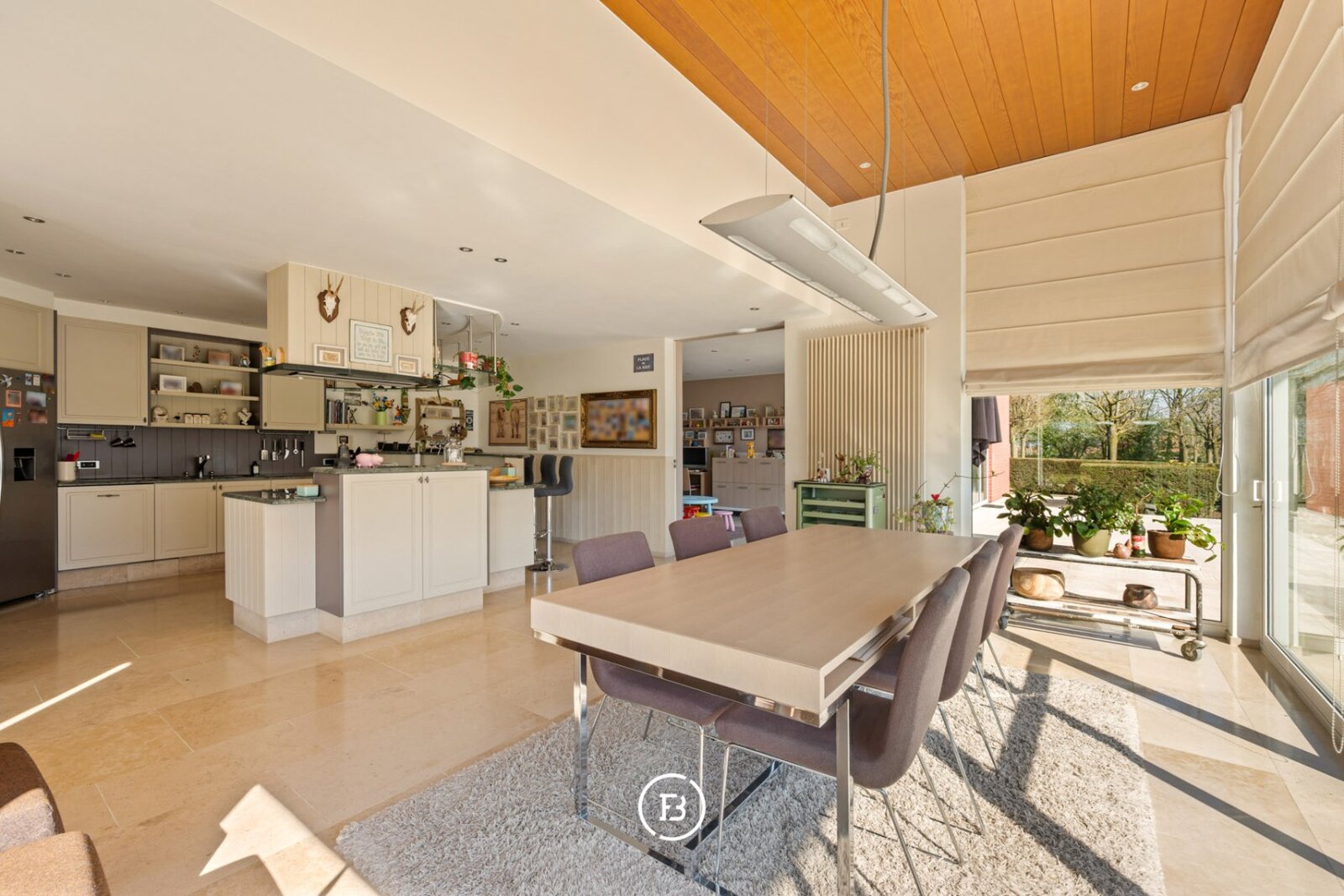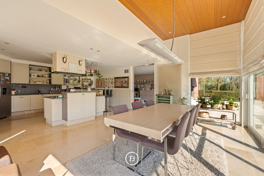 De keuken is praktisch ingericht en uitgerust met alle nodige comfort, met aansluitend extra ruimtes die flexibel ingevuld kunnen worden als bureau, speelkamer of hobbyruimte. Dit maakt de woning bijzonder geschikt voor gezinnen of voor wie wonen en werken wenst te combineren.