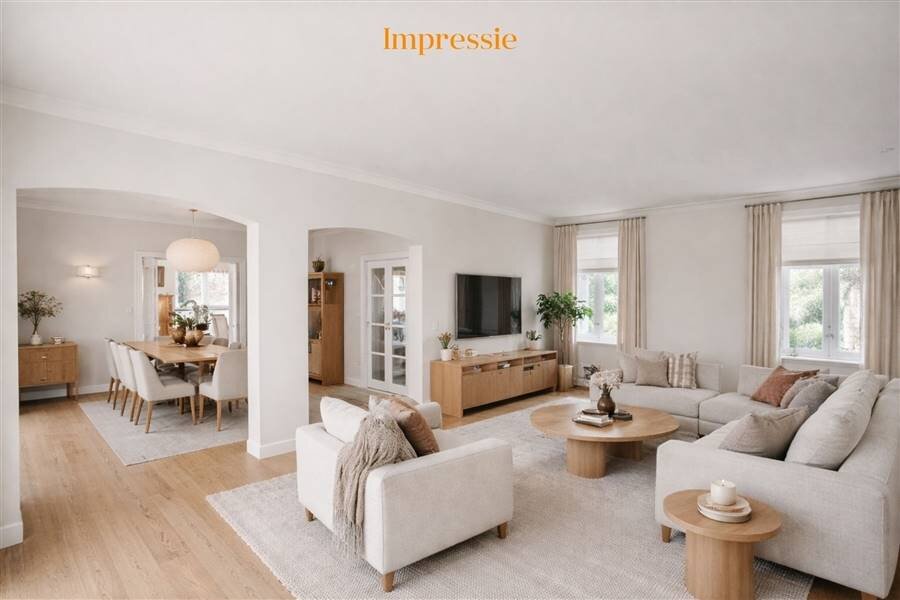 Via de inkomhal toegang tot de leefruimte dewelke is opgedeeld in 3 delen waarvan een formele woonkamer met open haard, centraal de eetruimte en vervolgens de informele woonkamer met aansluitend de open keuken met ontbijthoek.