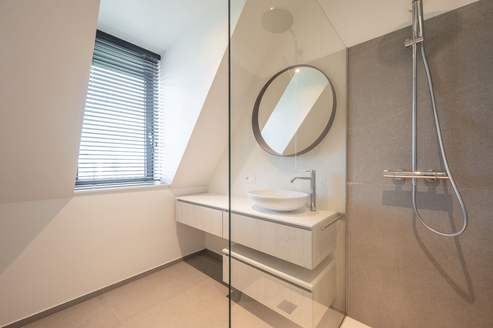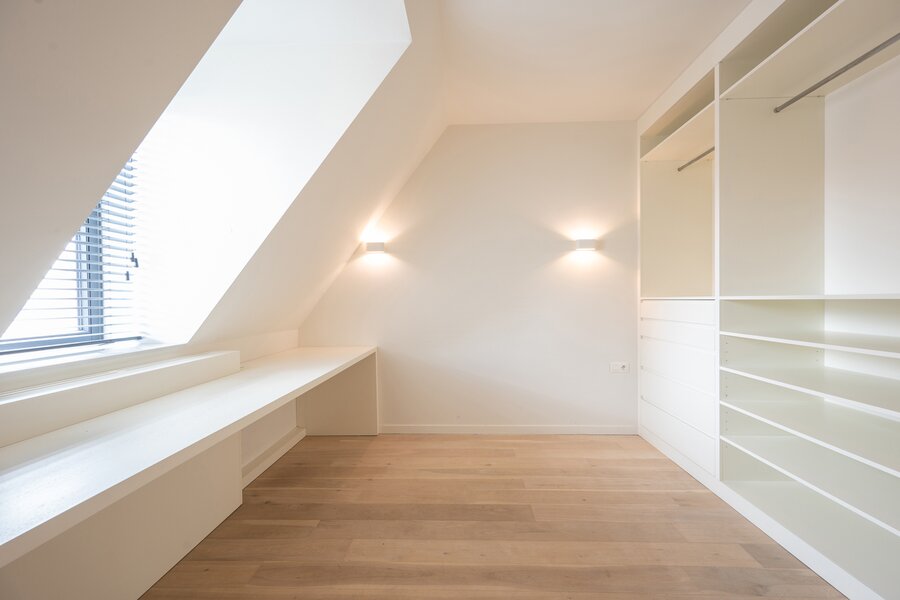 De nachthal geeft toegang tot twee comfortabele slaapkamers, waaronder een master suite met dressing en bureauruimte. De badkamer is luxueus afgewerkt en voorzien van een ruime inloopdouche. Beide slaapkamers bevinden zich op hetzelfde niveau, wat bijdraagt aan een praktische en aangename indeling.
