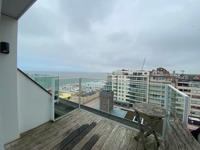 Genieten op jouw terras van een heerlijk ontbijt met als decor een schitterende zonsopgang en een magnifiek zeezicht? Het kan zomaar in dit exclusieve penthouse. Gelegen op de achtste en negende verdieping biedt het terras aan de voorzijde zowel een zalig uitzicht op Knokke-strand en het Zwin, alsook een prachtige view over de daken van de stad. Wil je liever aperitieven in de avondzon dan kan dit op het terras aan de achterzijde, waar je uitkijkt op de zee aan de westkant.