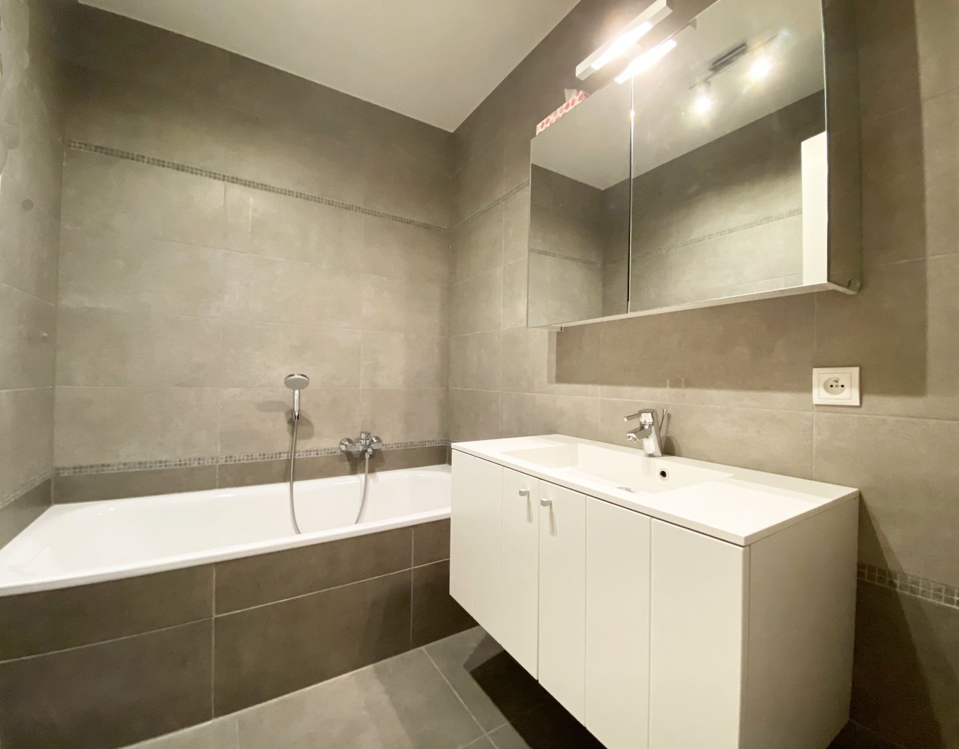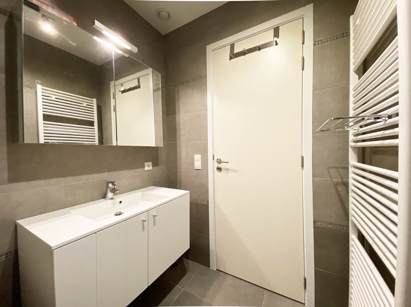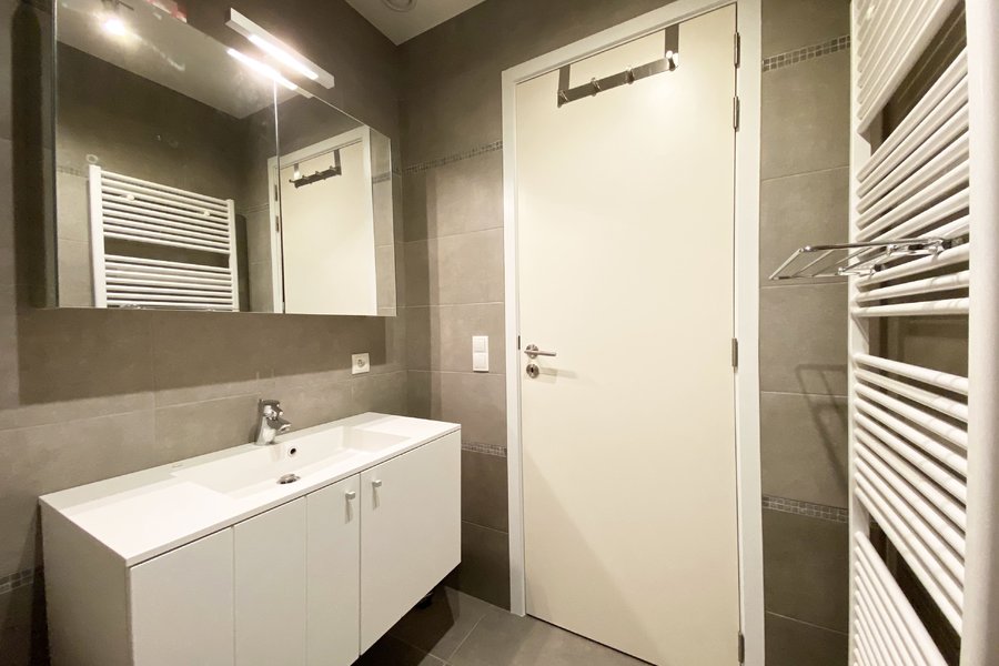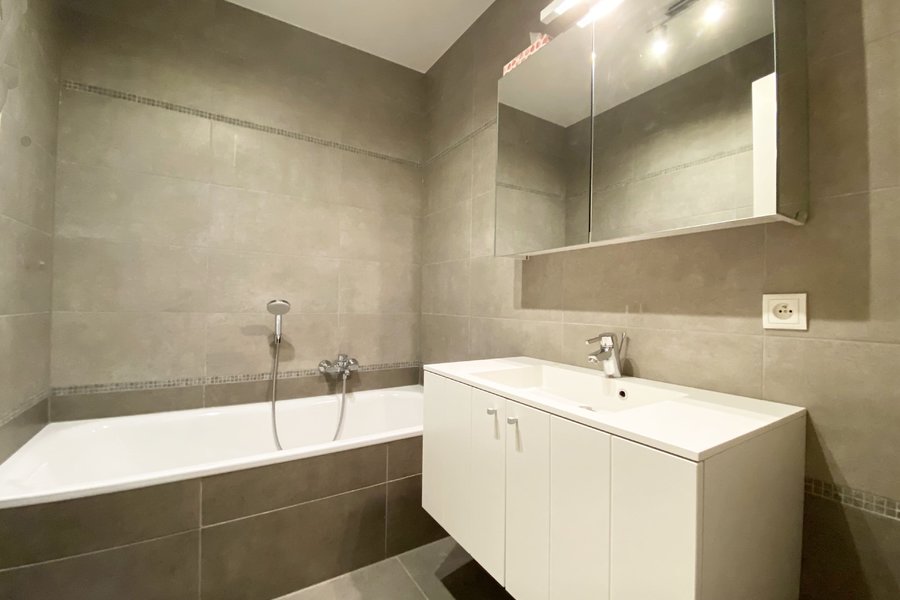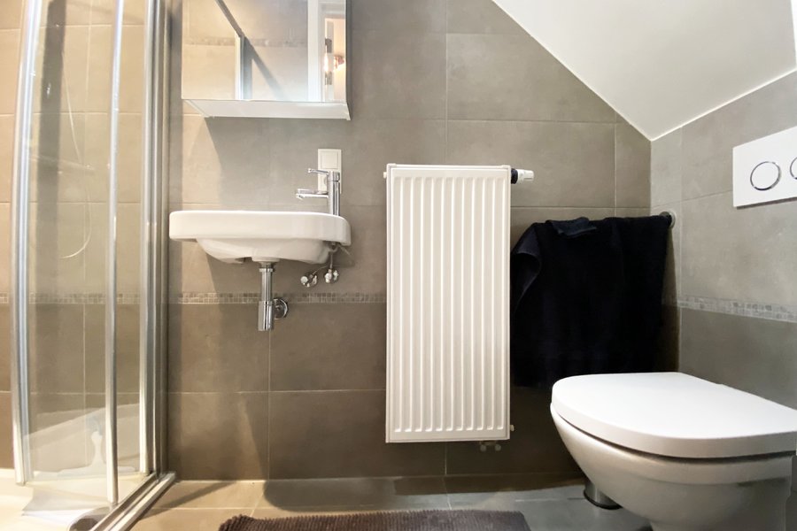 Dit duplex-appartement is voorzien van twee badkamers. Een kleinere op de benedenverdieping, uitgerust met toilet en douche en nog eentje op de bovenverdieping waar een ligbad aanwezig is.