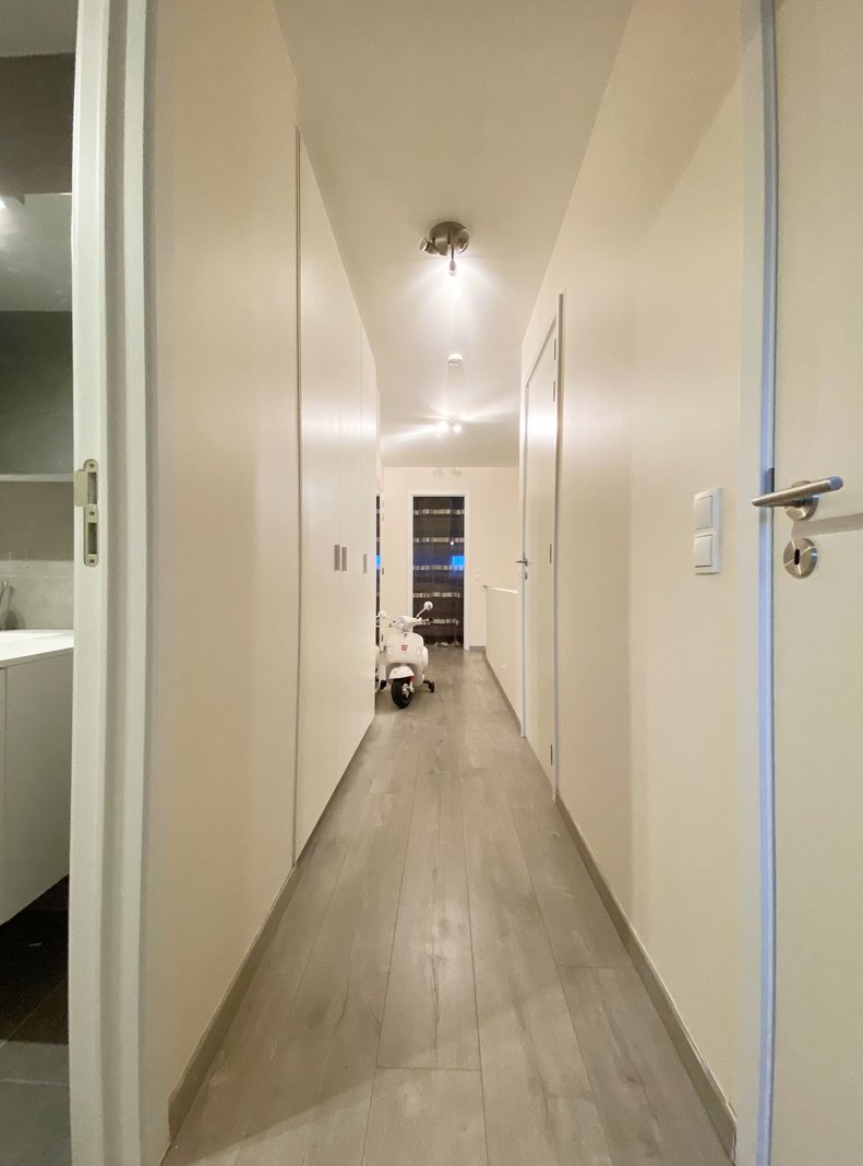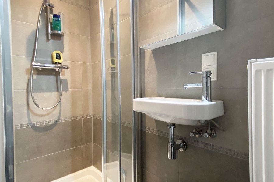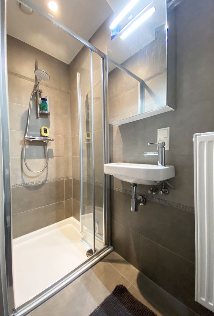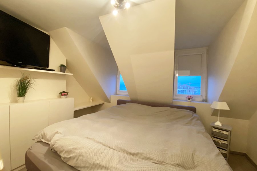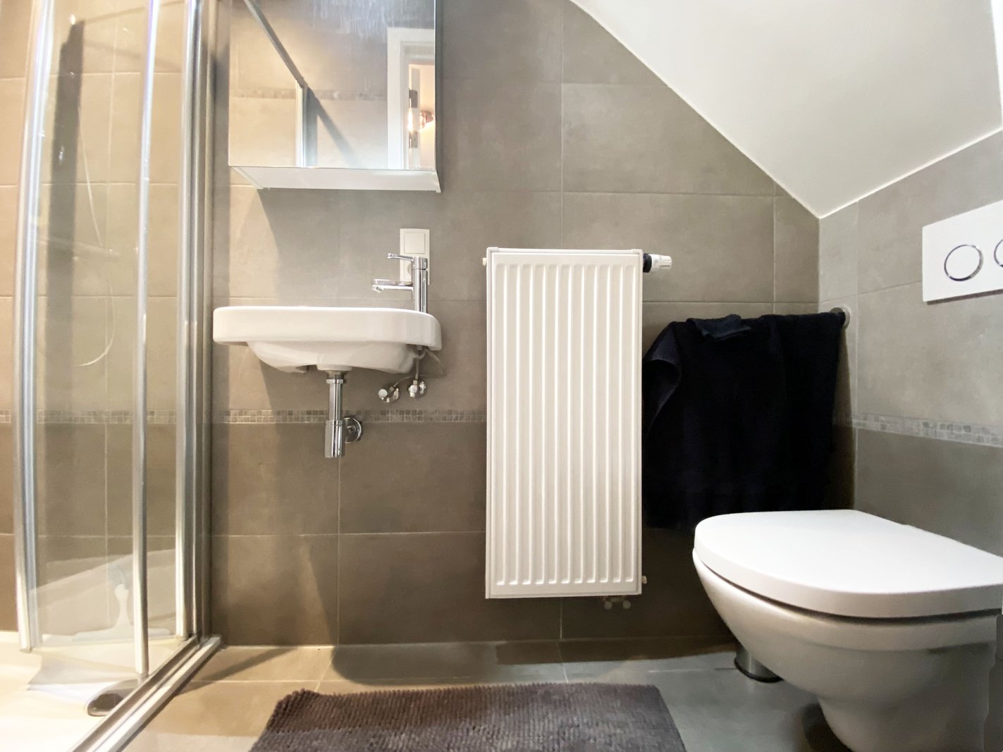 Dit duplex-appartement is voorzien van twee badkamers. Een kleinere op de benedenverdieping, uitgerust met toilet en douche en nog eentje op de bovenverdieping waar een ligbad aanwezig is.
