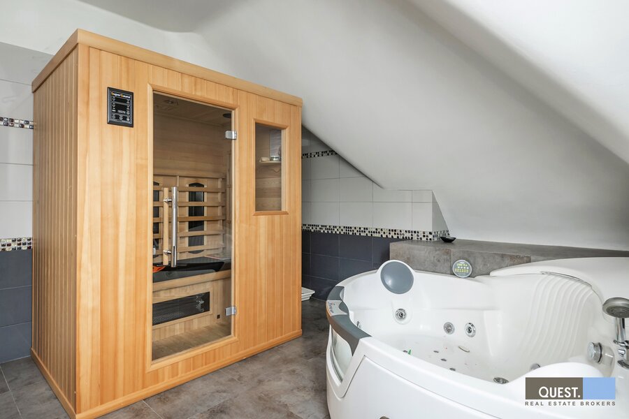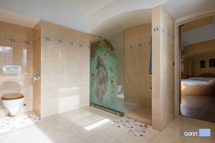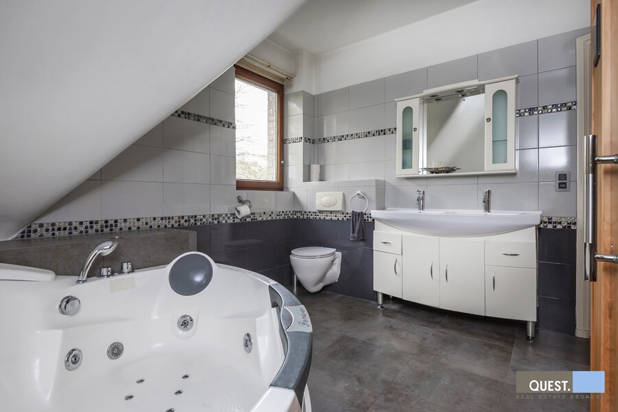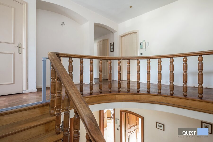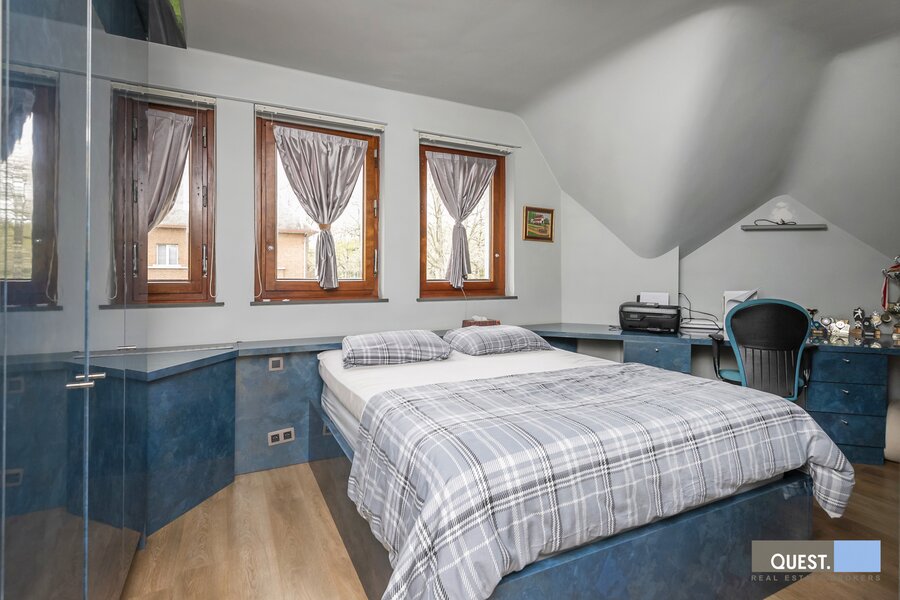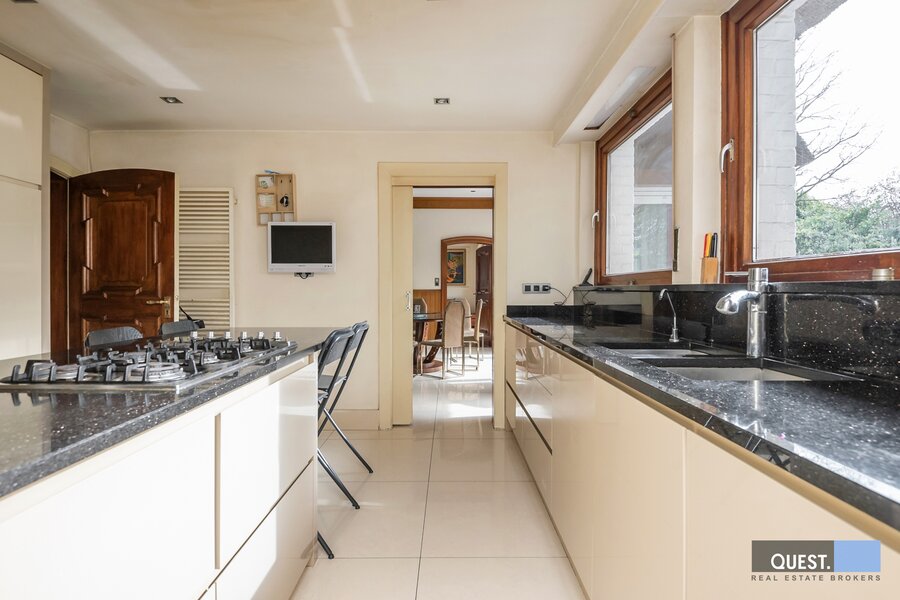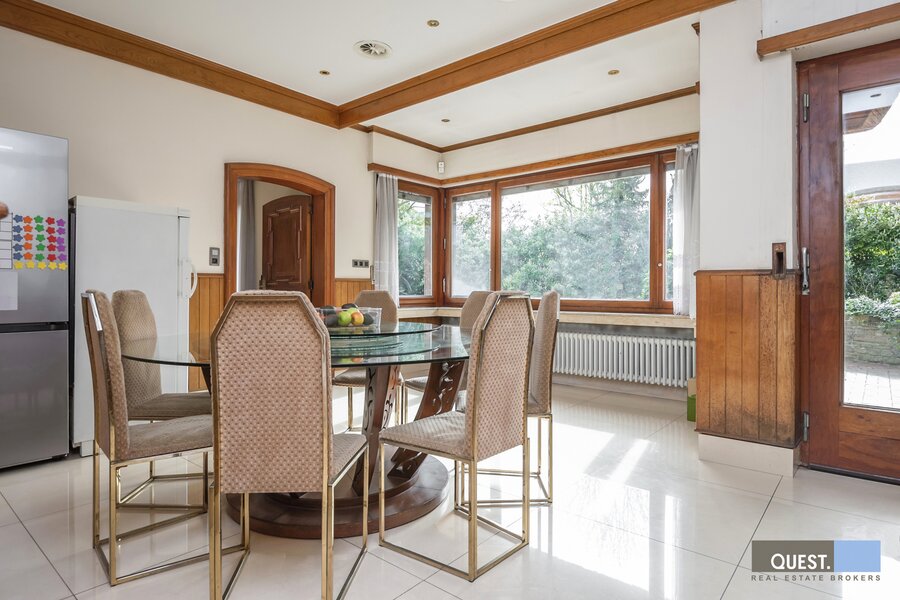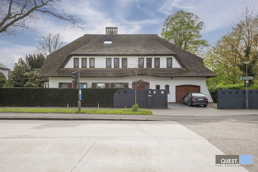 Karaktervolle villa onder rieten kap gelegen op een gunstige locatie nabij de prachtige Parken en alle faciliteiten. Bouwjaar 1959, kwalitatieve en ruime constructie op een ZW-georiënteerd grondperceel van 33m breedte. Riante ontvangsten op authentieke en hoogwaardige materialen, die uitgeven op een groot terras en aangename ZW-tuin zonder inkijk. Vernieuwde eetkeuken met bijkeuken en diensttoegang. Op de verdieping ruime circulatie naar vijf slaapkamers waarvan drie met aansluitende badkamer en twee extra douchekamers. Grote polyvalente zolder met toegang via permanente trap op de bovenverdieping (op betonstructuur). Zeer ruime kelders en inpandige garage. Zeldzaam!